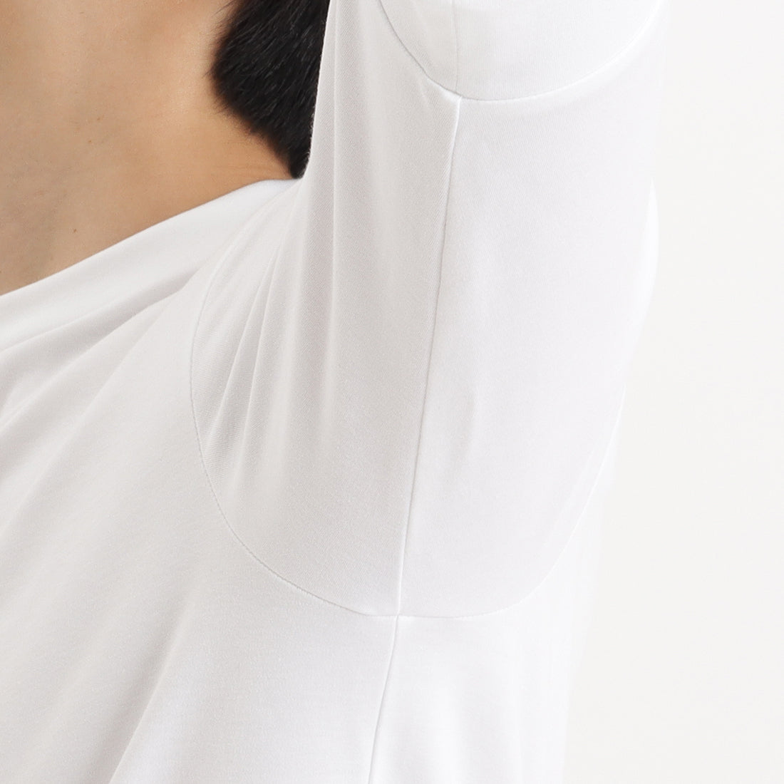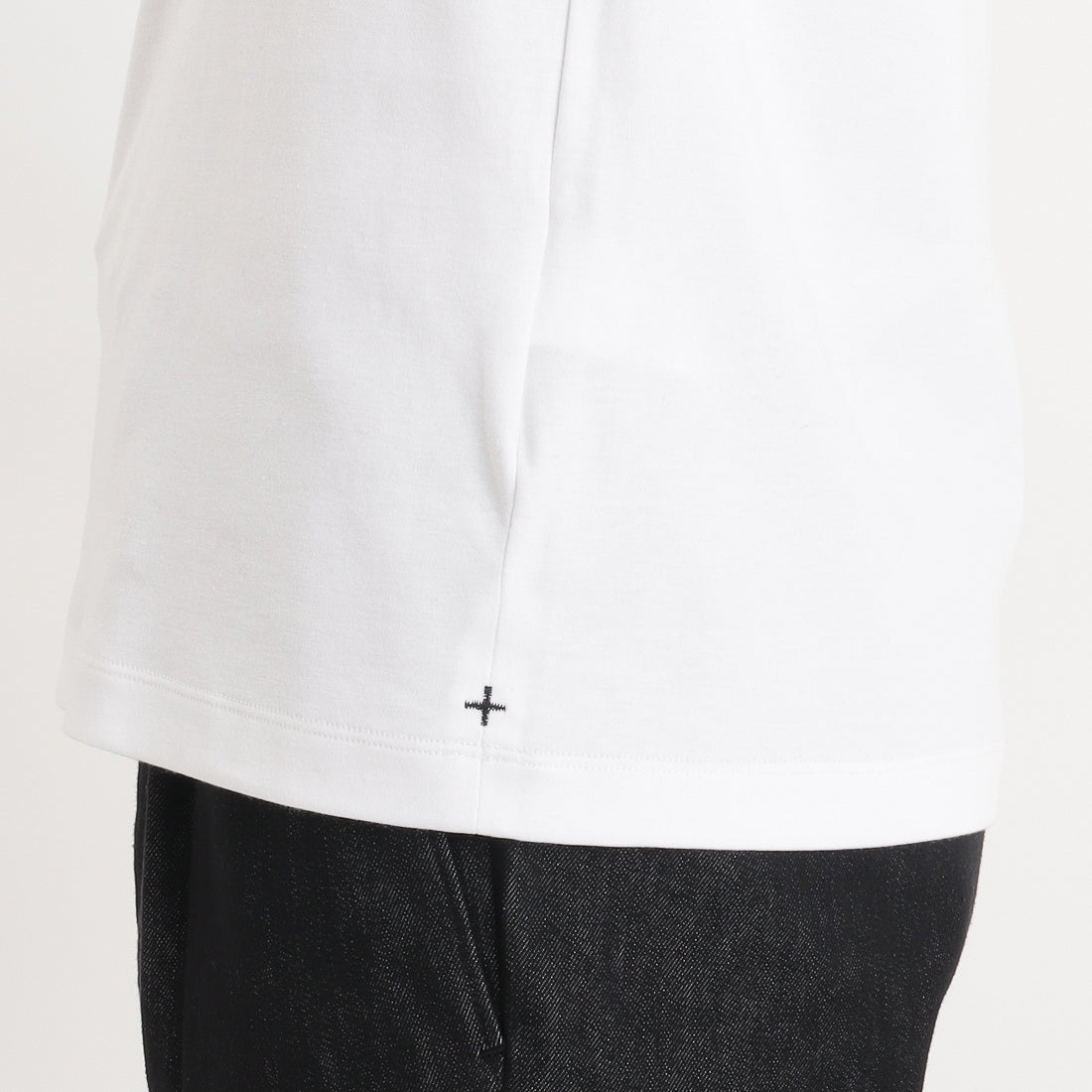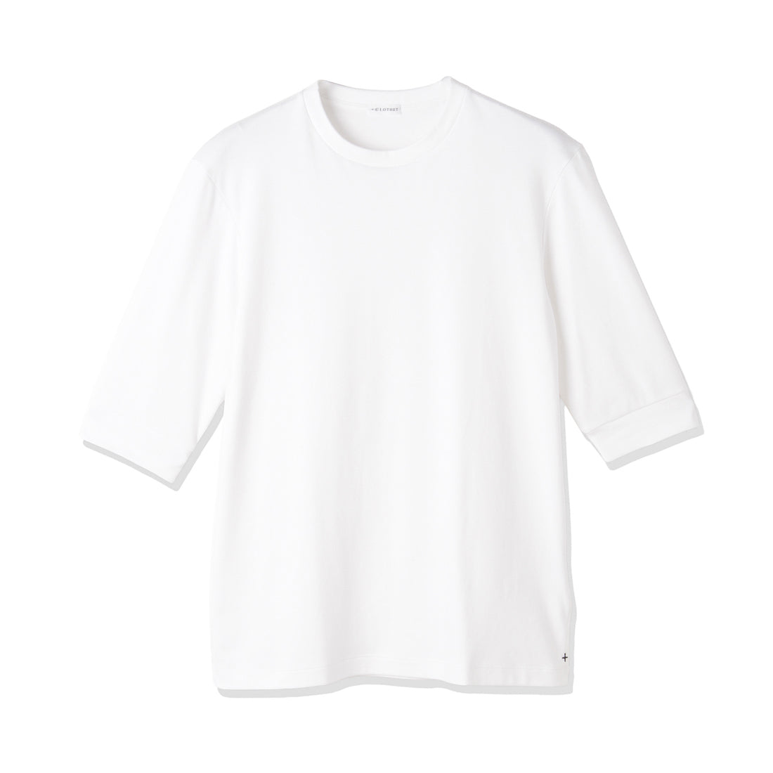 袖は長くしながらも袖自体は細くしたことで、カジュアルな雰囲気が抑えられています。またハーフスリーブ丈は袖をまくった時のような、こなれ感を演出することができます。定番のTシャツと同様に、襟の強度を高めたことで、着用や洗濯でもよれにくくなっています。身頃やアームホールの調整を行ったことで、今まで以上に可動域が広がり、腕が動かしやすくなっています。左脇には+CLOTHETであることを示す+マークが配色で入っています。