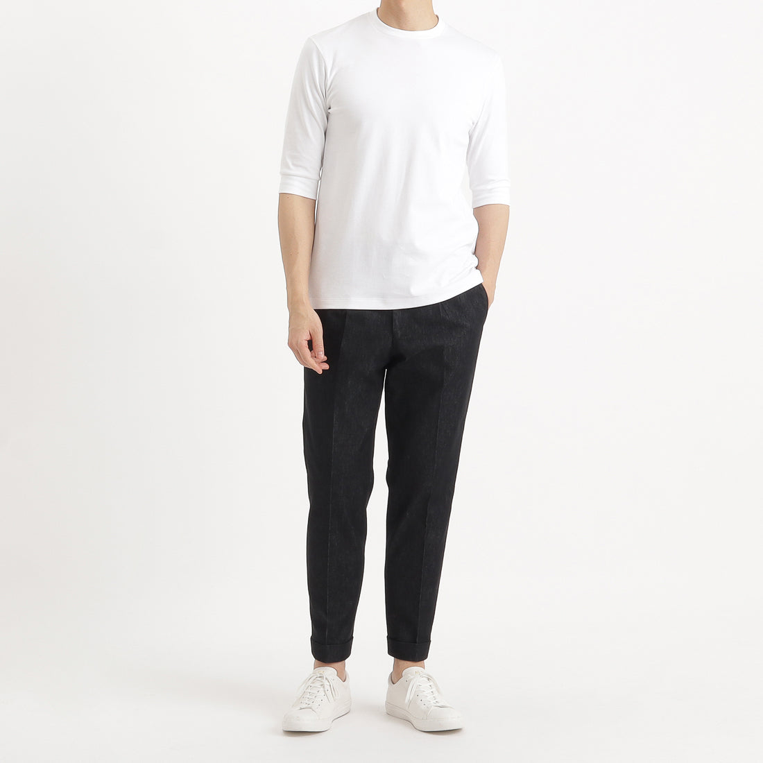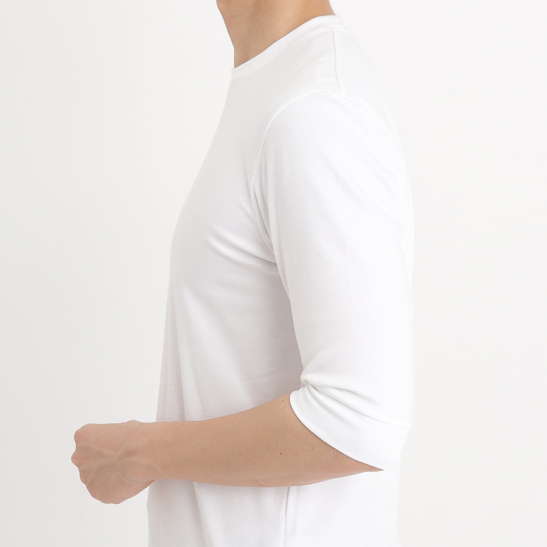 かつて限定生産で登場、瞬く間に完売したハーフスリーブが、スビンプラチナムシリーズに新たにラインナップされることになりました。ドレスライクで品のある雰囲気ながら、袖を捲り上げた時のようなこなれ感を演出することができる1枚です。