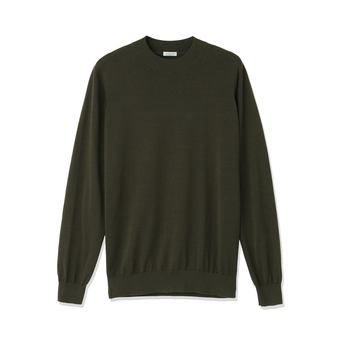 モックネックのポイントである首元がへたらないように編地の詰め具合を調整。衿の高さにもこだわることでエレガントな表情に仕上がっています。また首が長く見えることで小顔に見える視覚的効果もあります。左裾には+CLOTHETであることを示す+マークが入っています。