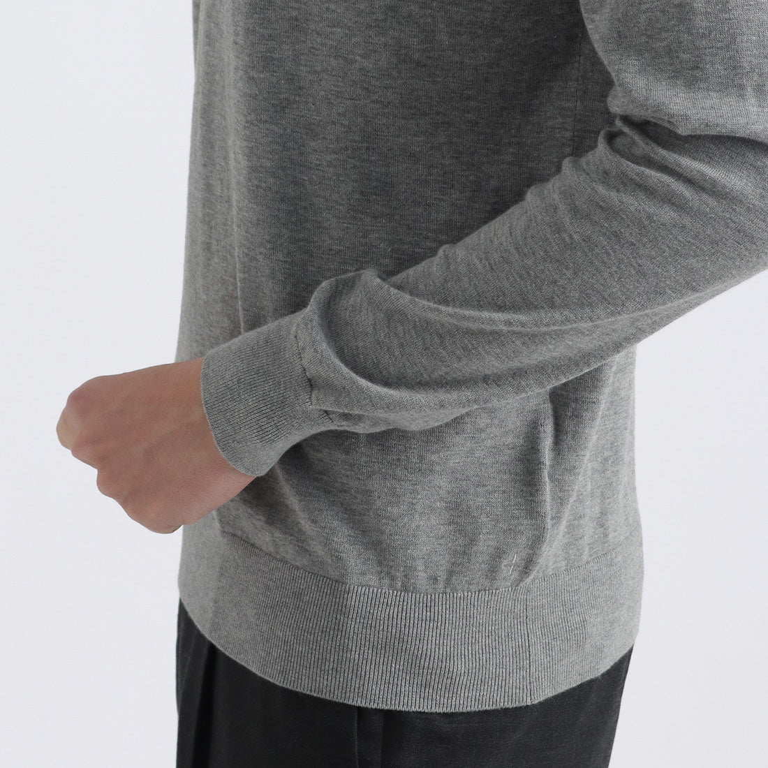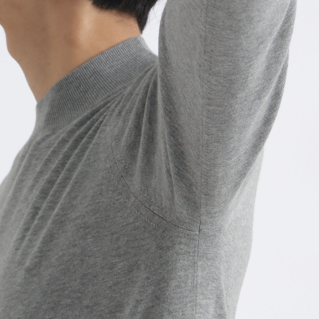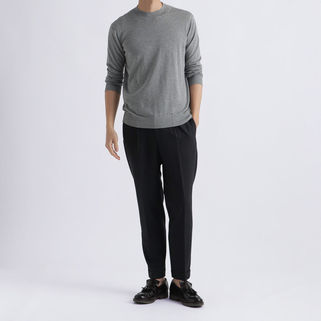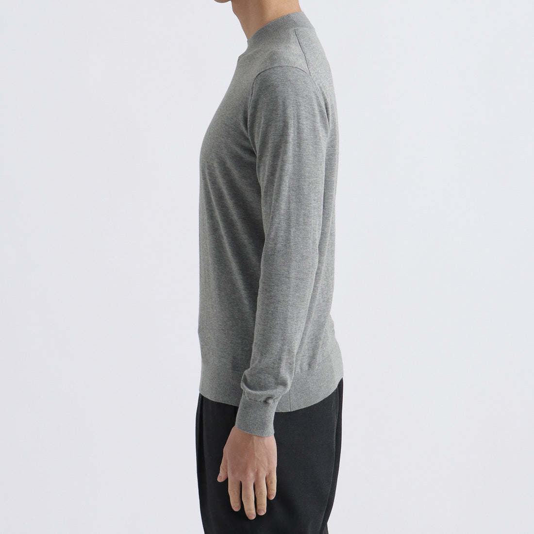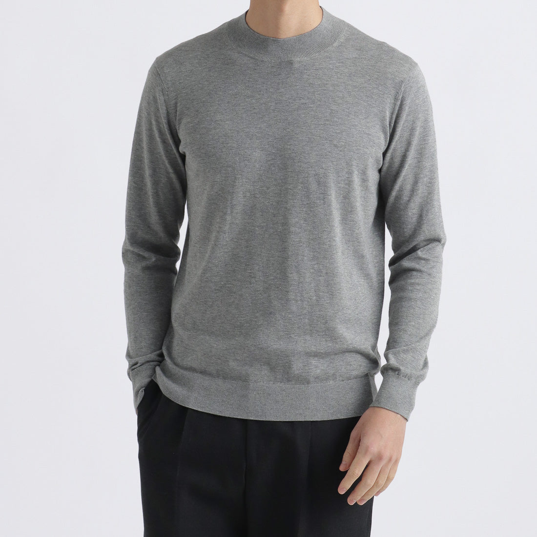 ファーストピック(初摘み)ではないスビン原料を使った深みのあるメランジ感が特長のモックネックニットです。シンプルでベーシックなデザインはオンオフ問わずにスタイリングしやすくジャケット、シャツとの相性ももちろん、カジュアルなスタイルとも好相性です。