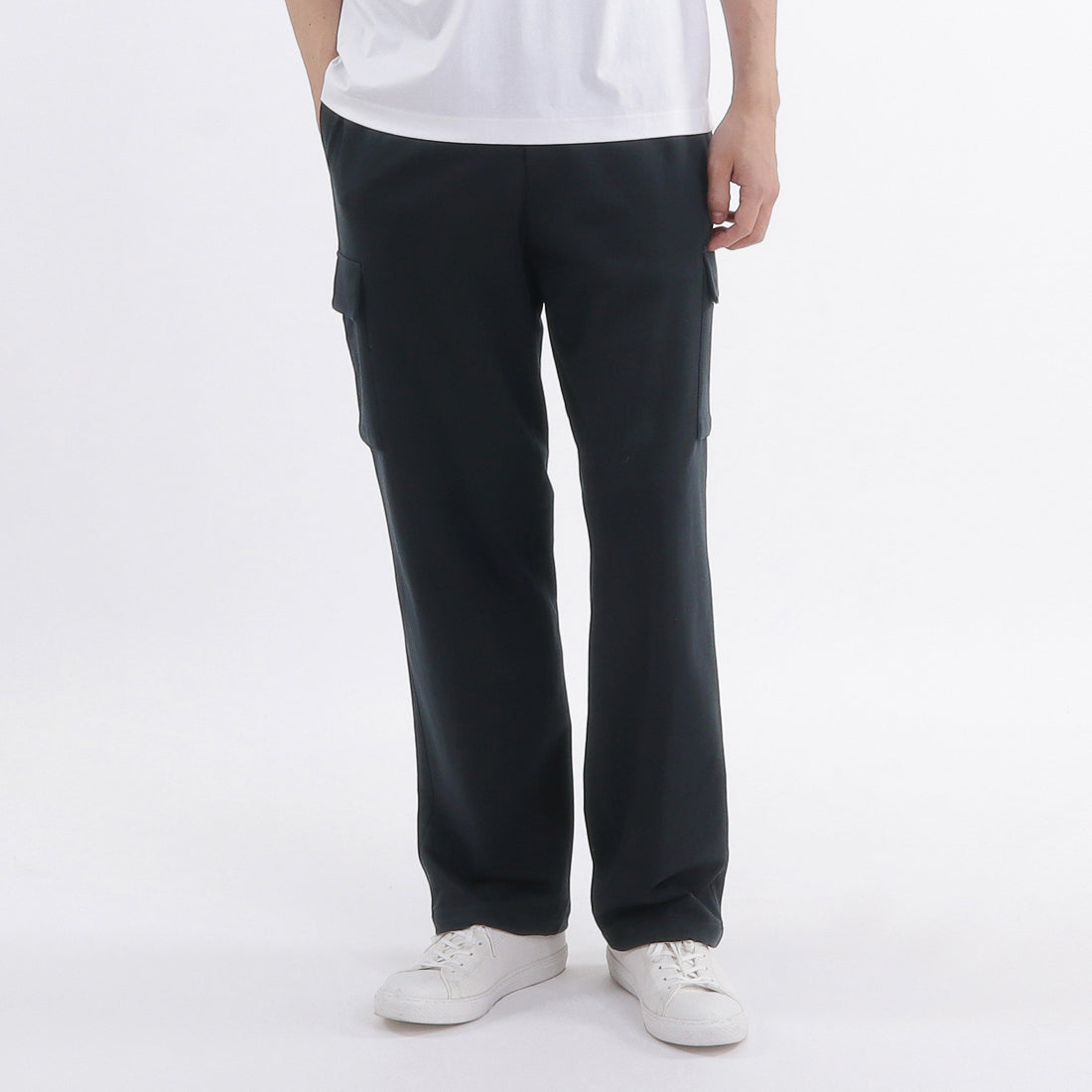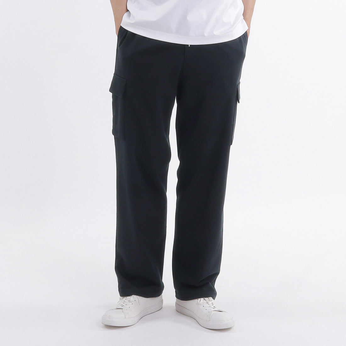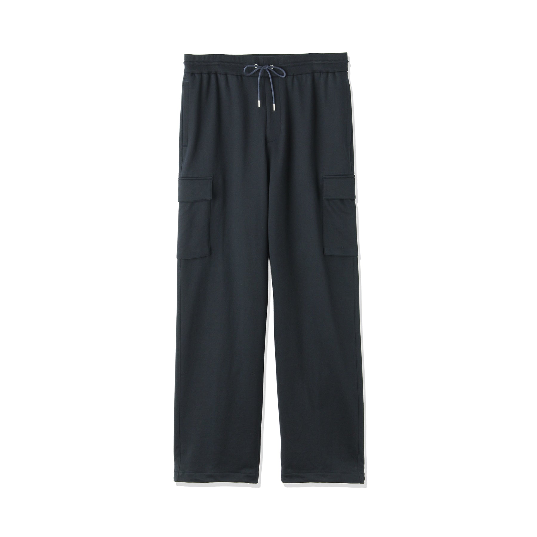 見た目にはスッキリさせながらもポケットの底にだけマチを配置することでカーゴポケットの収納力をアップしています。裾にスピンドルを通しているので好みに調整して絞ることができます。シルエットはゆるくテーパードの効いたワイドシルエットになっています。同素材で展開しているスウェットシャツやフーディーとセットアップで着ることもできます。