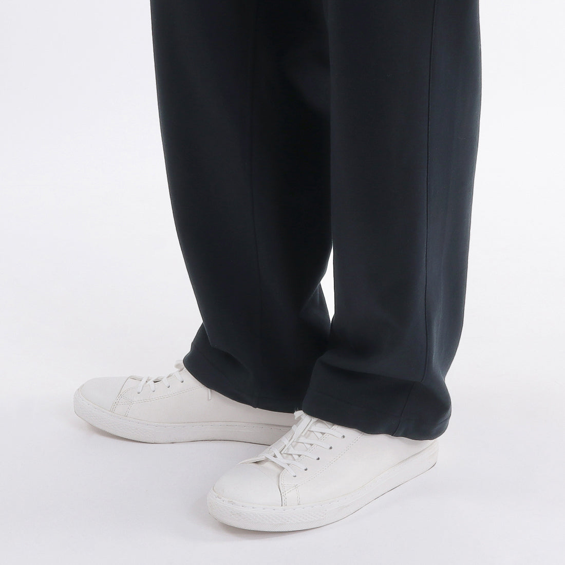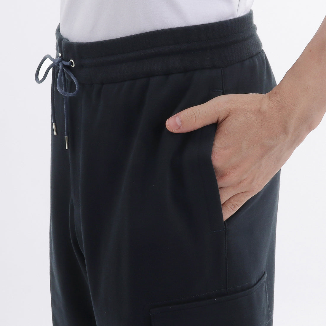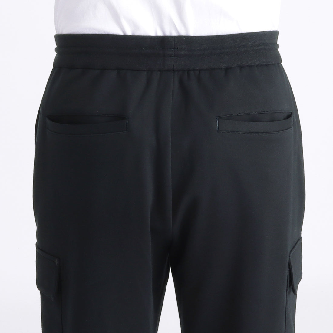 見た目にはスッキリさせながらもポケットの底にだけマチを配置することでカーゴポケットの収納力をアップしています。裾にスピンドルを通しているので好みに調整して絞ることができます。シルエットはゆるくテーパードの効いたワイドシルエットになっています。同素材で展開しているスウェットシャツやフーディーとセットアップで着ることもできます。