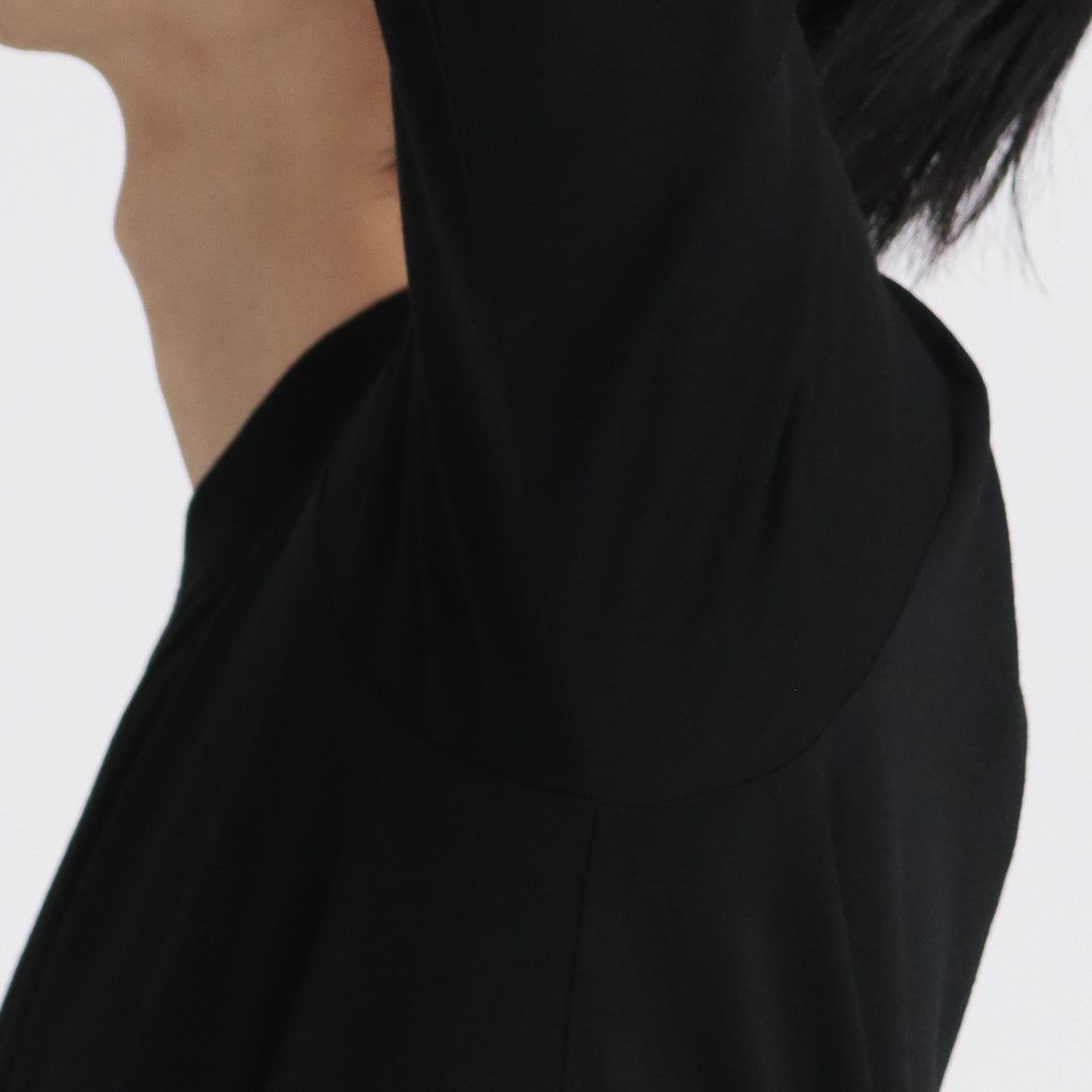 同素材のロングスリーブTシャツと同じようにサイズは変えずに前身頃は狭く、後身頃を広くして全体のバランスを調整。また前後身頃のバランスを変えたことに関連してアームホールの形状も調整。今まで以上に可動域が広がったため腕が動かしやすくなりました。従来では後肩にイセと言われるテーラードの手法を取り入れていましたが今回は後肩に対して前肩を伸ばすという手法を採用。これにより肩と首の間が体と綺麗に沿うようになっています。