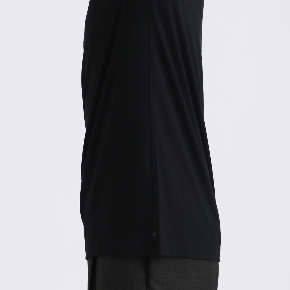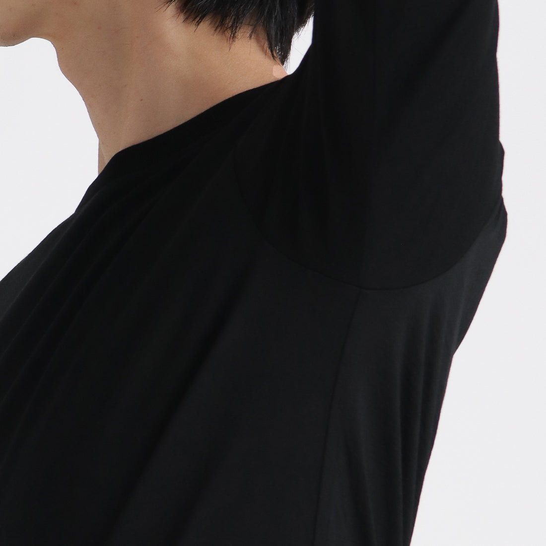 スビンプラチナムのロングスリーブTシャツと同じようにサイズは変えずに前身頃は狭く、後身頃を広くして全体のバランスを調整。また前後身頃のバランスを変えたことに関連してアームホールの形状も調整。今まで以上に可動域が広がったため腕が動かしやすくなりました。従来では後肩にイセと言われるテーラードの手法を取り入れていましたが今回は後肩に対して前肩を伸ばすという手法を採用。これにより肩と首の間が体と綺麗に沿うようになっています。左脇スリットには+CLOTHETであることを示す+マークが配色で入っています。