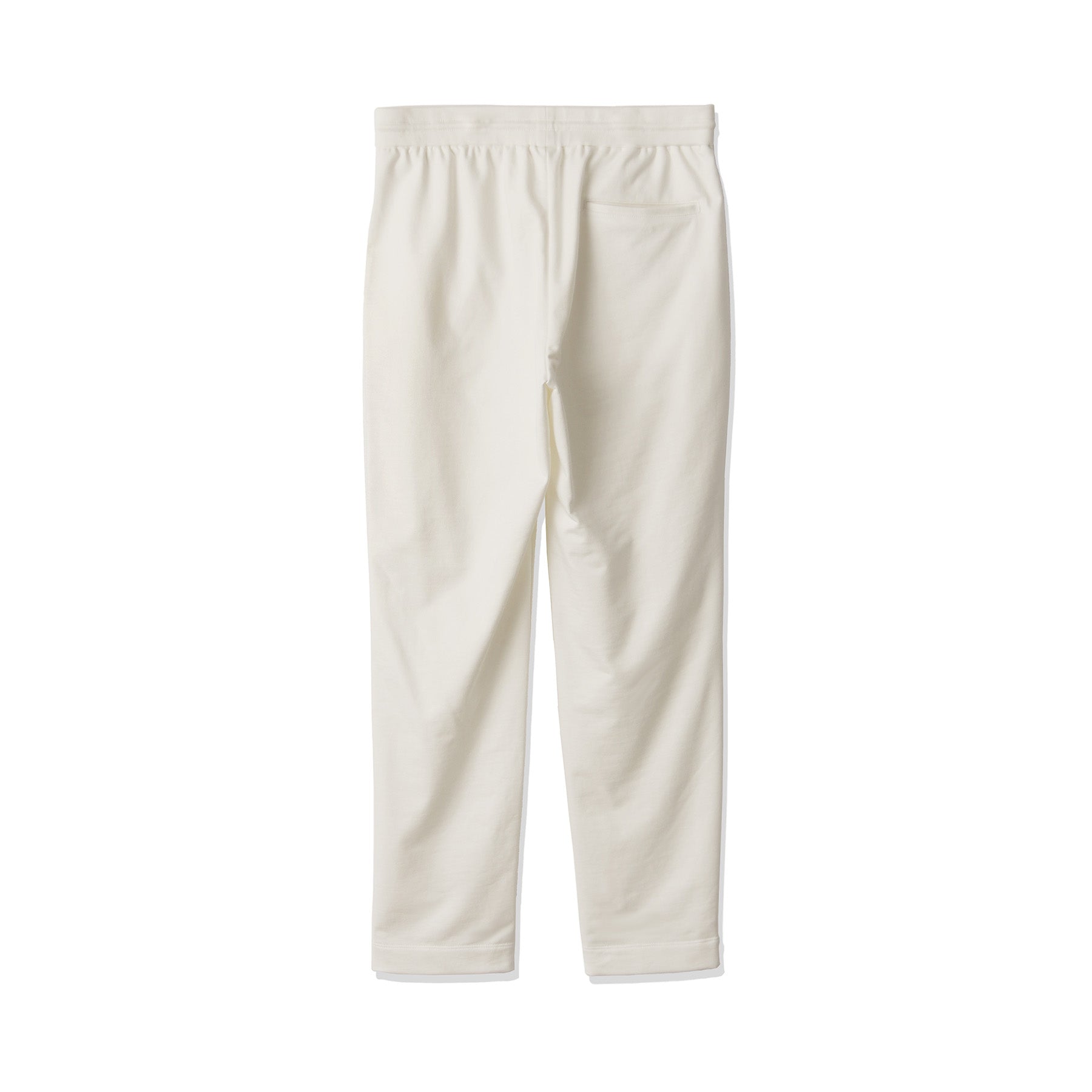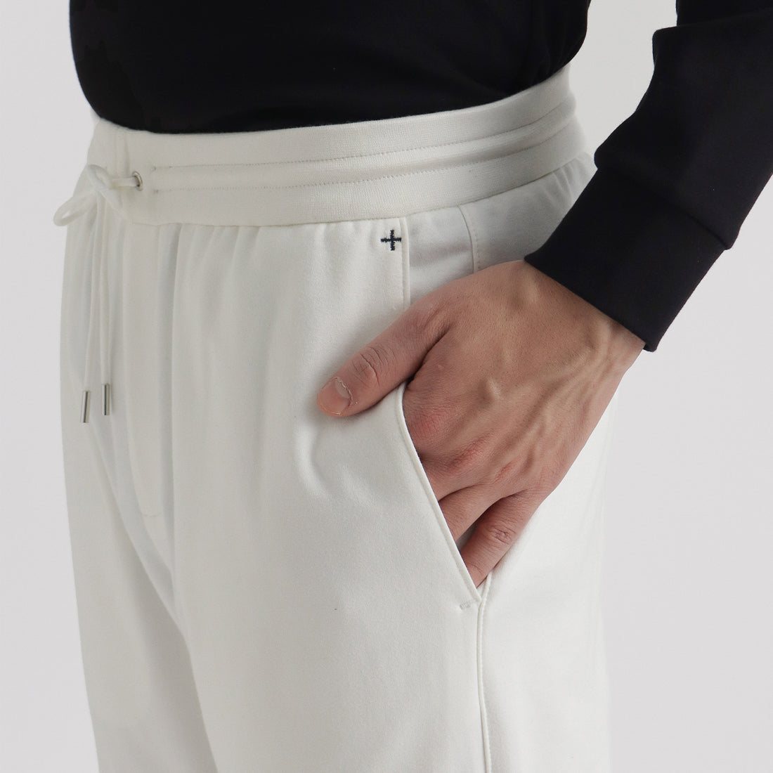 ドレス仕立てのトラウザーパターンを基にスウェットパンツを仕立てているため、動きやすさとシルエットの美しさを両立させています。前モデルよりウエスト寸法は変えずにヒップ~裾にかけて横幅をワンサイズ広くしました。また股上も少しだけ深くしてウエストベルトの幅を広くすることでフィット感を高めています。ウエストには全面ゴムを入れて、ウエストコードで絞ることができるイージー仕様。左ポケットには+CLOTHETであることを示す+マークが配色で入っています。