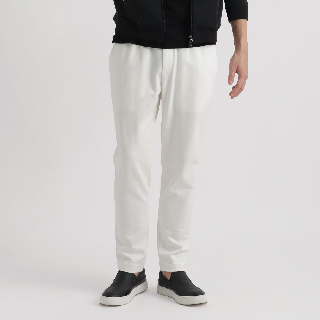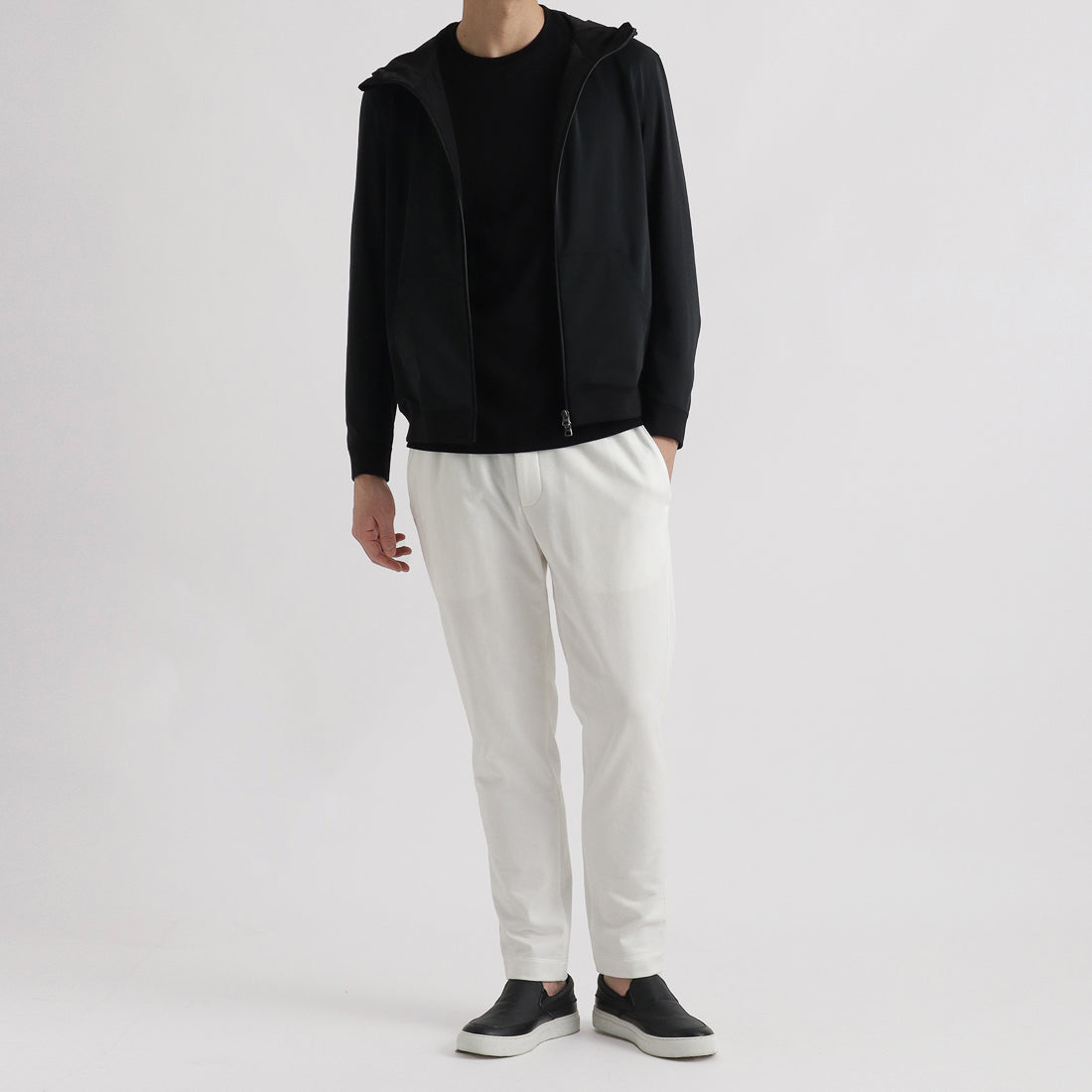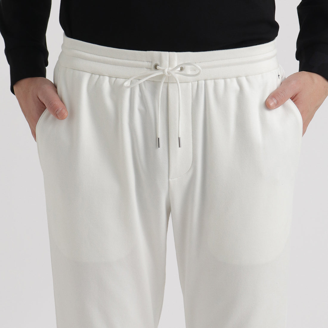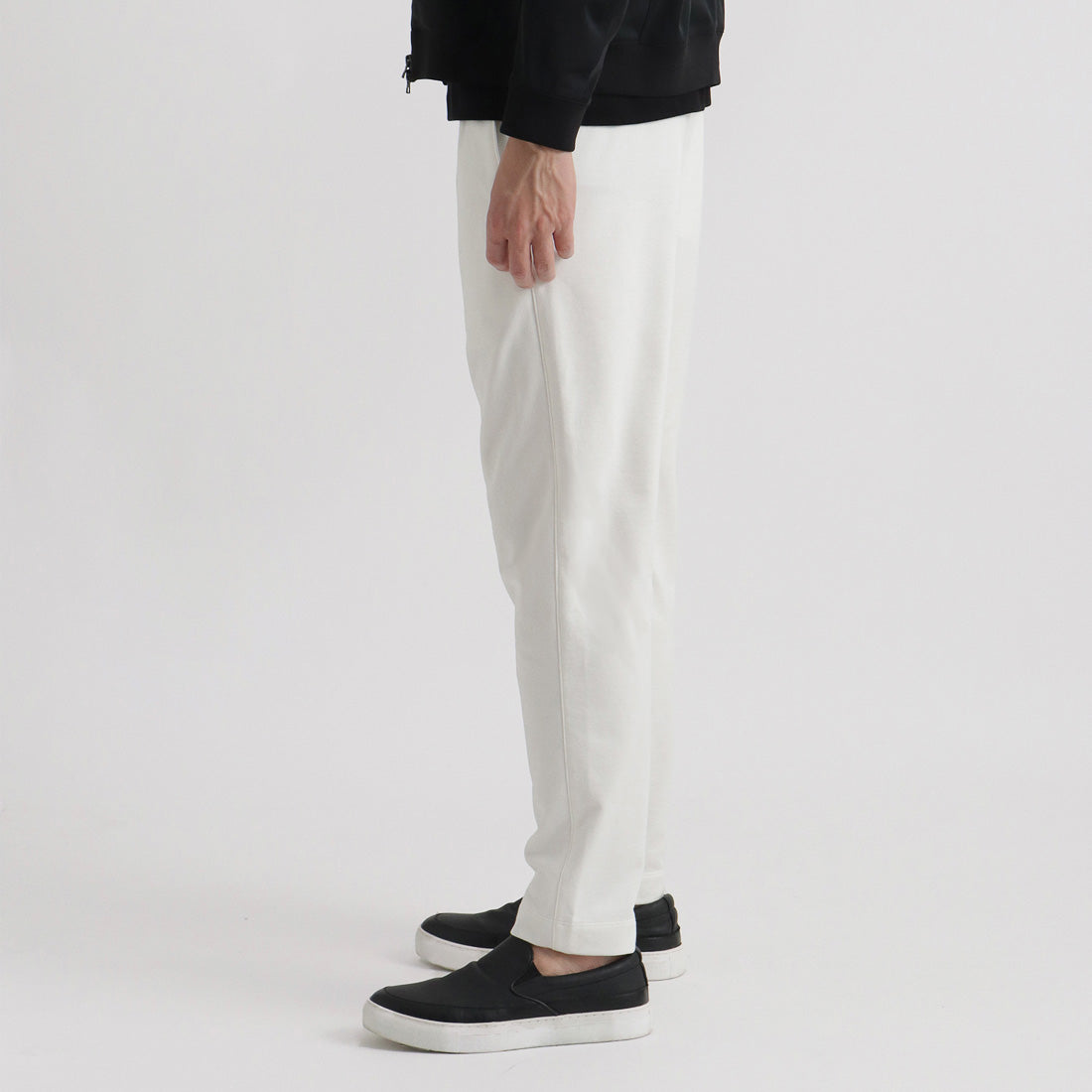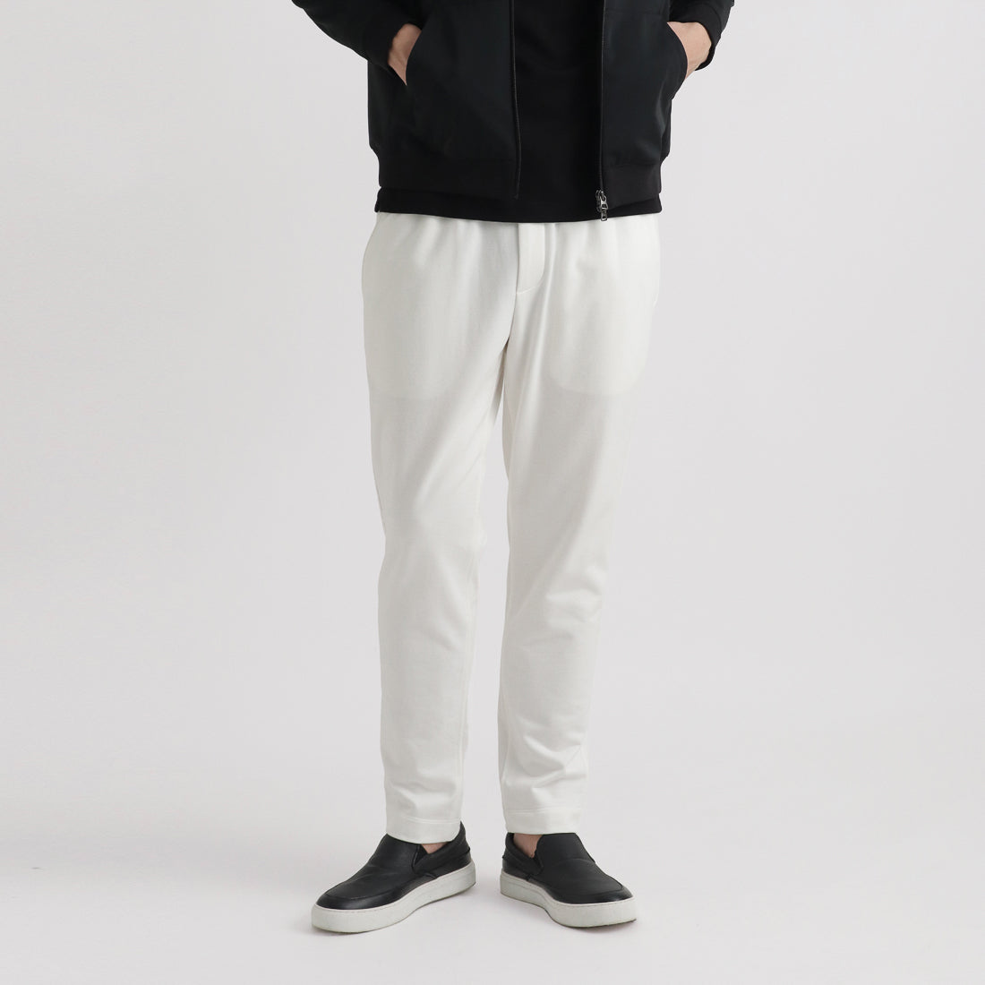 シーズンを問わずに活躍する人気素材「スビンプラチナムスムーステリー」を使ったスウェットパンツが、この春リニューアルを果たしました。なめらかで上品な表面感と着心地の良さ、軽いアウターに最適な肉感で大変好評をいただいてきましたが、見えてきた課題やお客様の声を元に改良を重ね、ついに新型スウェットパンツが完成いたしました。
