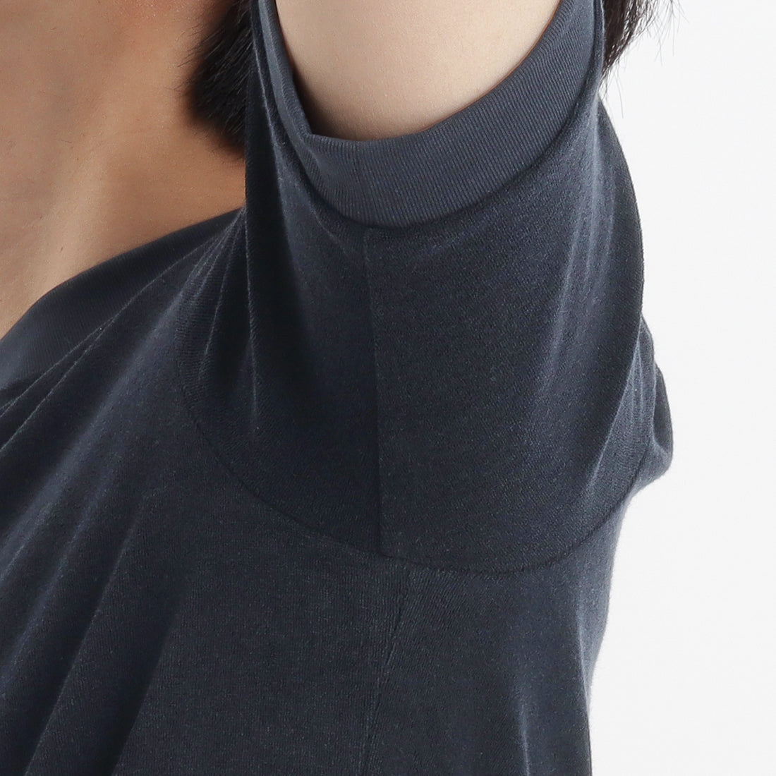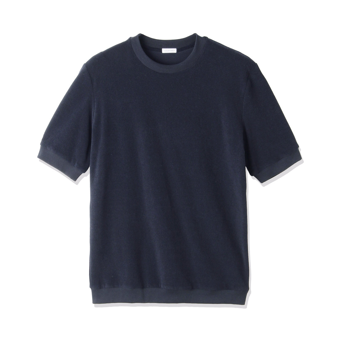 袖口、裾にリブを配置することでTシャツ以上、ニット未満なアイテムとしてカットソーのイージーさとニットのエレガントさを併せ持ったTシャツになります。腕が前に出しやすいよう立体的に作られたアームホールに対して袖自体を前振りにしています。また肩線をずらし、肩や袖山にイセを入れることで体に沿わせながら可動域を広げる設計にもなっています。袖山を高くすることで1枚でもジャケットの下でもごわつかずにすっきりとお召しいただけます。左脇には+CLOTHETであることを示す+マークが配色で入っています。