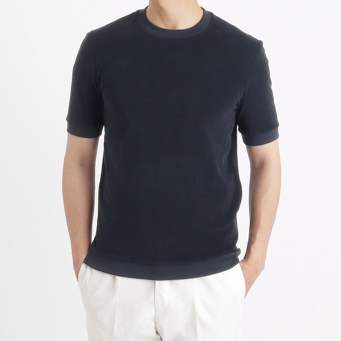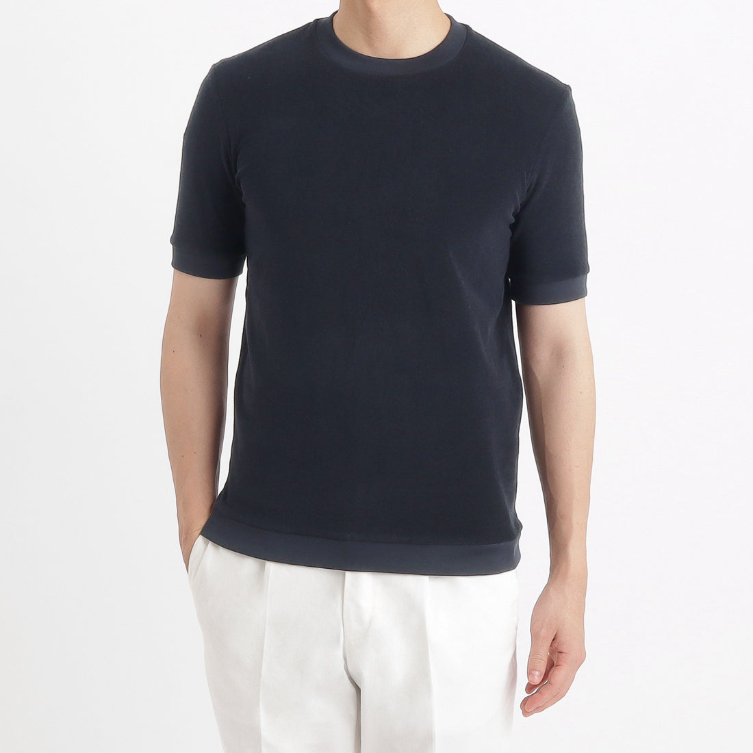 夏の定番素材スビンプラチナムマイクロパイルを人気のデザインにおとしこんだTシャツが登場しました。 袖口、裾にリブを配置した、Tシャツのイージーさとニットのエレガントさを併せ持った新感覚の商品です。