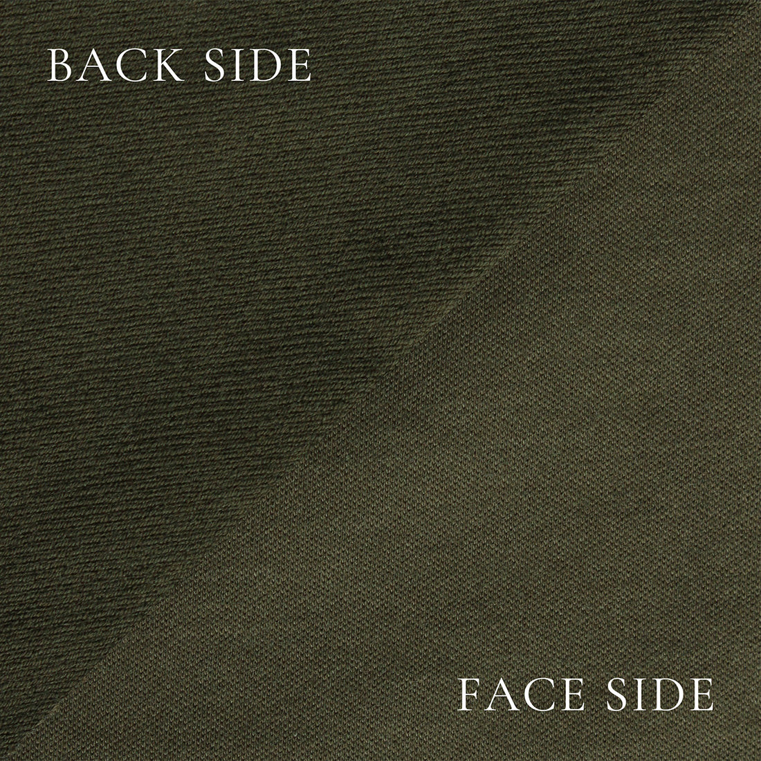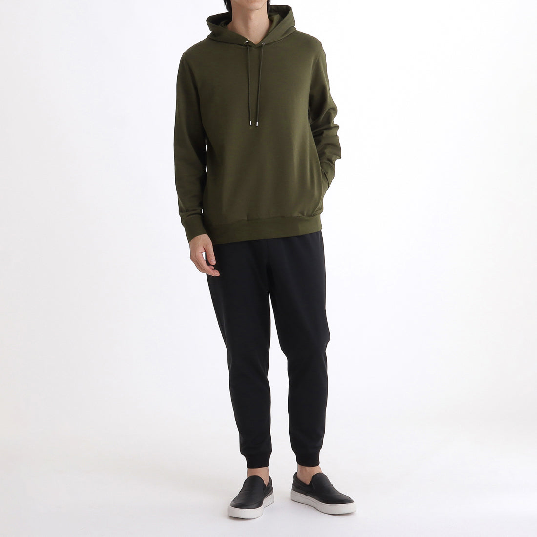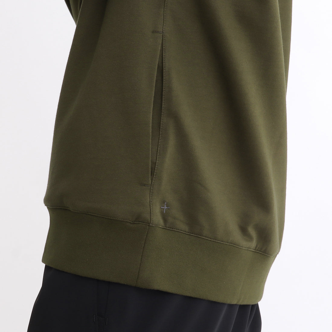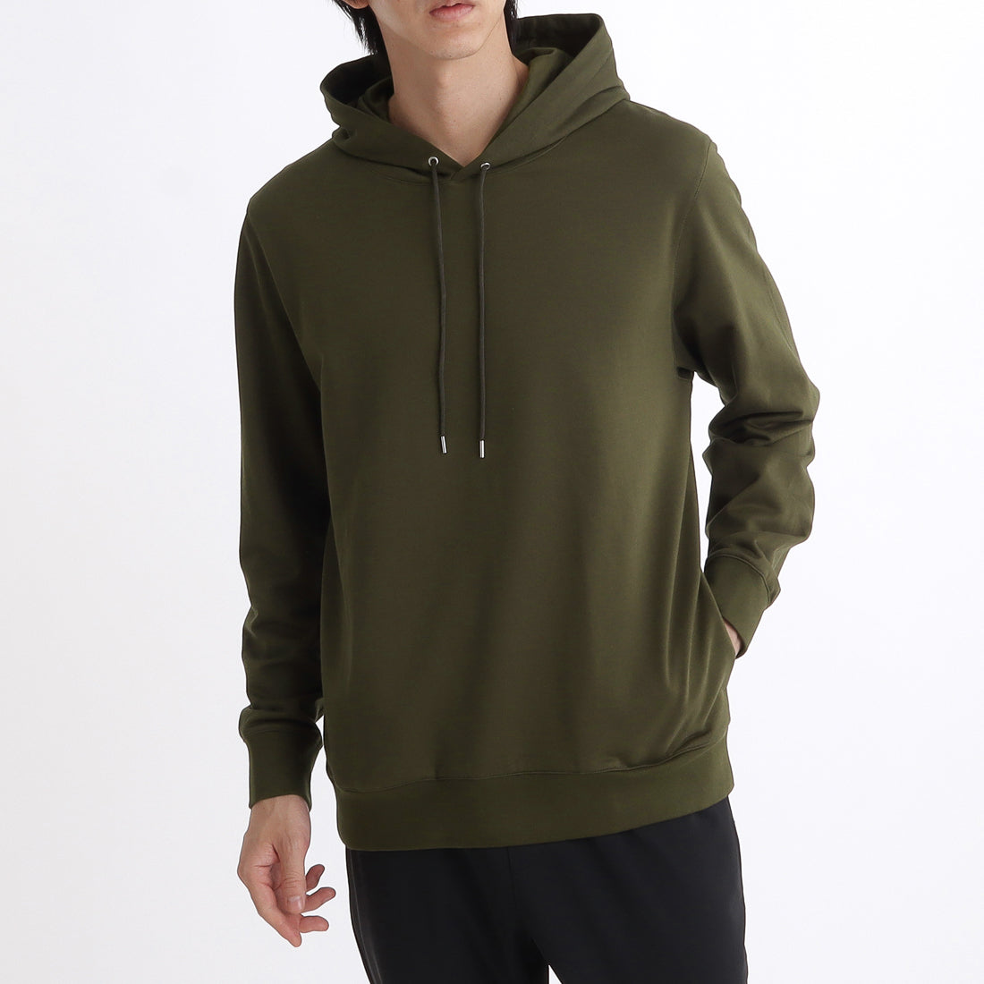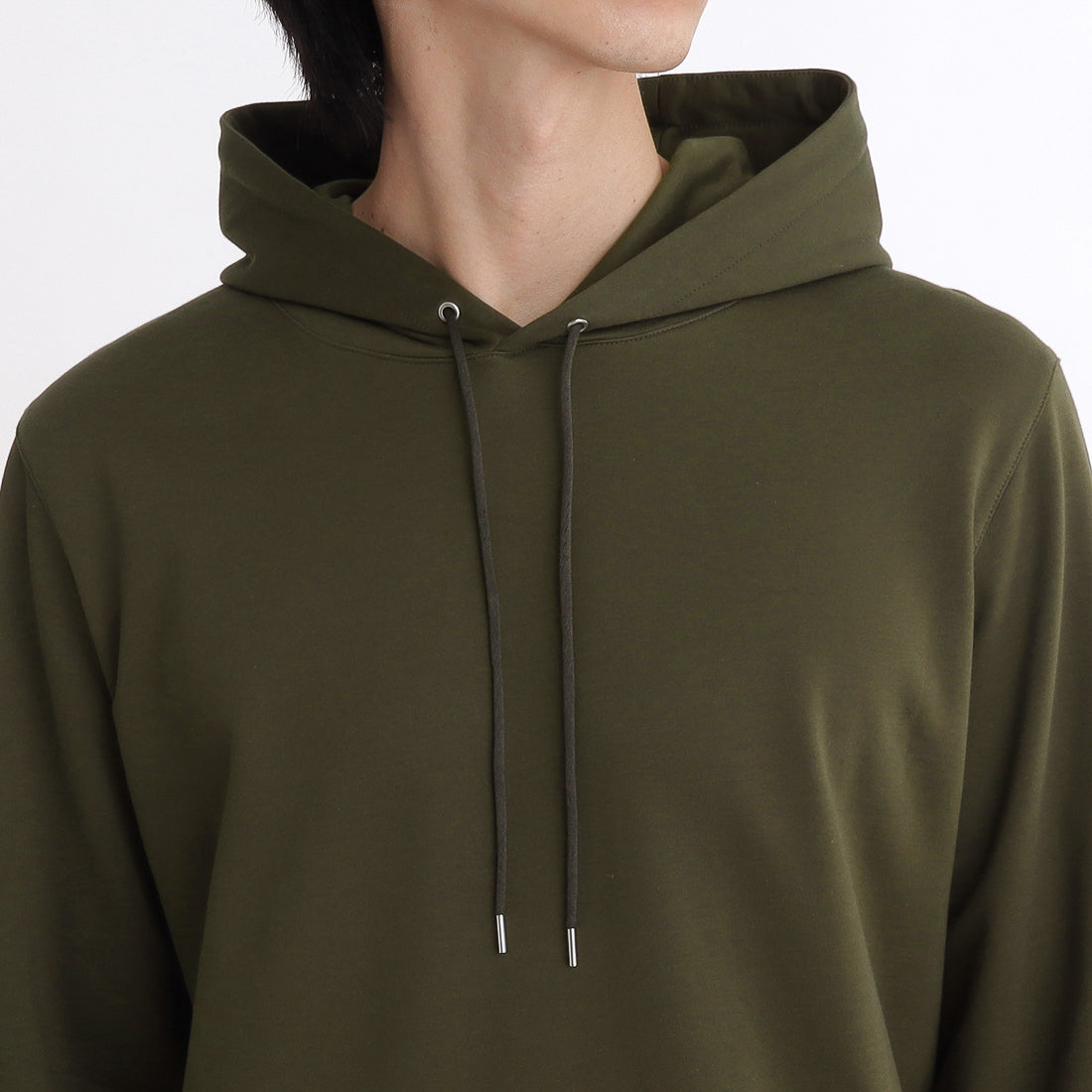 シーズンを問わずに活躍する人気素材「スビンプラチナムスムーステリー」を使ったフーディーに新色のオリーブが登場しました。なめらかで上品な表面感と着心地の良さ、軽いアウターに最適な肉感で大変好評のアイテムです。