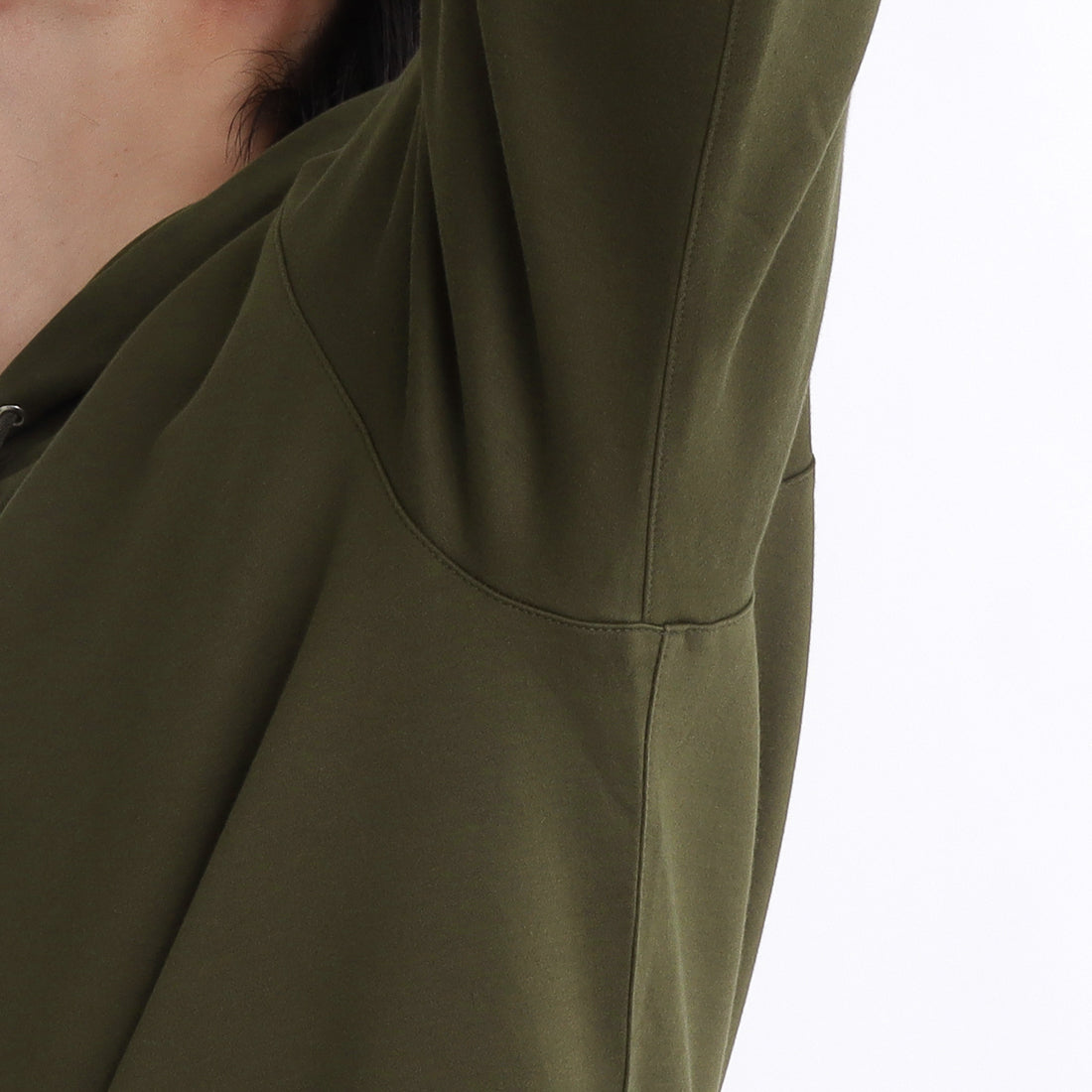 立体的に作られたアームホールに対して袖を前振りに設計。肩線を後にずらし、肩にイセを入れることで体に沿わせながら肩まわりの可動域を広げる設計となっています。フードもしっかりと立つように再度設計を見直しました。裏毛フーディーと同様に全体的にゆとりを持たせたサイズ感、また前身頃より後身頃の着丈を長くすることで身体を包み込むようなシルエットで上品な仕上がりになっています。