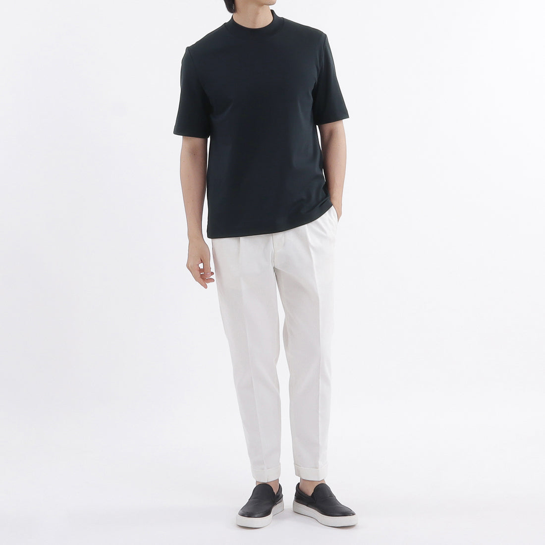 襟元が美しく映えるようミリ単位で調整した襟が特長の「テーラードモックネックTシャツ」に新色ネイビーが登場。1枚で着るのはもちろん、レイヤードアイテムとしてもお薦めの一着です。