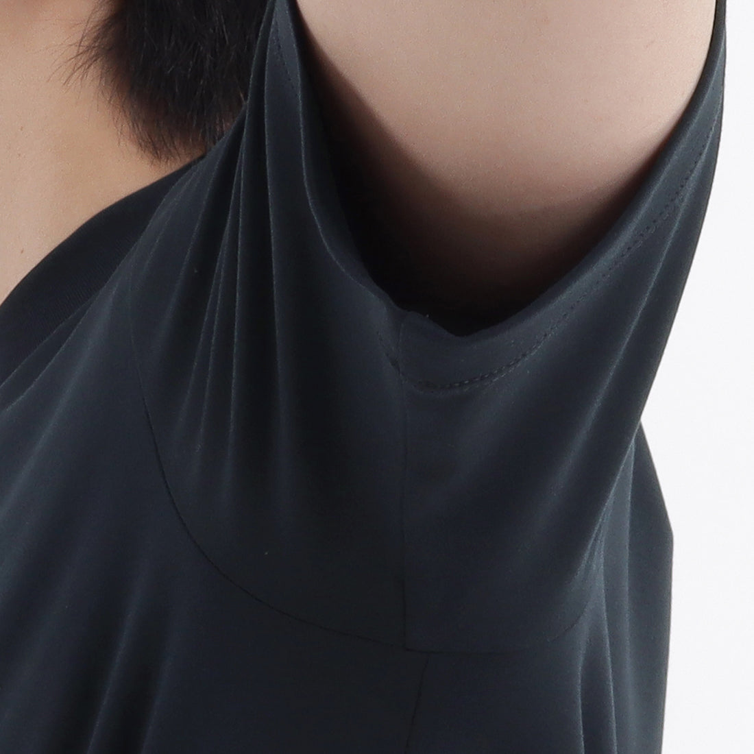 腕が前に出しやすいよう立体的に作られたアームホールに対して袖を前振りにしています。肩線をずらし、肩や袖山にイセを入れることで体に沿わせながら可動域を広げる設計にもなっています。 袖山を高くしているので1枚でもジャケットの下でもごわつかずにすっきりとお召しいただけます。