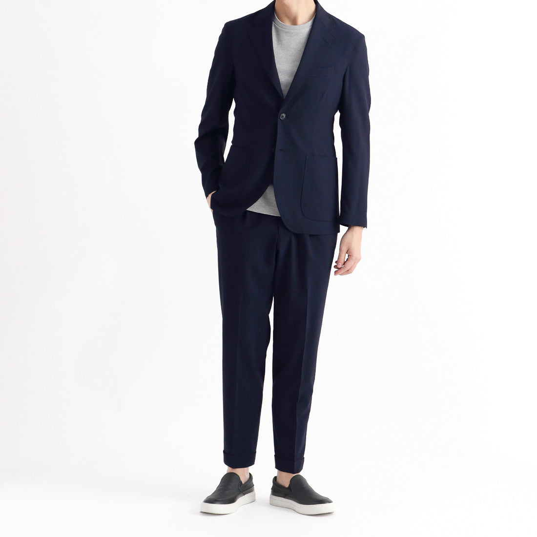 限定カラー:ディープブルーのテックウール®トロピカルセットアップについて詳しくご説明しています。