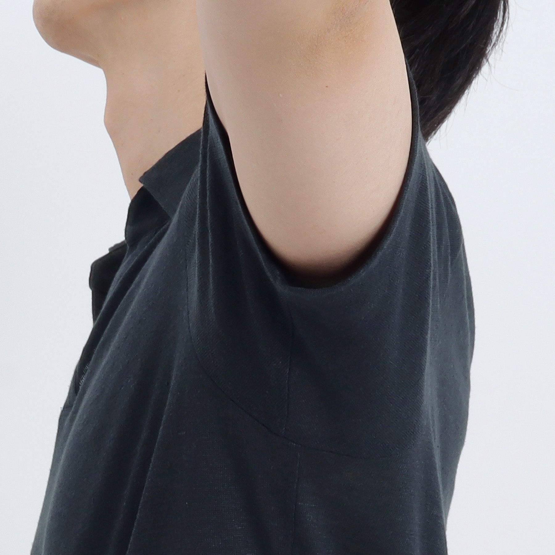 腕が前に出しやすいよう立体的に作られたアームホールに対して袖を前振りにしています。肩線をずらし、肩や袖山にイセを入れることで体に沿わせながら可動域を広げる設計にもなっています。イセとは・・・長短2枚の布の長い方を縮めて丸みやふくらみを出すこと。裾は前後差のないストレートカットで脇にはスリットを入れて裾の可動域をUPさせています。左脇裾のスリット部分には+CLOTHETであることを示す+マークが配色で入っています。