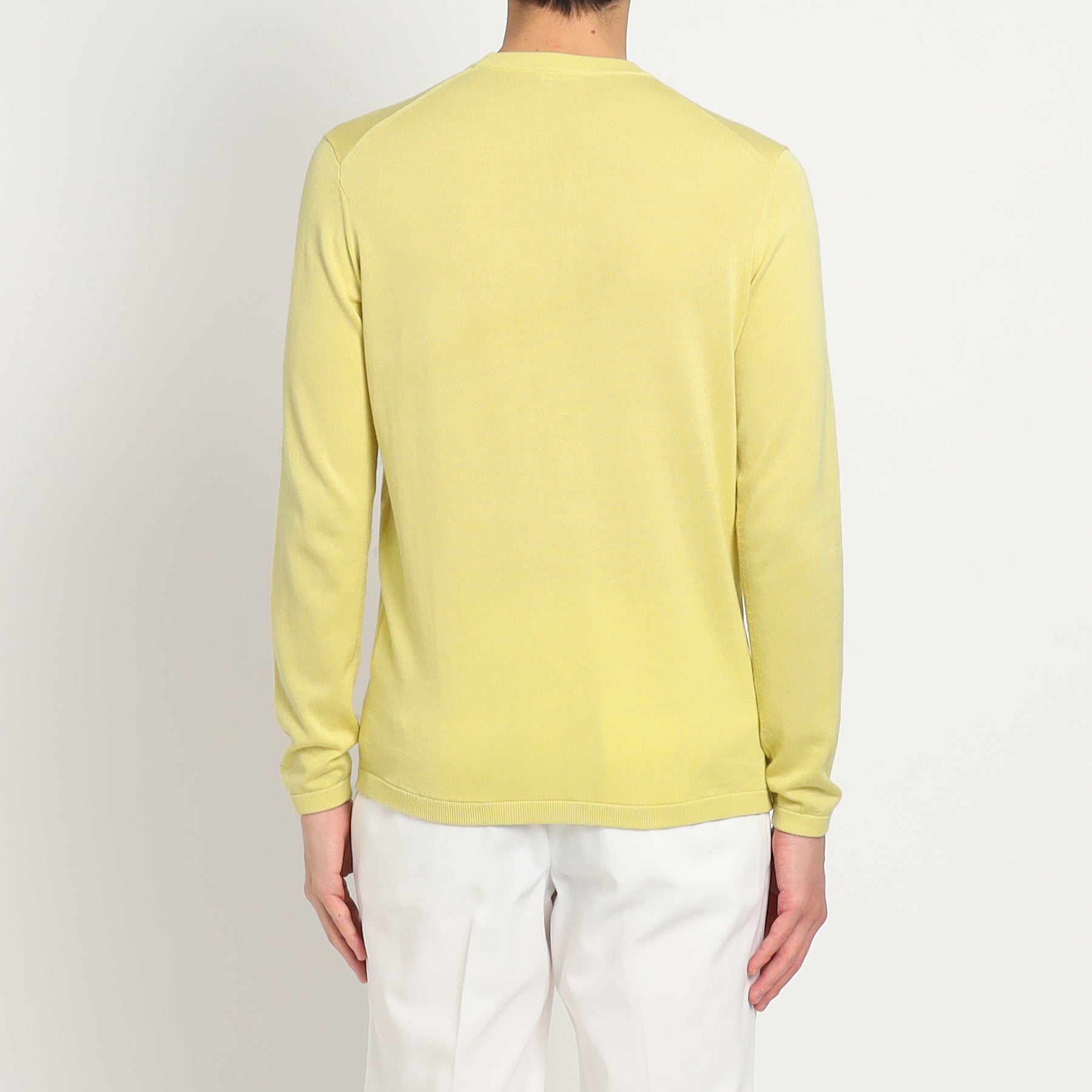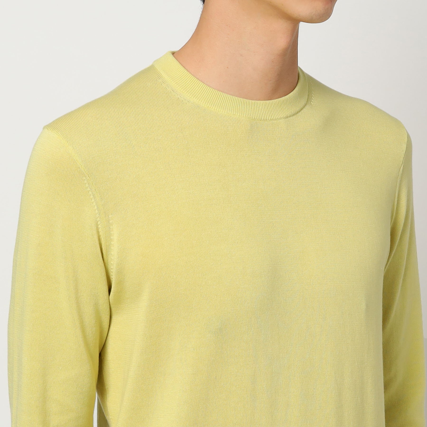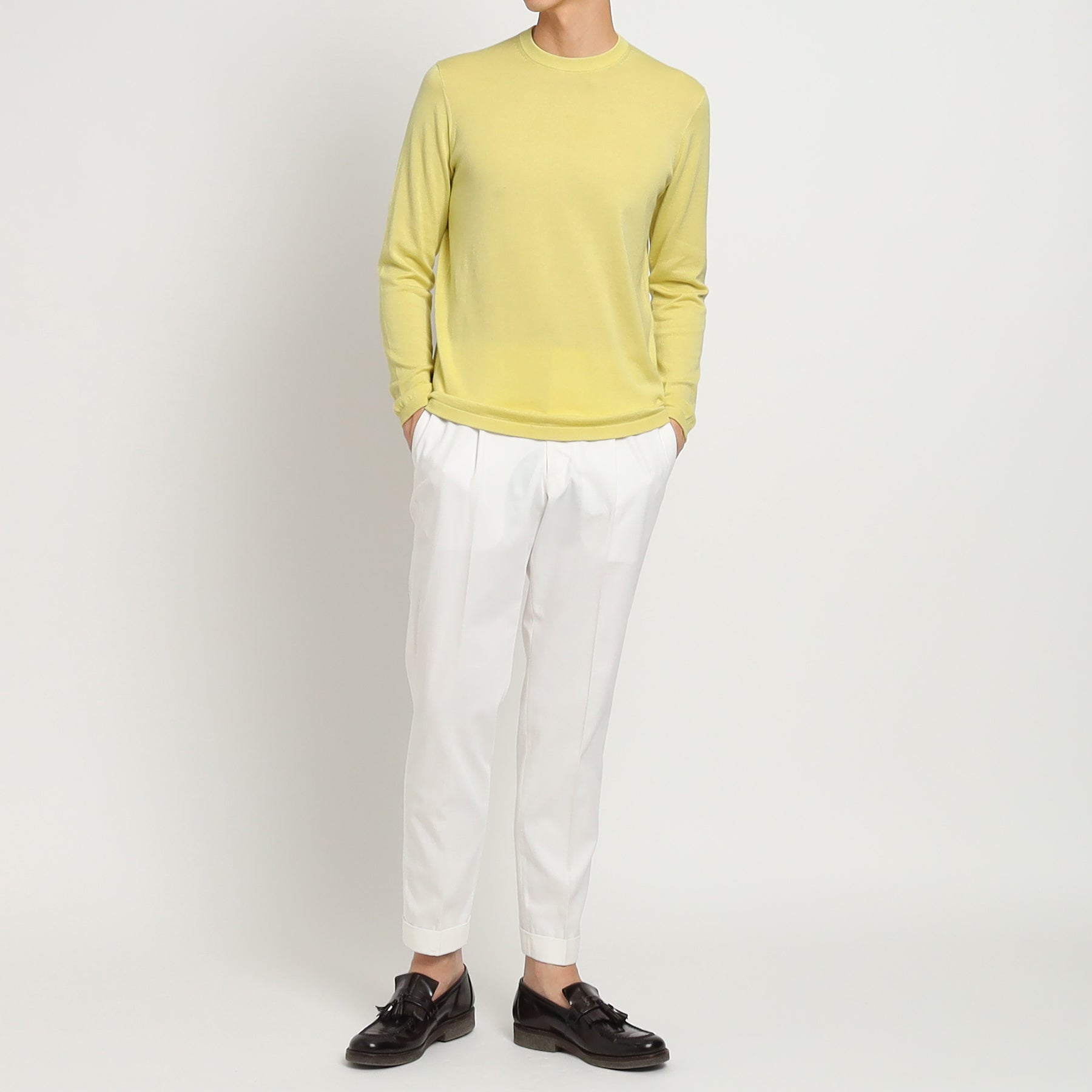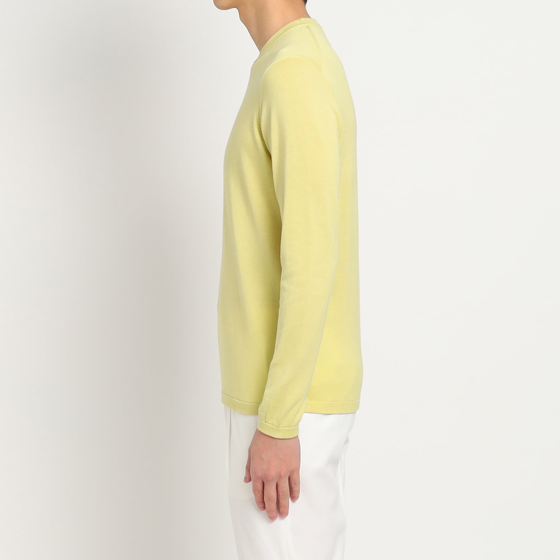 ブランドを代表するスビンプラチナム(ファーストピック)を使用して作製されたクルーネックニット。スビンプラチナムならではの編み目の綺麗さや肌触りで上品かつ大人な雰囲気に。原料の良さを活かしたシンプルながらも存在感のあるルックスは男性女性問わずに着ていただける大人のデイリーウェアとしておすすめ。