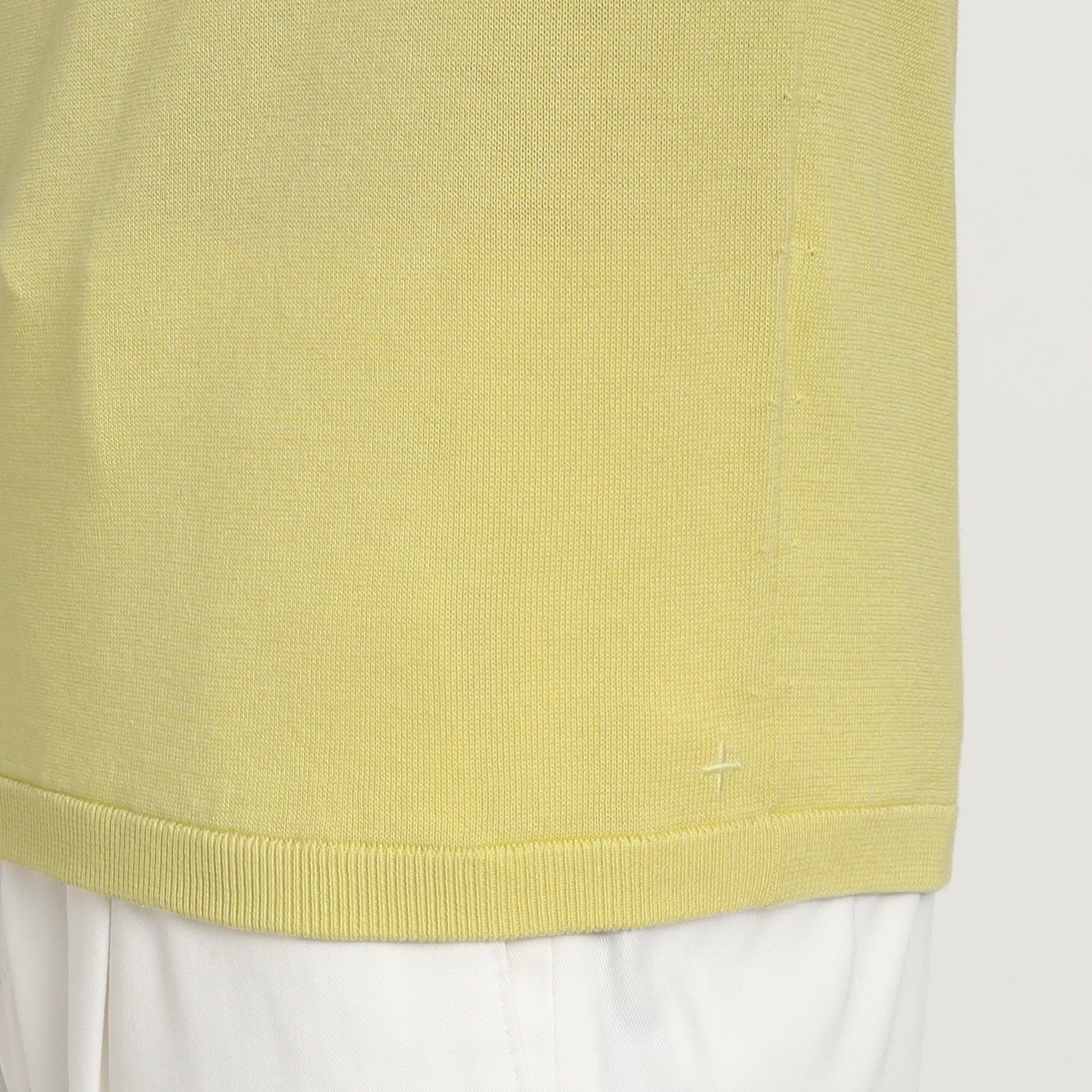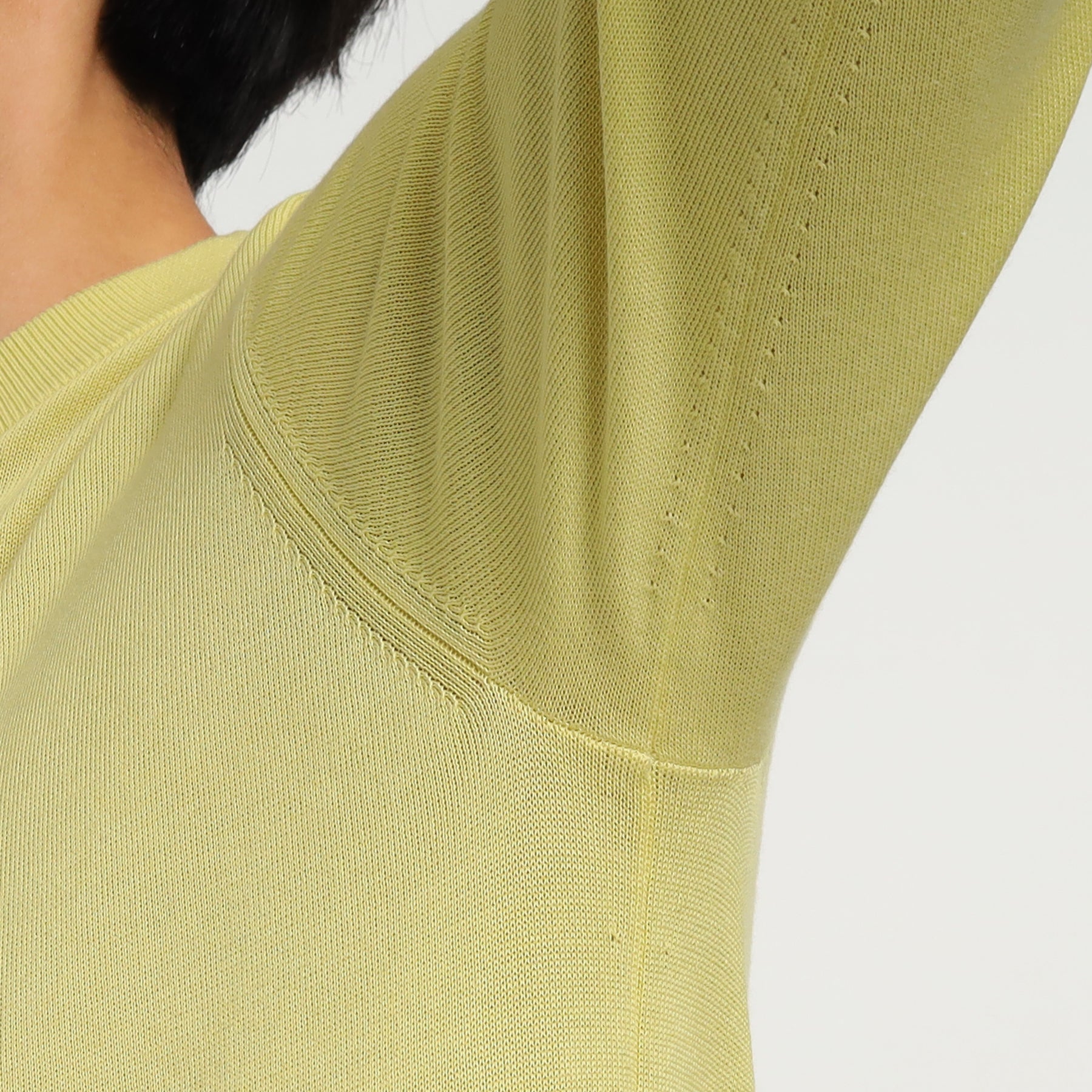 クロスクローゼットのニットの特長として、脇や袖下の設計を目立て内減らしにしています。(写真の白枠部分)減らし目により編み目が飛んでいるように見えますが、シルエットや編み目を美しく仕上げるデザインの一部となります。