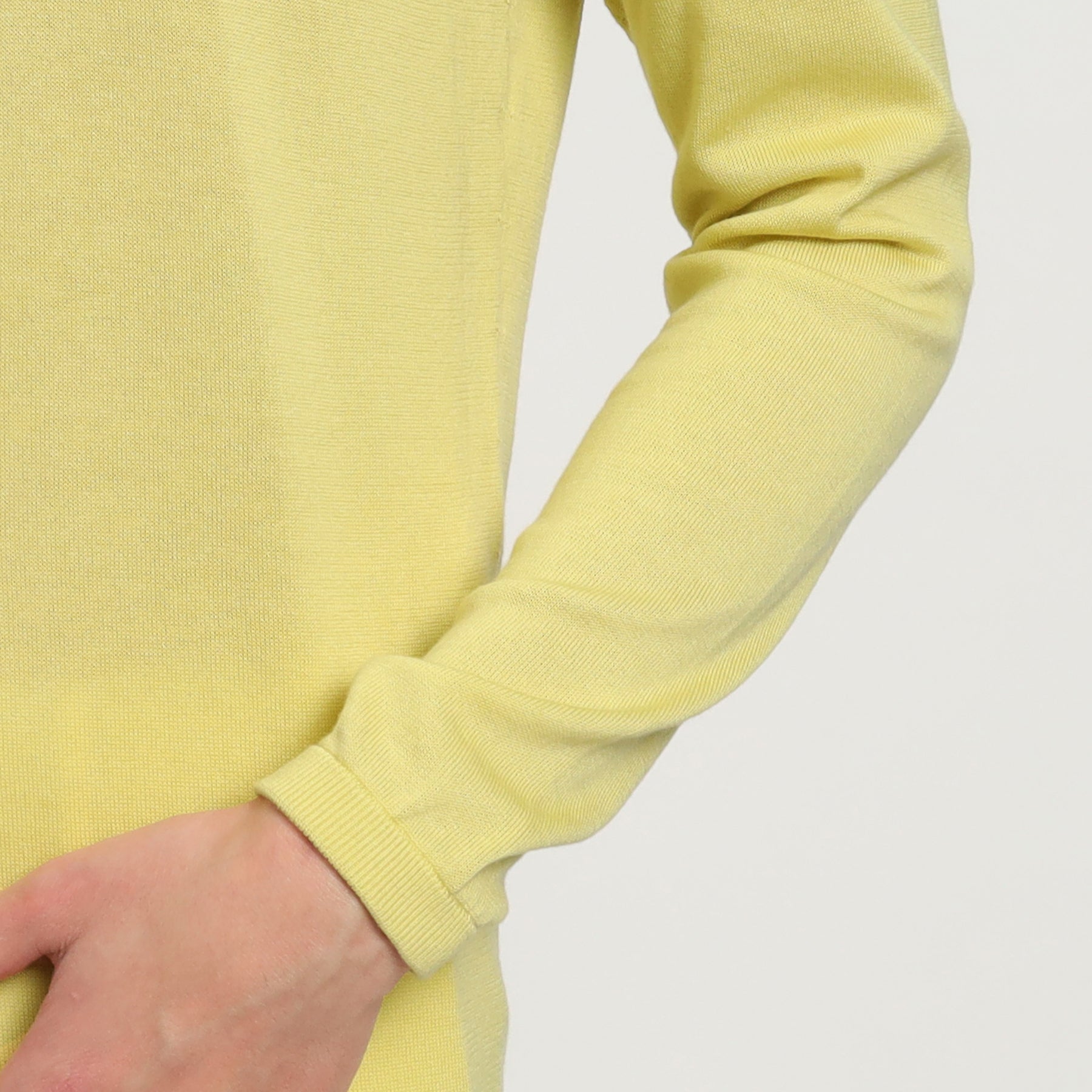 裾口や袖口のリブを細くすることで、品良く1枚での着用でもジャケットのインナーとしてもお使いいただけます。生地を裁断せず、ニットならではのリンキングという手法を用いています。