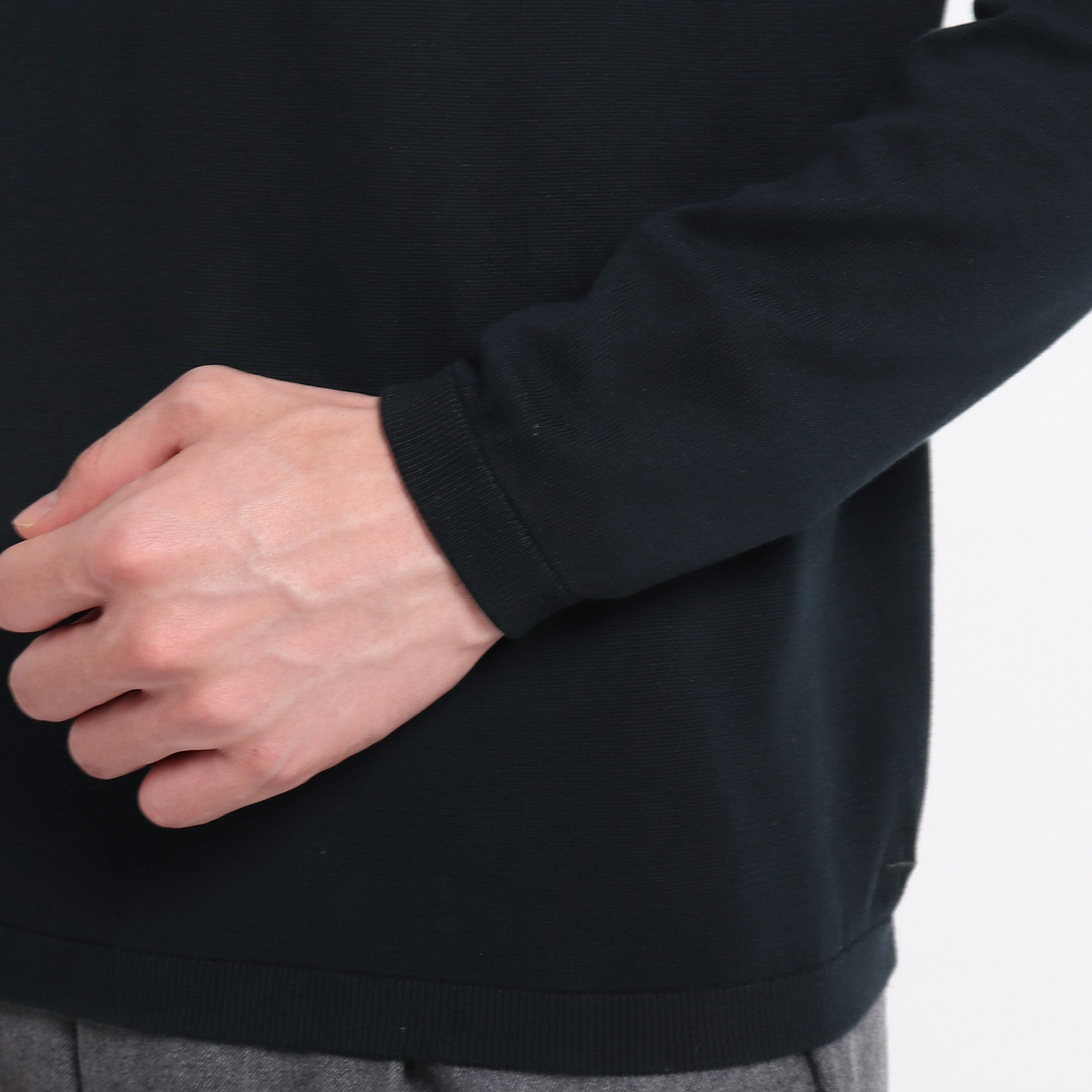 裾口や袖口のリブを細くすることで、品良く1枚での着用でもジャケットのインナーとしてもお使いいただけます。生地を裁断せず、ニットならではのリンキングという手法を用いています。