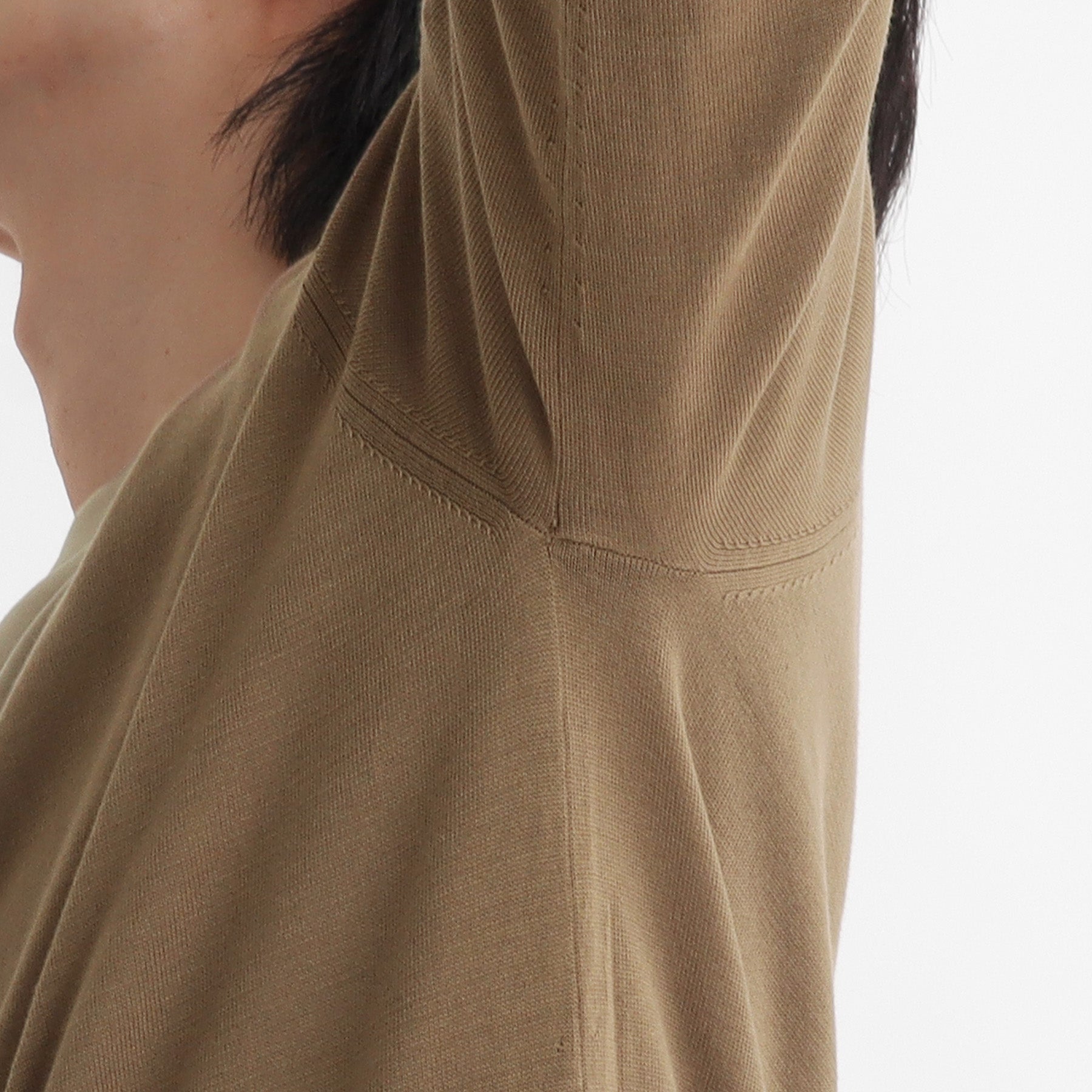 筋肉の付き方やニットの特性を踏まえ、体の動きを検証することで動きやすくもごわつかない着心地とシルエットを実現しています。