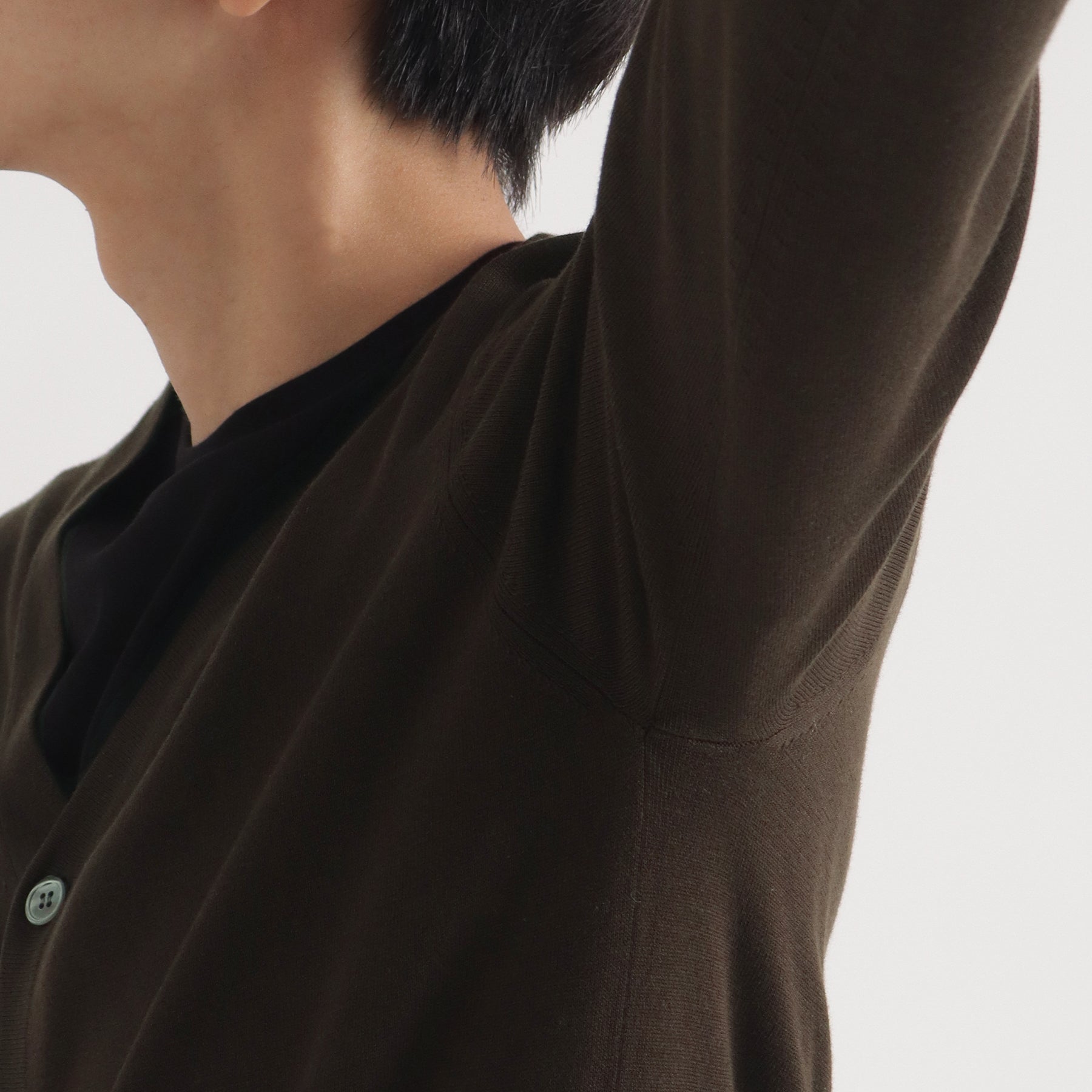 筋肉の付き方やニットの特性を踏まえ、体の動きを検証することで動きやすくもごわつかない着心地とシルエットを実現しています。