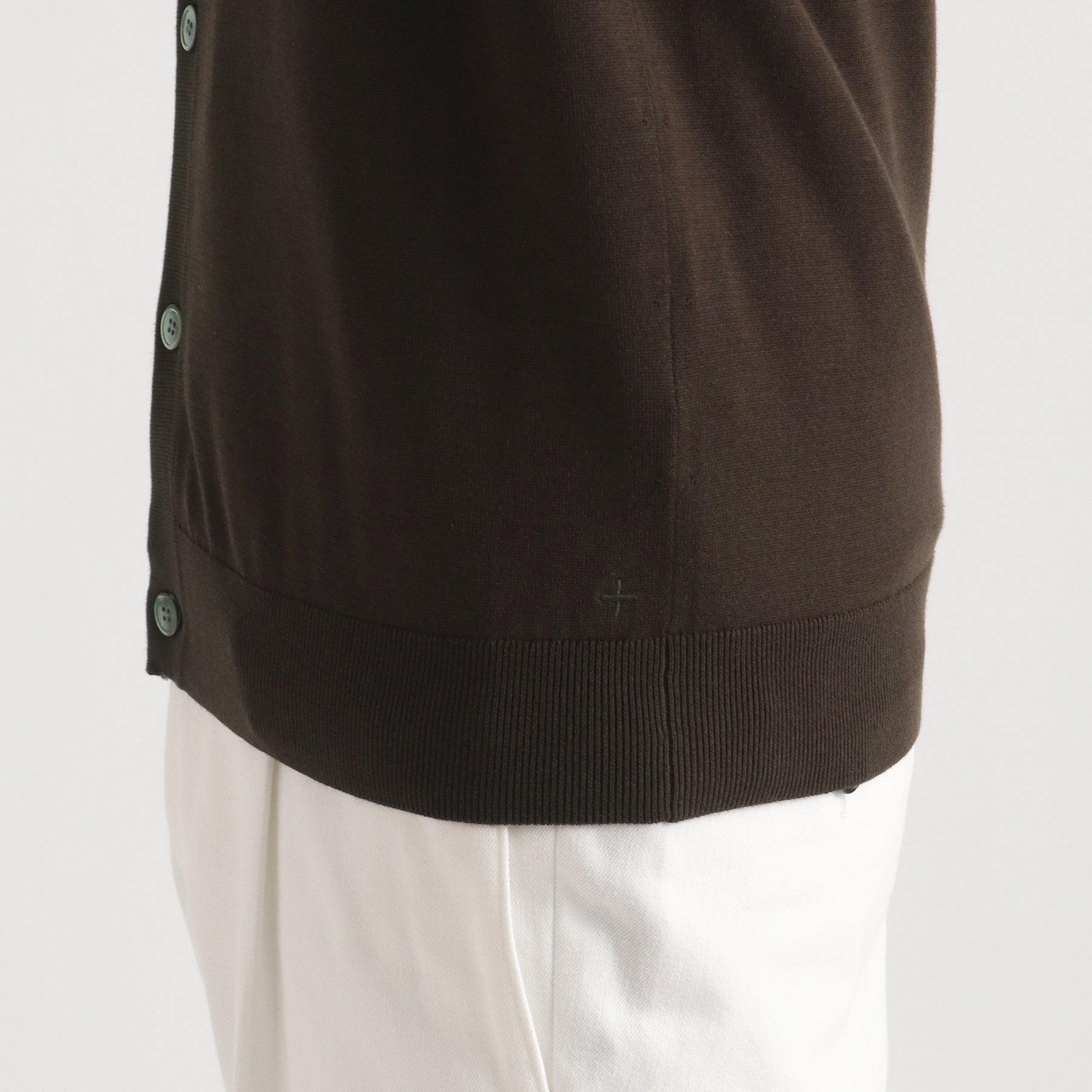 一般的に総針やリブ編みで仕立てる前立を袋編みにすることでさらに繊細な印象にしています。