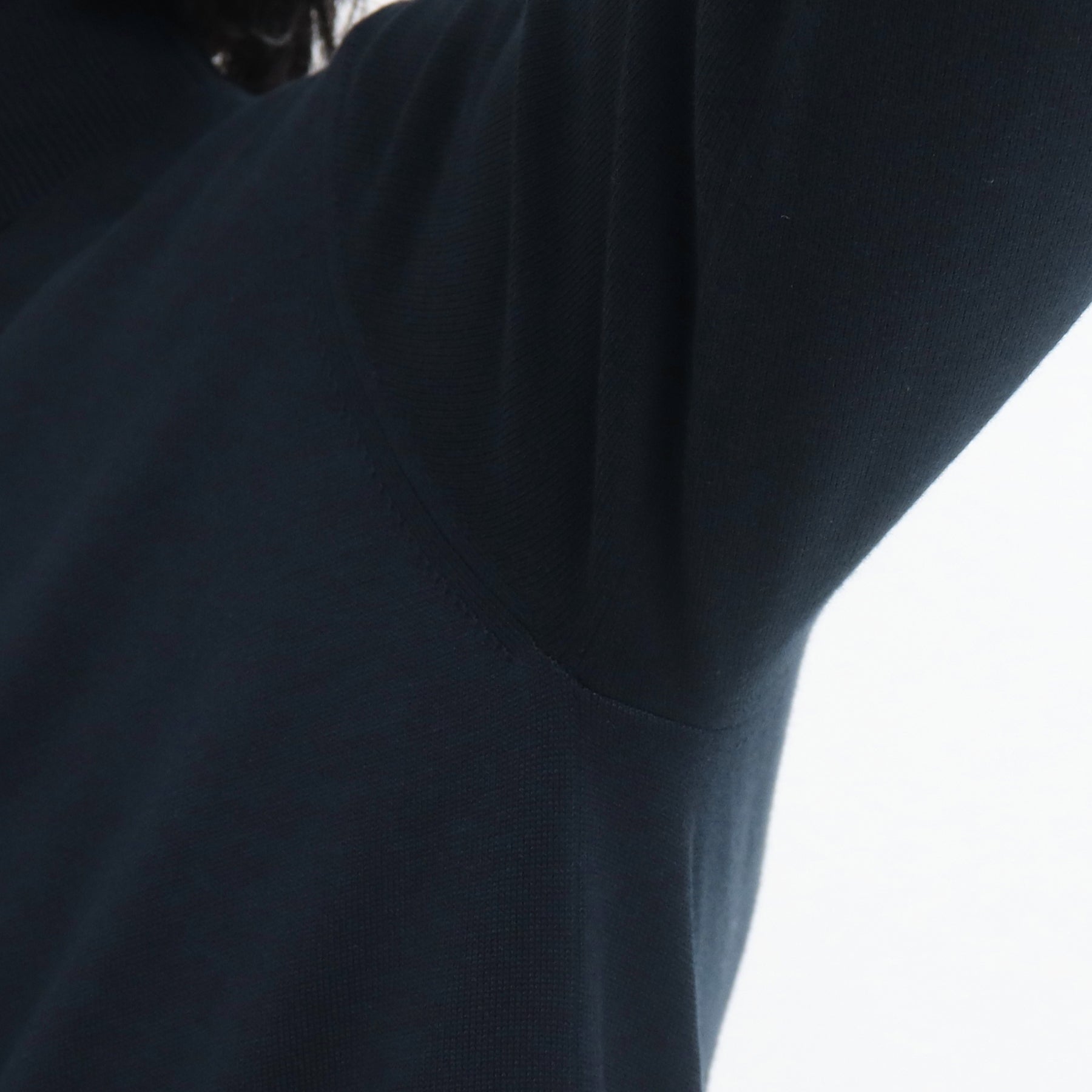 筋肉の付き方やニットの特性を踏まえ、体の動きを検証することで動きやすくもごわつかない着心地とシルエットを実現しています。