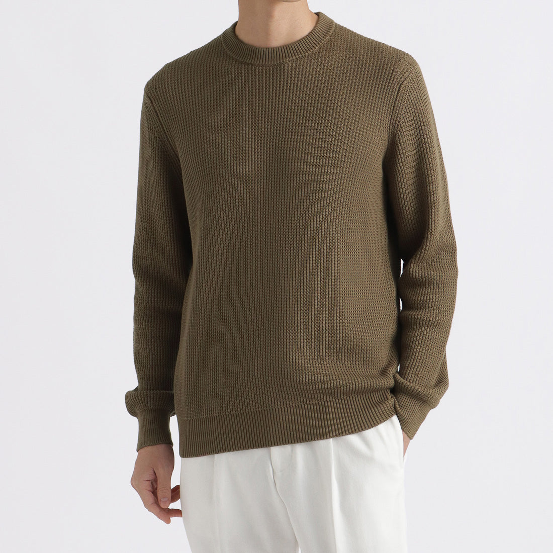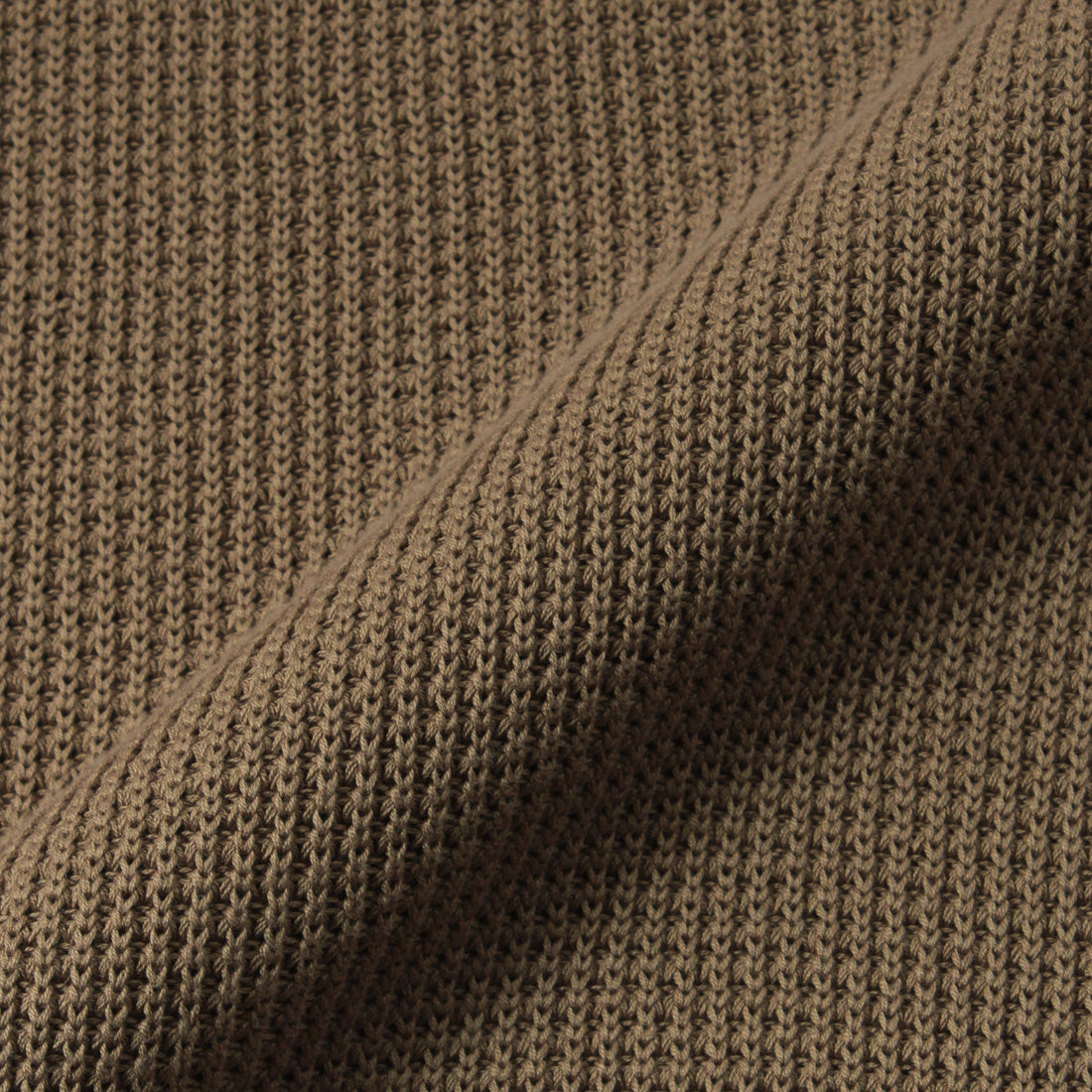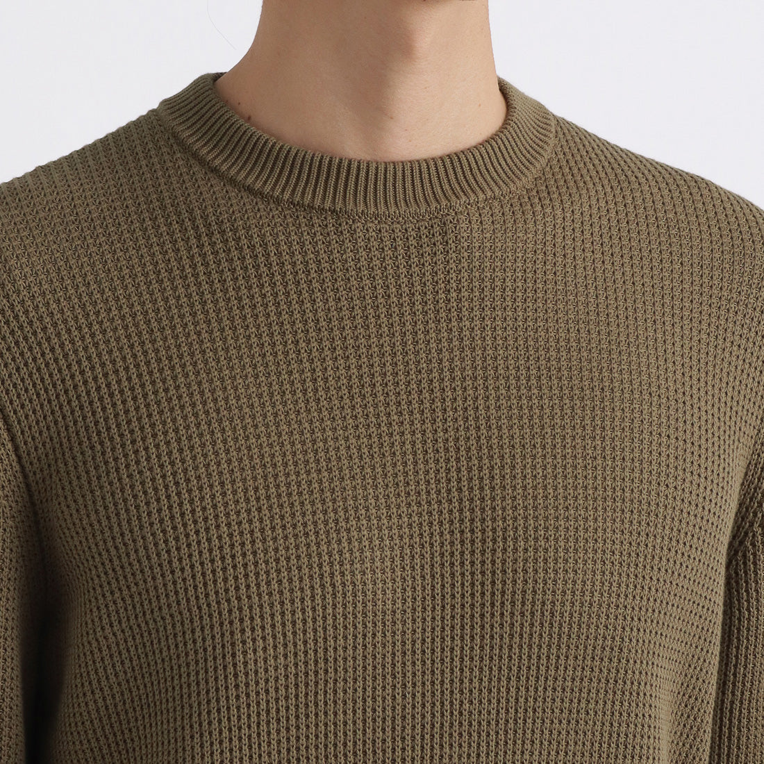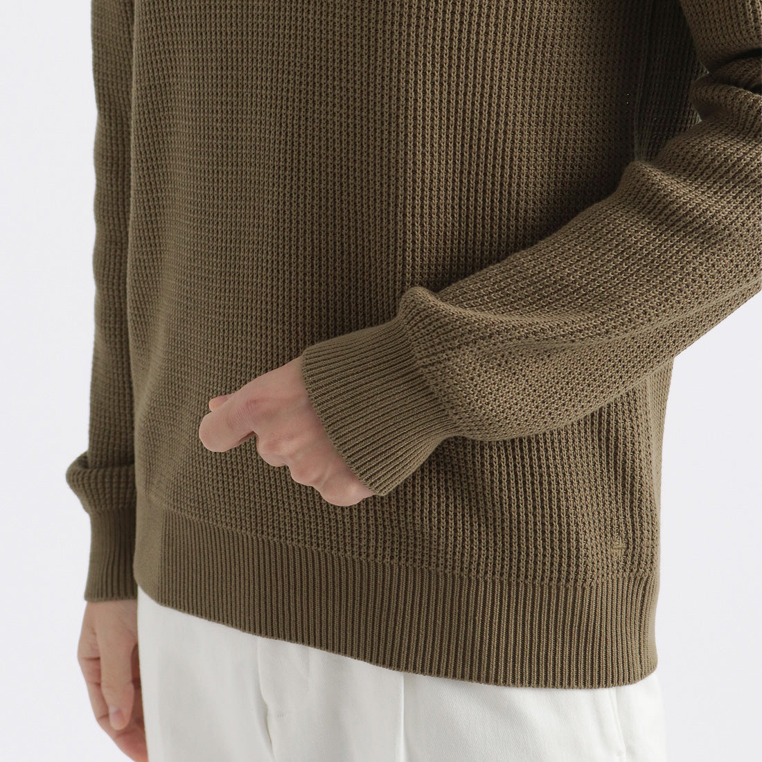 編み糸にスビンプラチナム(ファーストピック)を使用したミドルゲージのワッフルクルーネックニット。スビンプラチナムならではの編み目の綺麗さや肌触りでソフトでラグジュアリーな印象に。ミドルゲージで重厚な見た目ながらもソフトな仕上がりになっています。