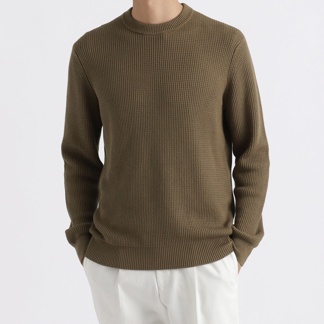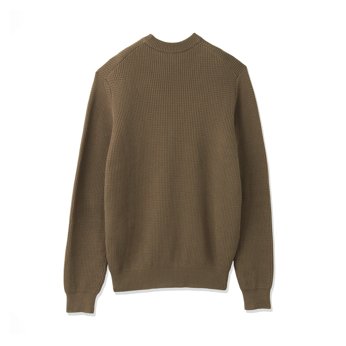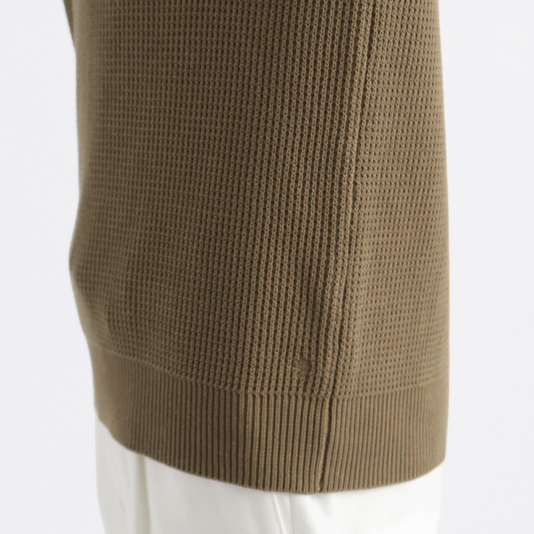 編み糸にスビンプラチナム(ファーストピック)を使用したミドルゲージのワッフルクルーネックニット。スビンプラチナムならではの編み目の綺麗さや肌触りでソフトでラグジュアリーな印象に。ミドルゲージで重厚な見た目ながらもソフトな仕上がりになっています。