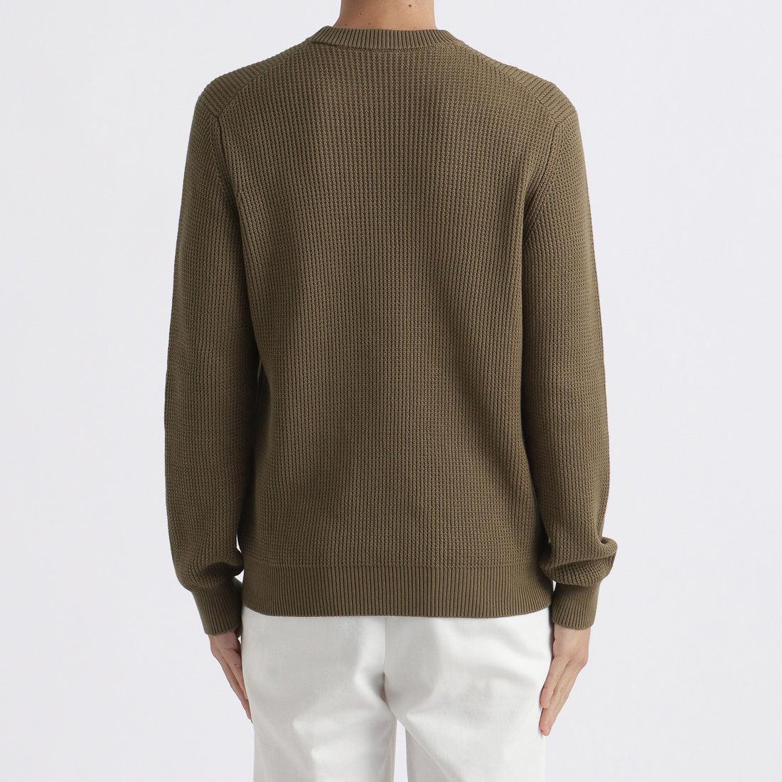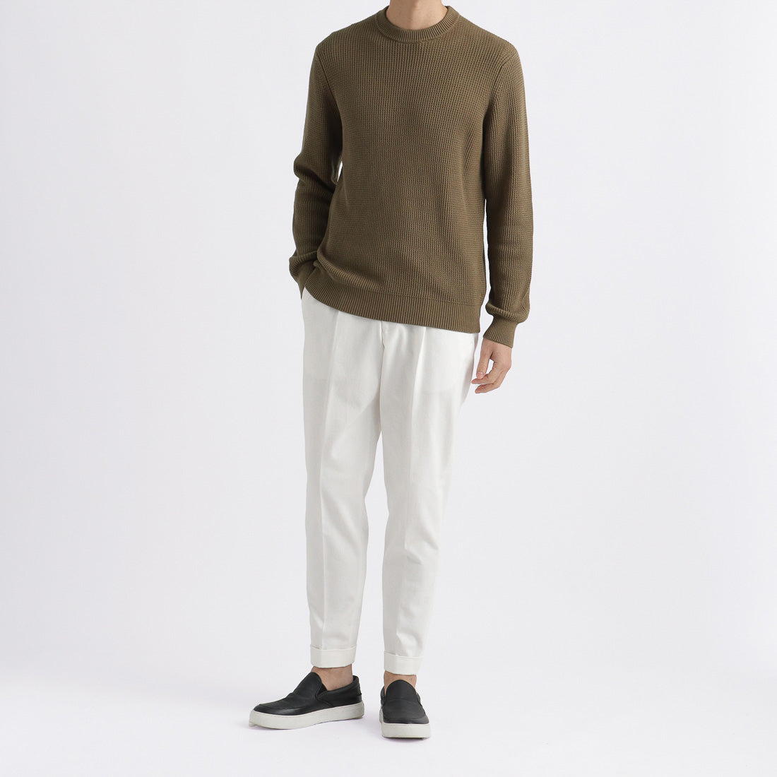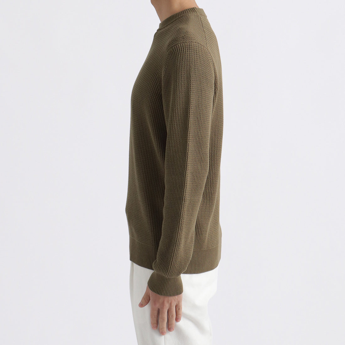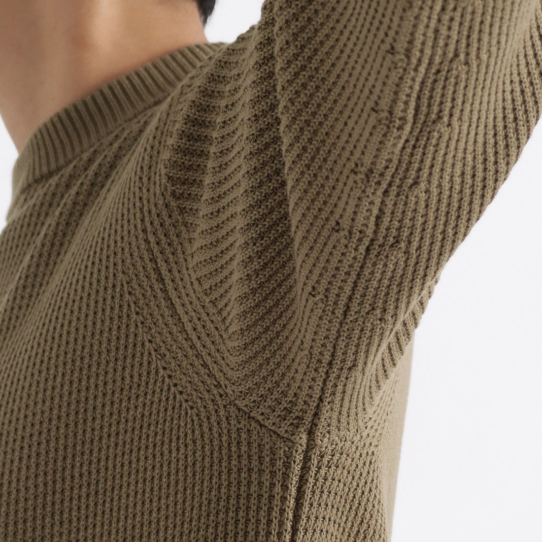 編み糸にスビンプラチナム(ファーストピック)を使用したミドルゲージのワッフルクルーネックニット。スビンプラチナムならではの編み目の綺麗さや肌触りでソフトでラグジュアリーな印象に。ミドルゲージで重厚な見た目ながらもソフトな仕上がりになっています。