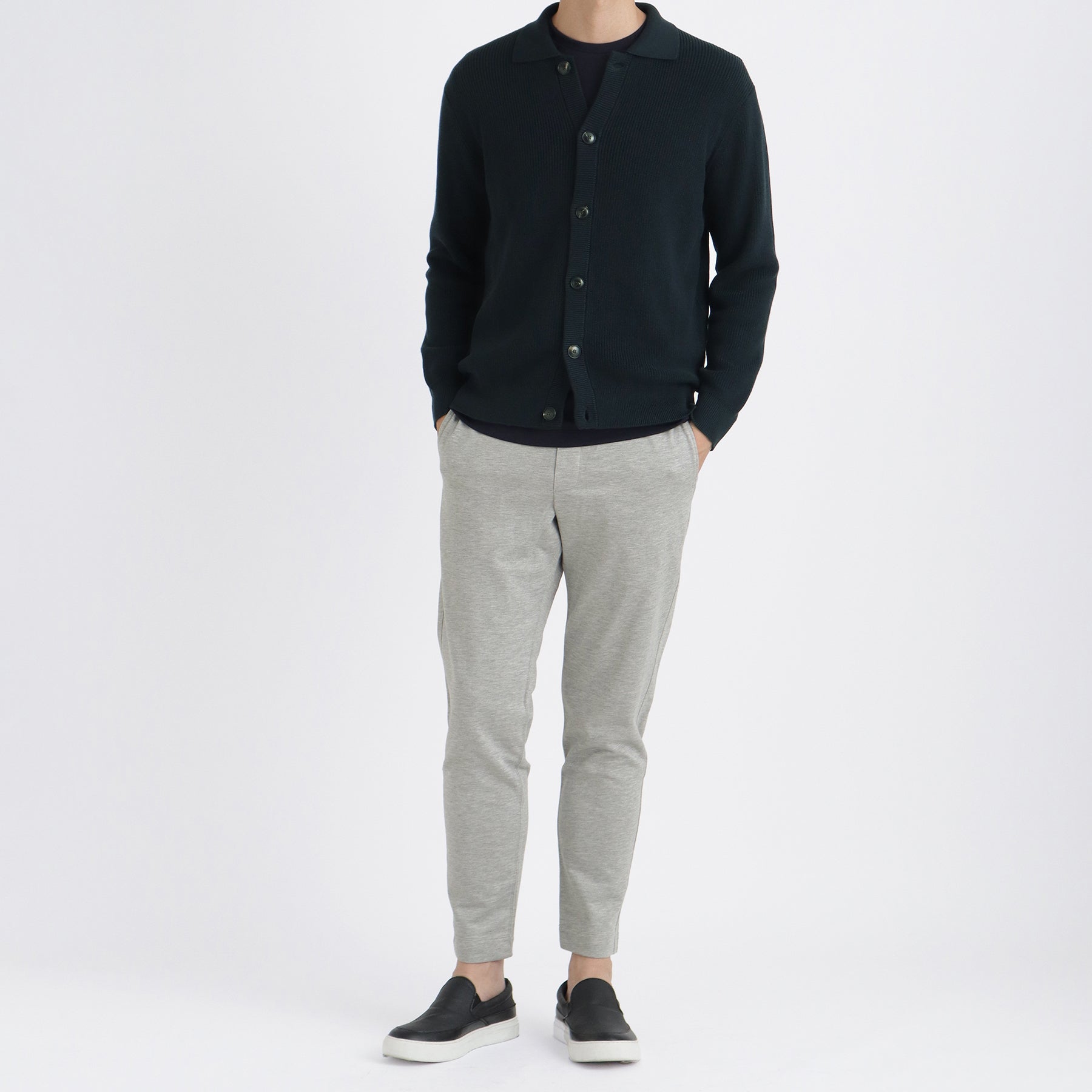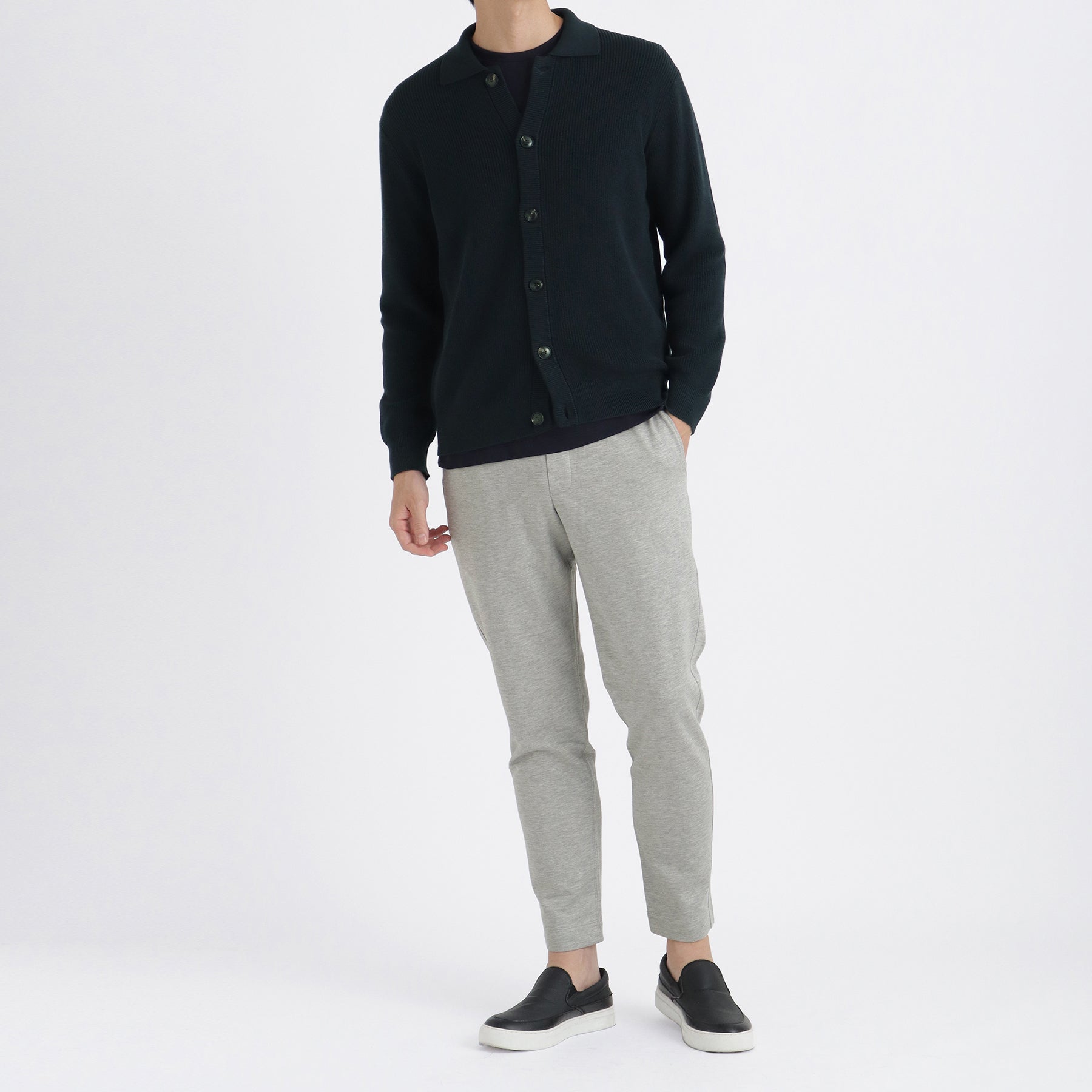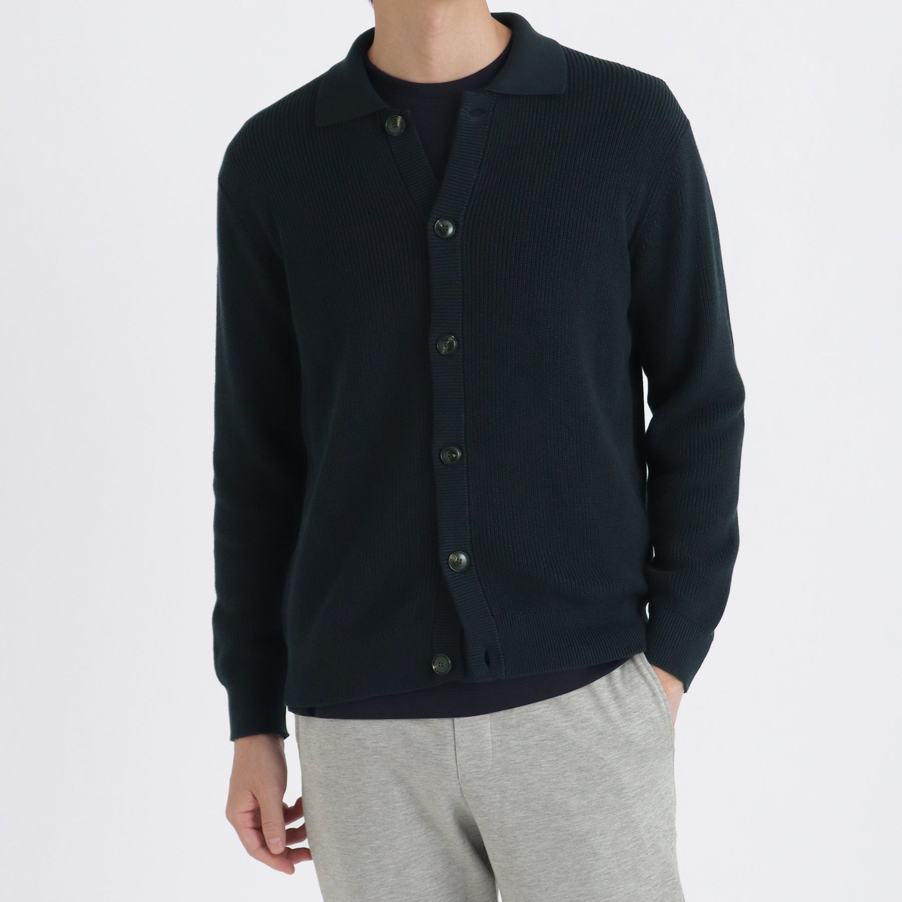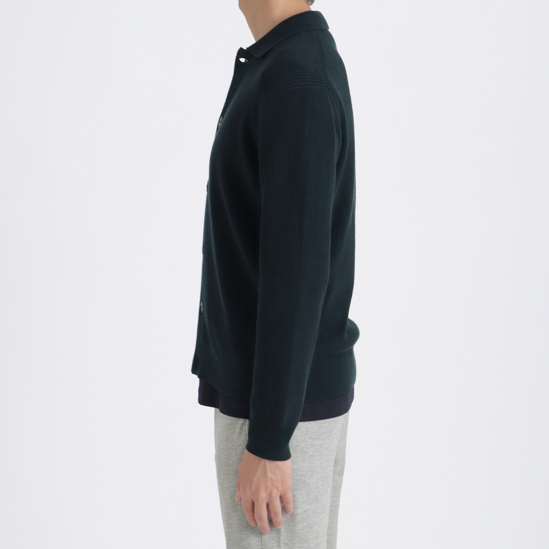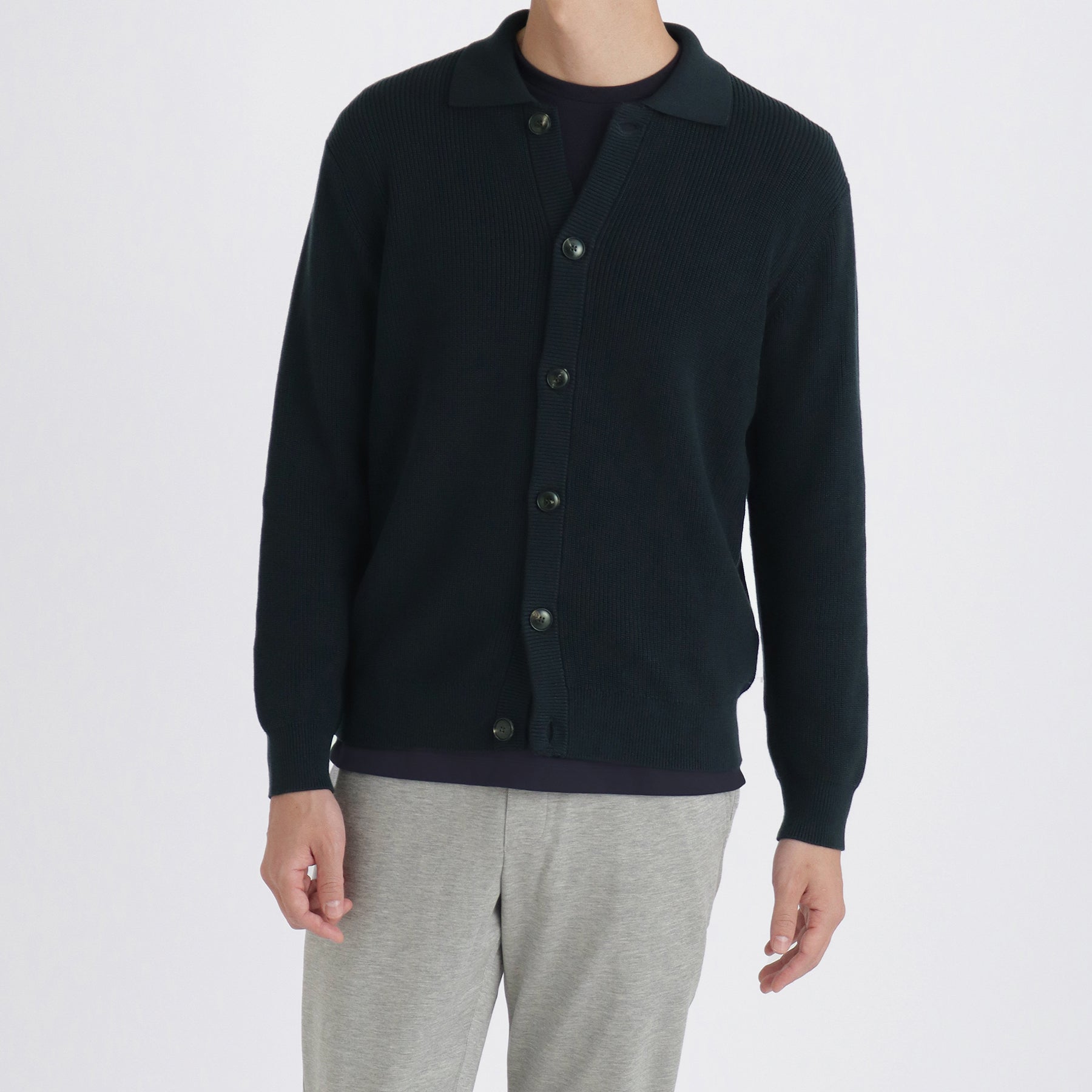 昨シーズン販売開始したスビンプラチナムニットの 新ライン、ミドルゲージコレクション。繊細でなめらかなタッチが人気のスビンプラチナムをミドルゲージ編み機でこれまでにない表面感に作りあげました。アウターとしてもコートなどのインナーとしても着用できる汎用性の高いエリ付きニットカーディガンです。