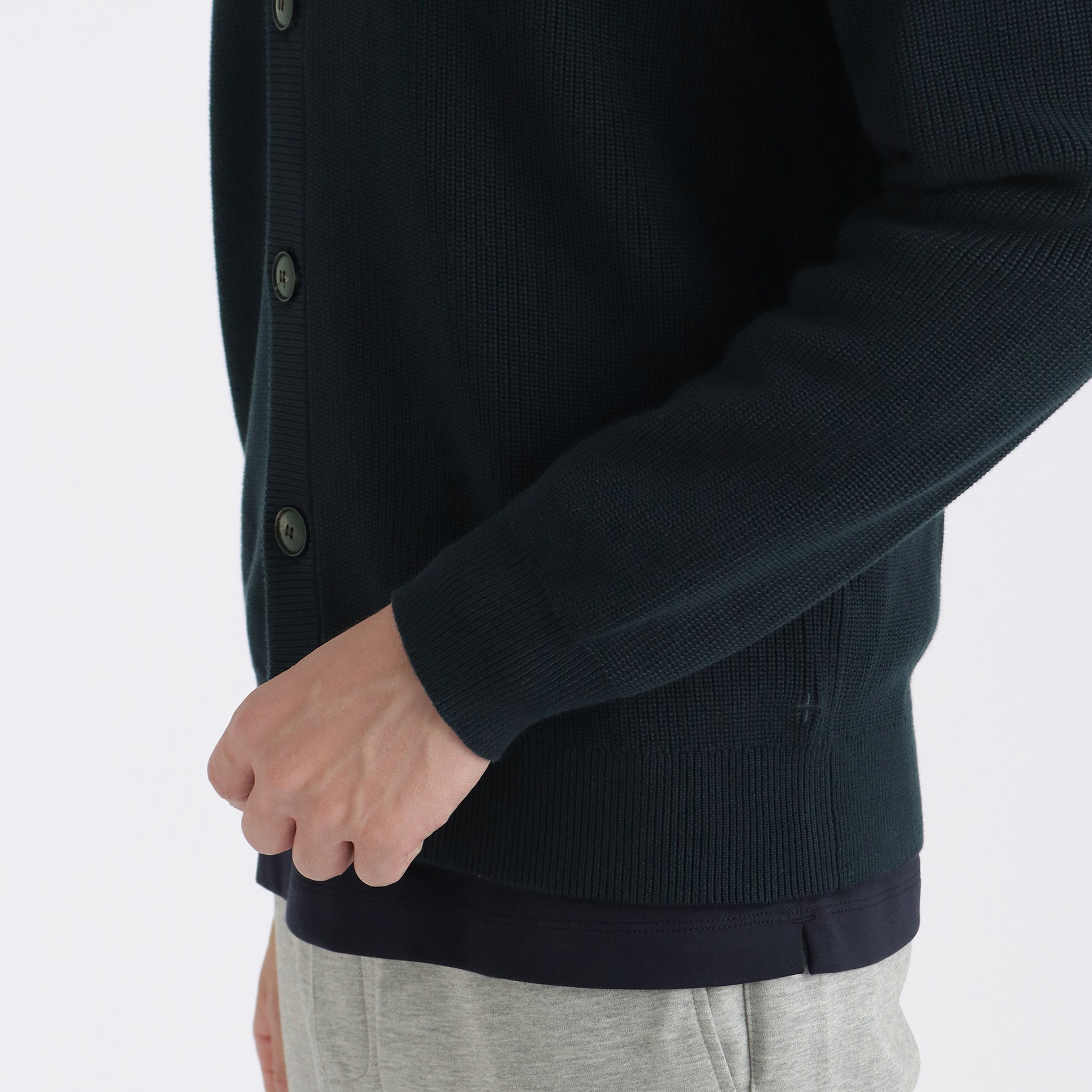+CLOTHET では一般的なニットでは作製しない型紙を作ることから始めます。筋肉の流れやニットの特性を踏まえ、体の動きを検証することで動きやすくもごわつかない着心地とシルエットを実現しています。生地を裁断せず、ニットならではのリンキングという手法を用いています。左裾には+CLOTHETであることを示す+マークが入っています。