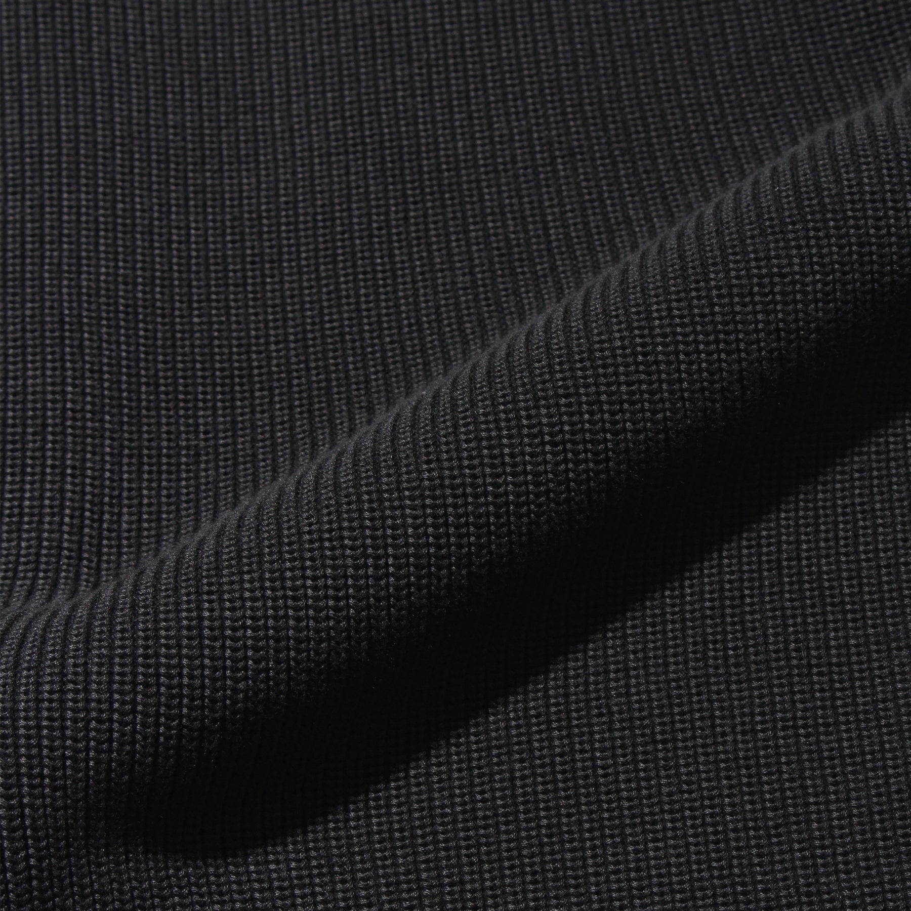 +CLOTHET では一般的なニットでは作製しない型紙を作ることから始めます。筋肉の流れやニットの特性を踏まえ、体の動きを検証することで動きやすくもごわつかない着心地とシルエットを実現しています。生地を裁断せず、ニットならではのリンキングという手法を用いています。左裾には+CLOTHETであることを示す+マークが入っています。