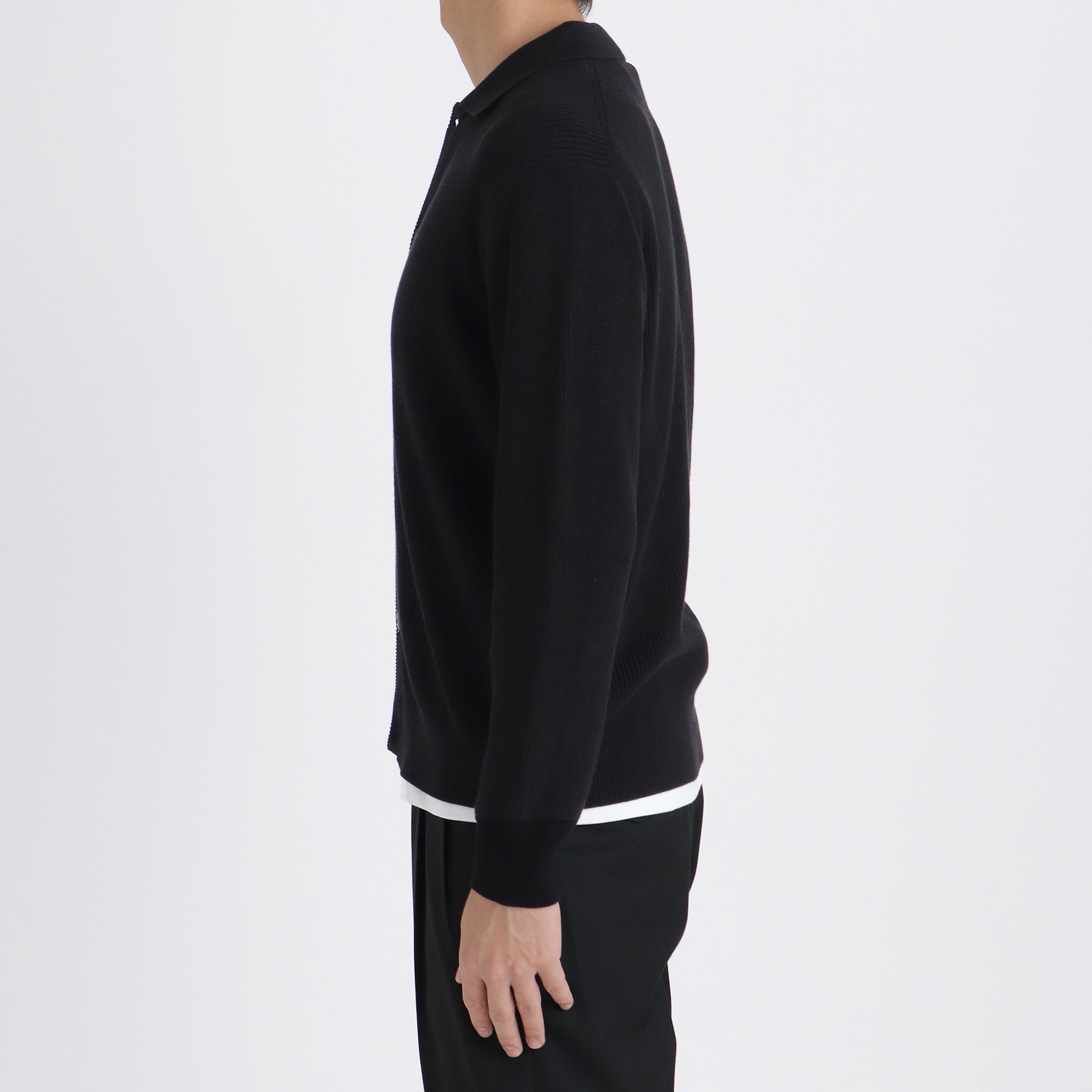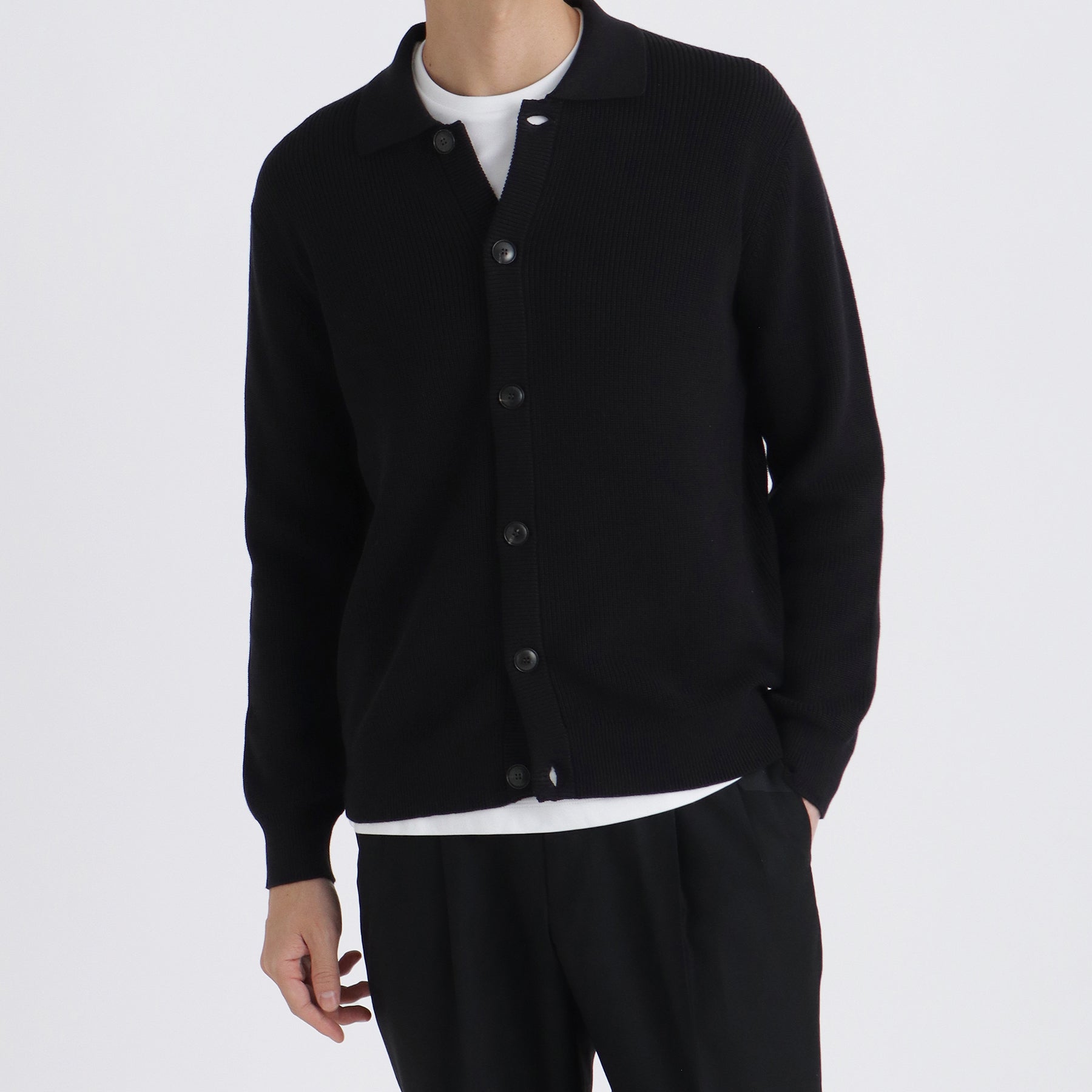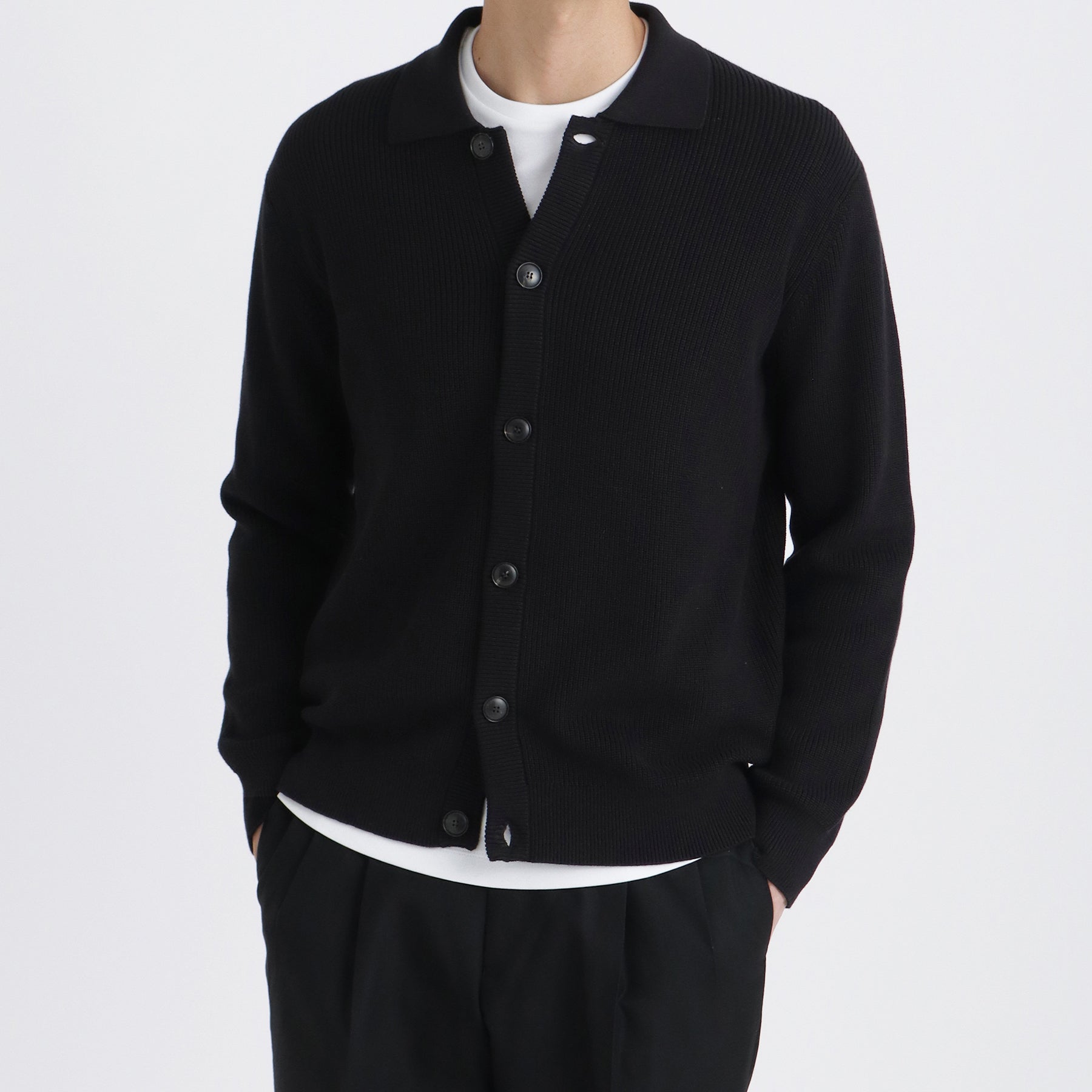 昨シーズン販売開始したスビンプラチナムニットの 新ライン、ミドルゲージコレクション。繊細でなめらかなタッチが人気のスビンプラチナムをミドルゲージ編み機でこれまでにない表面感に作りあげました。アウターとしてもコートなどのインナーとしても着用できる汎用性の高いエリ付きニットカーディガンです。