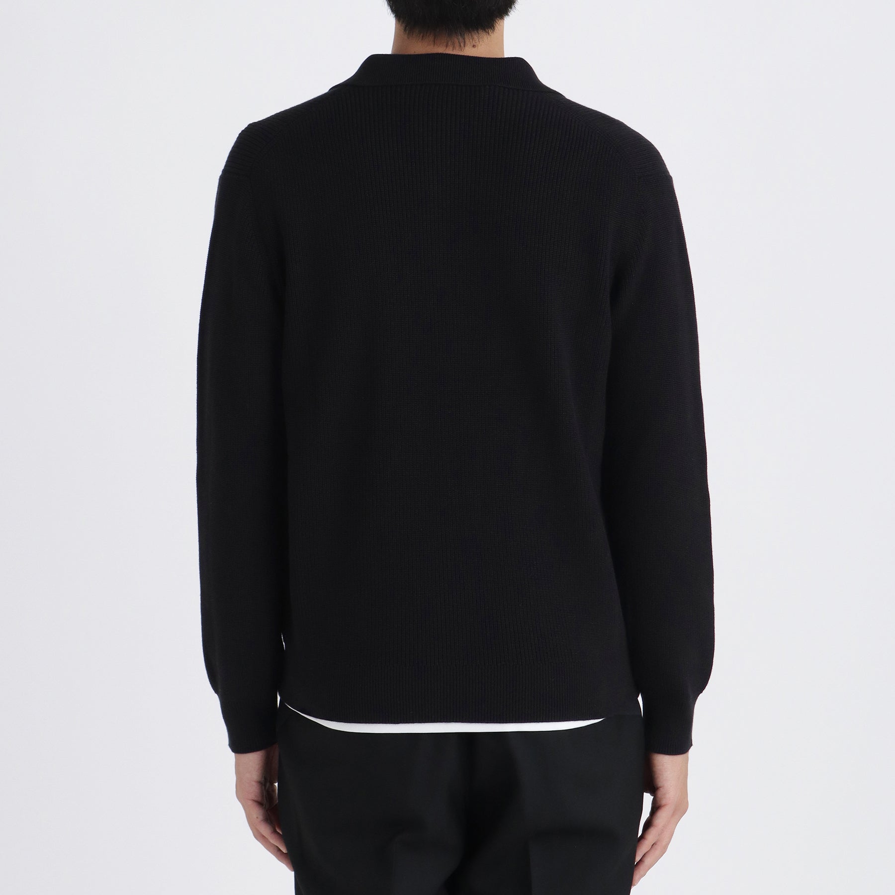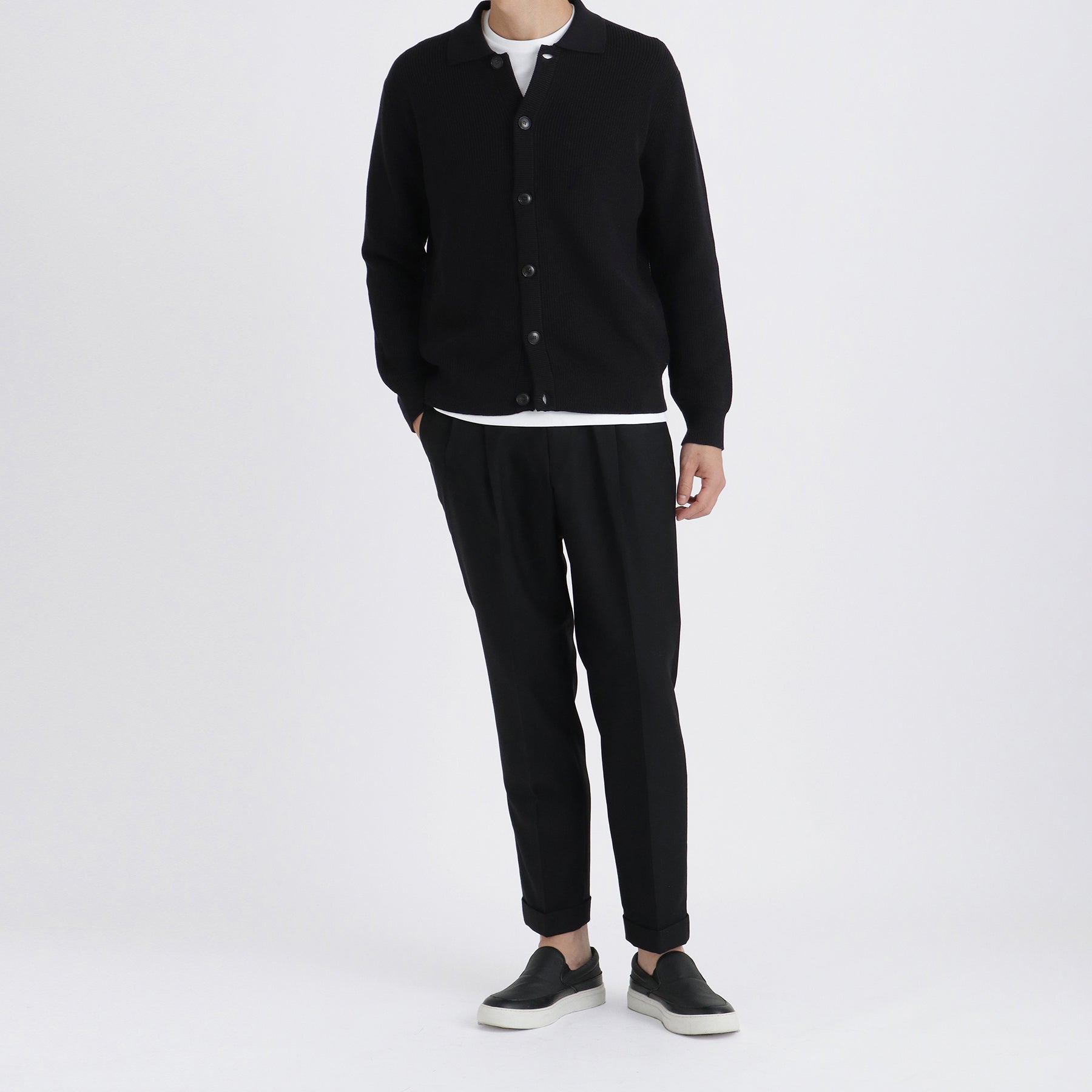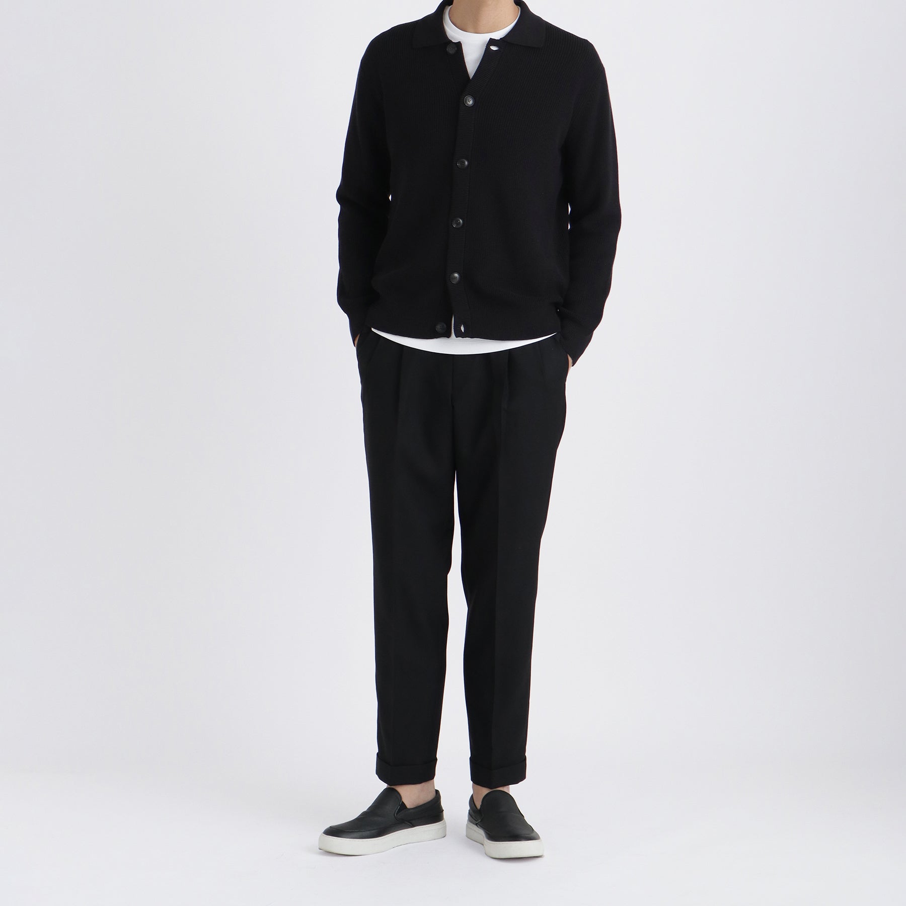 昨シーズン販売開始したスビンプラチナムニットの 新ライン、ミドルゲージコレクション。繊細でなめらかなタッチが人気のスビンプラチナムをミドルゲージ編み機でこれまでにない表面感に作りあげました。アウターとしてもコートなどのインナーとしても着用できる汎用性の高いエリ付きニットカーディガンです。
