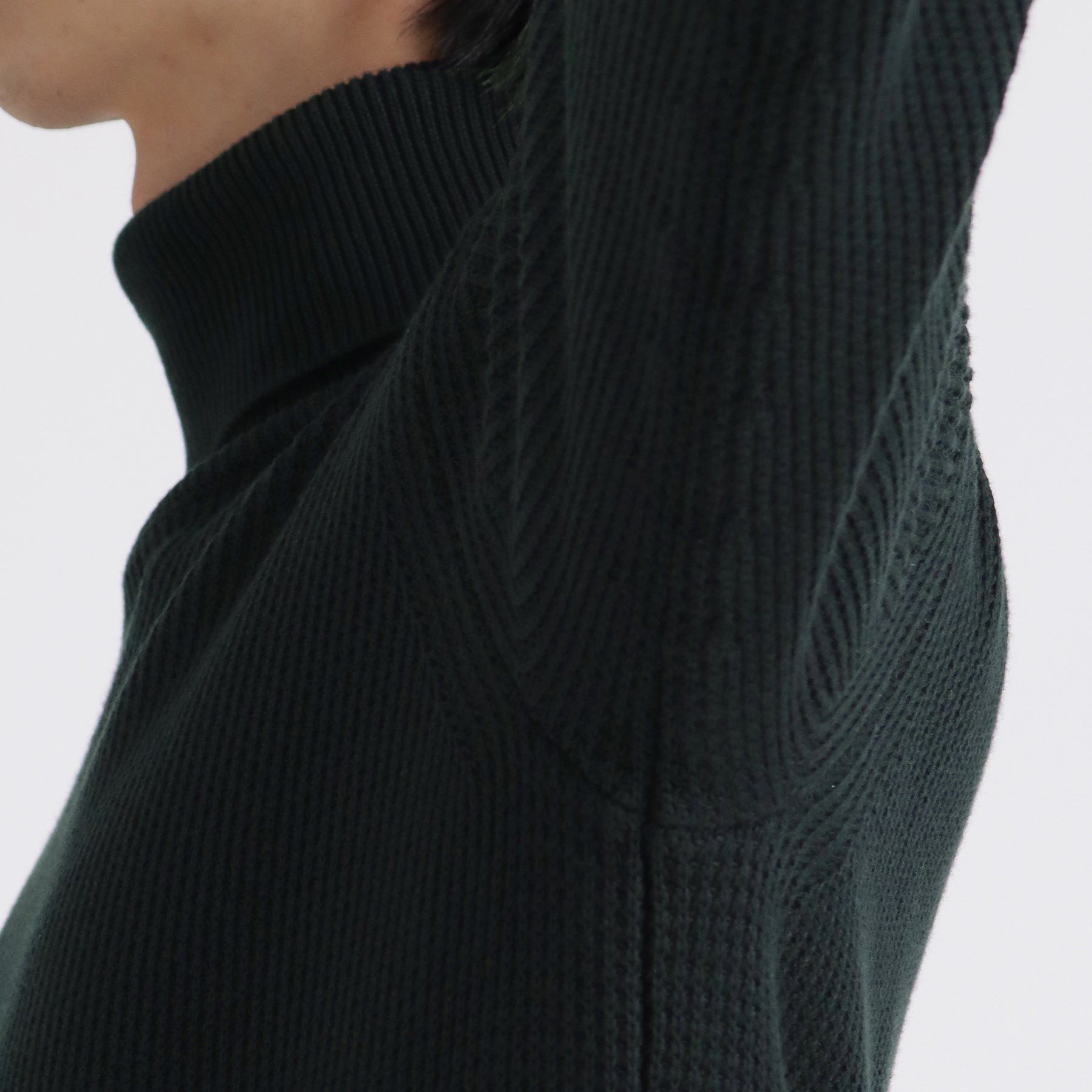 +CLOTHET では一般的なニットでは作成しない型紙を作ることから始め、人体のラインやニットの特性を考え、肩や腕周りの動きを見直すことで動きやすさを実現しています。 生地を裁断せず、ニットならではのリンキングという手法を用いています。