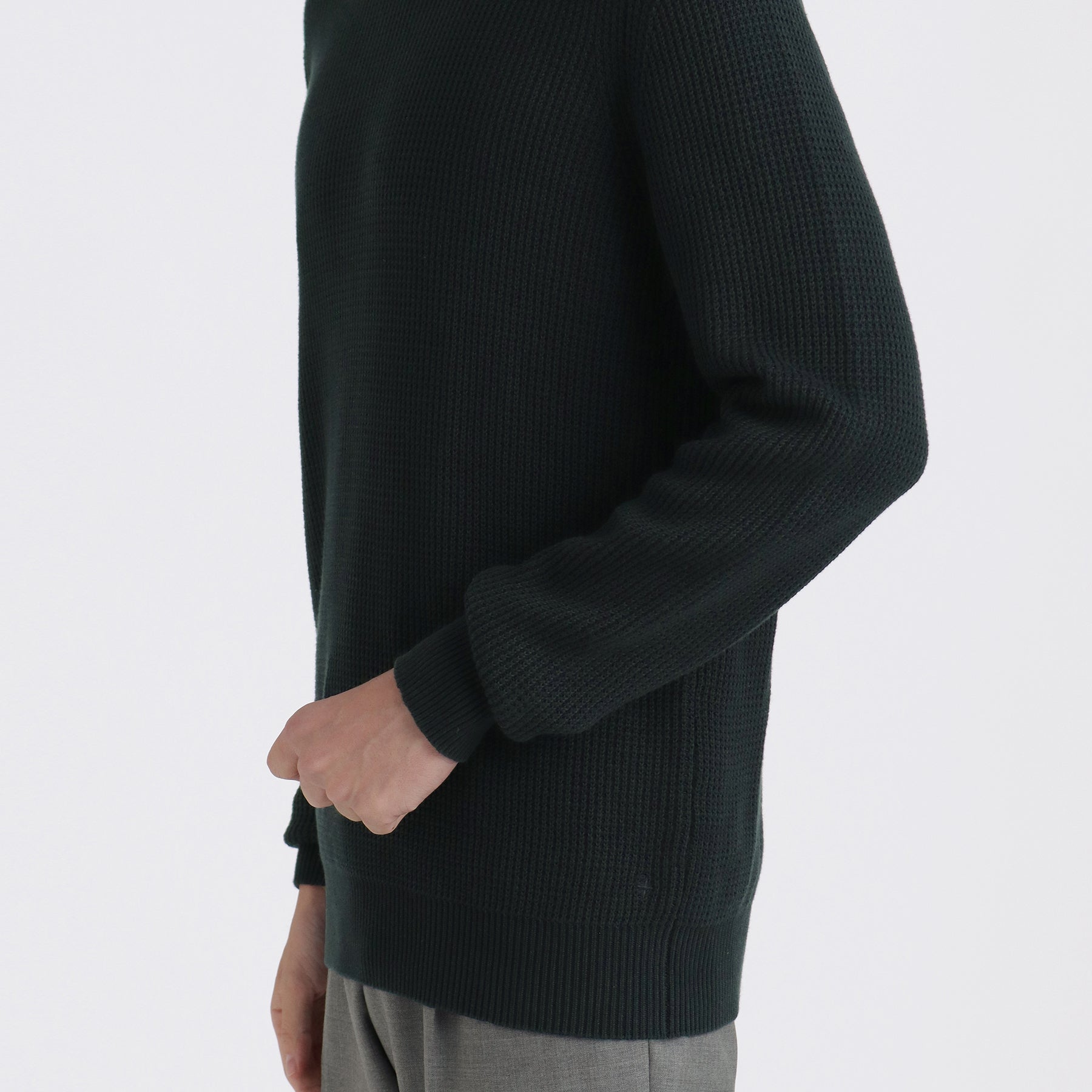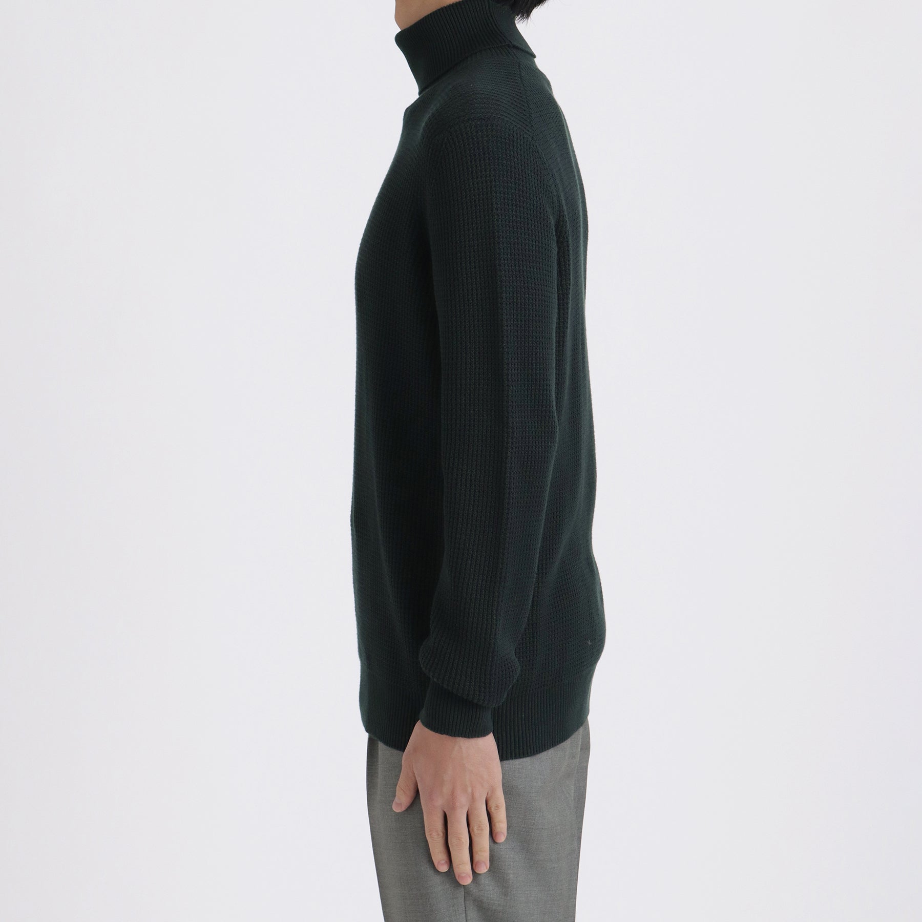 スビンプラチナムを使用したミドルゲージのタートルネックニット。編地はワッフル裏目の7ゲージを採用。スビンプラチナムならではの編み目の綺麗さや肌触りでソフトで上品な印象に。ミドルゲージで重厚な見た目ながらも柔らかな仕上がりになっています。1枚での着用はもちろんコートやブルゾンとのコーディネートでも映える雰囲気のある一着です。ミドルゲージニットはシンプルながらも存在感のあるルックスはデイリーウェアとしておすすめです。