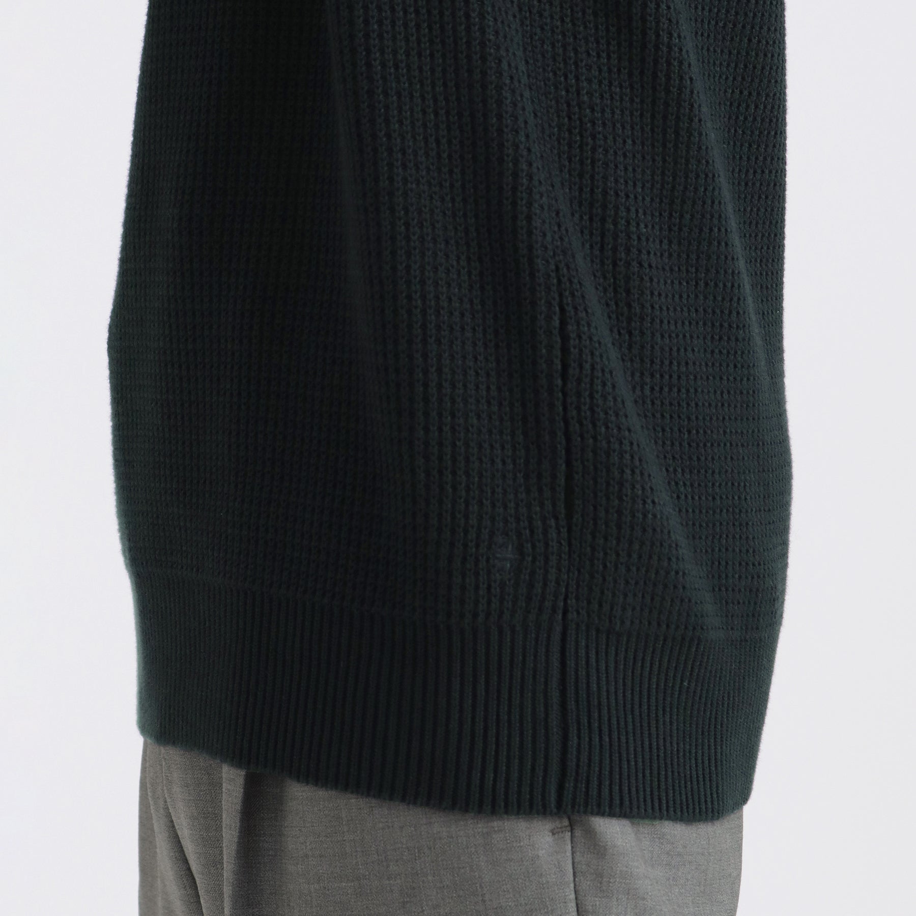 クロスクローゼットのニットの特長として、脇や袖下の設計を目立て内減らしにしています。(写真の白枠部分)減らし目により編み目が飛んでいるように見えますが、シルエットや編み目を美しく仕上げるデザインの一部となります。