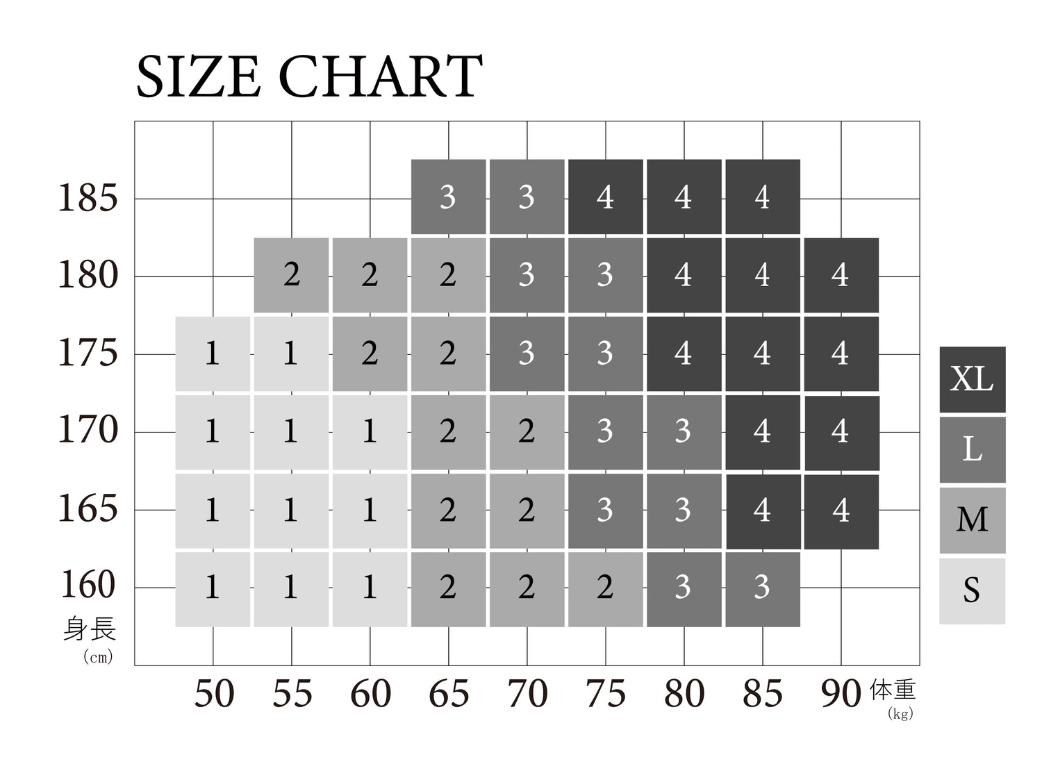| Size | 1 (S) | 2(M) | 3(L) | 4(XL) |