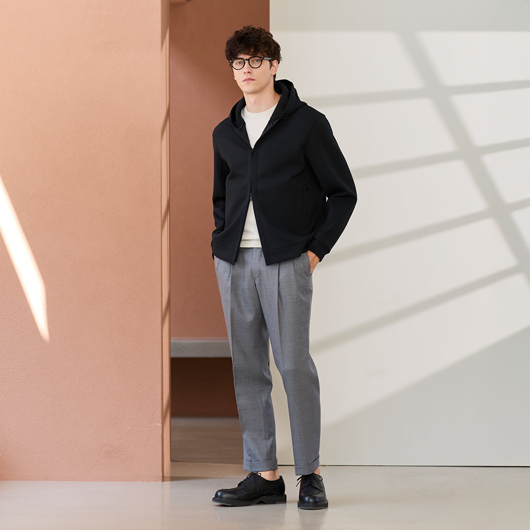 シルクに最も近い合成繊維であるトリアセテート混の新感覚素材「トリアセテートスキューバージャージ」を使ったフーディの登場です。素材の特長である光沢感、膨らみ、ストレッチ性を兼ね備えており、デイリー使いはもちろん、スタイリング次第でドレスアイテムとの組み合わせも可能な万能アイテムです。