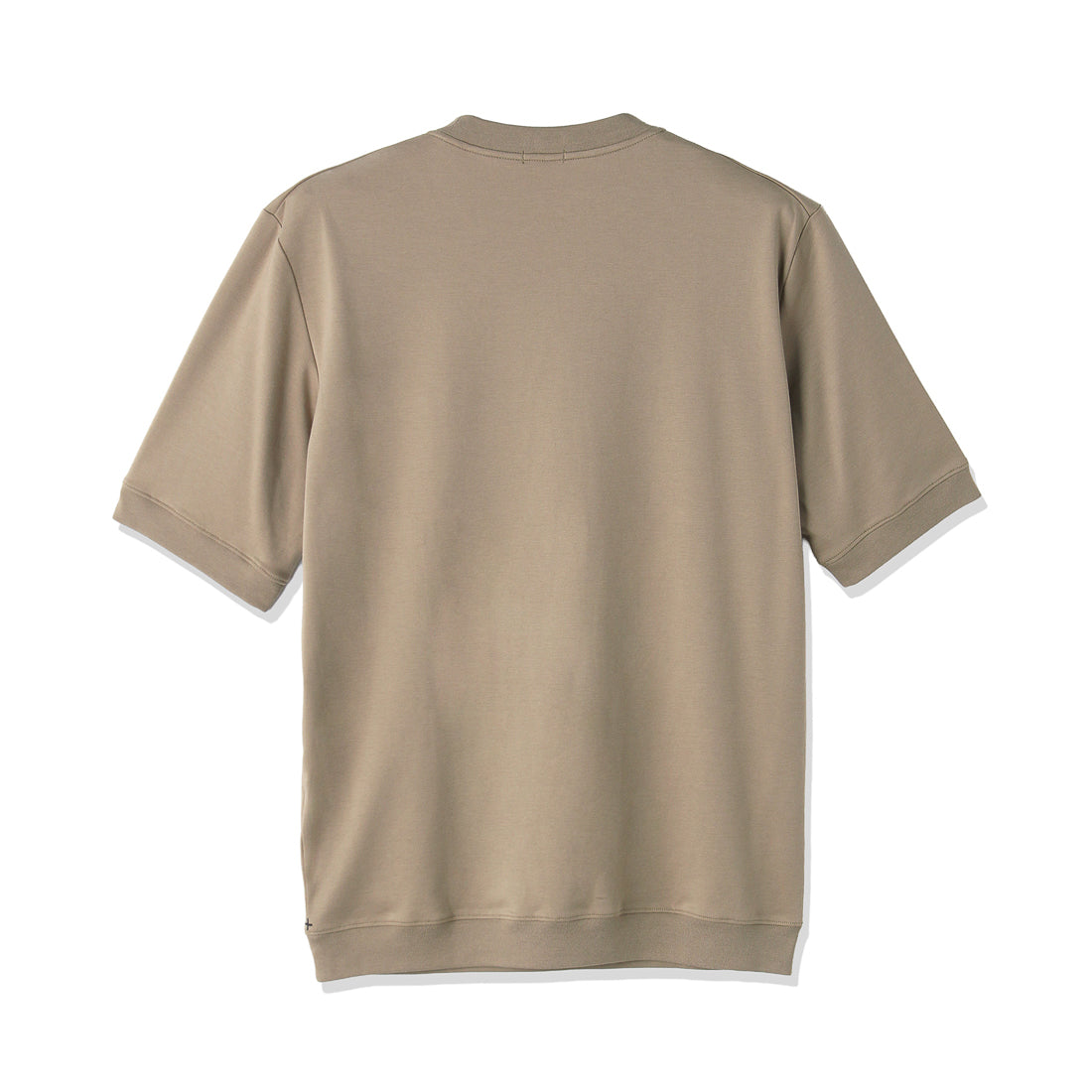 袖口、裾にリブを配置することでTシャツ以上、ニット未満なアイテムとしてカットソーのイージーさとニットのエレガントさを併せ持ったTシャツになります。腕が前に出しやすいよう立体的に作られたアームホールに対して袖を前振りにしています。また肩線をずらし、肩や袖山にイセを入れることで体に沿わせながら可動域を広げる設計にもなっています。袖山を高くしているので1枚でもジャケットの下でもごわつかずにすっきりとお召しいただけます。左脇には+CLOTHETであることを示す+マークが配色で入っています。