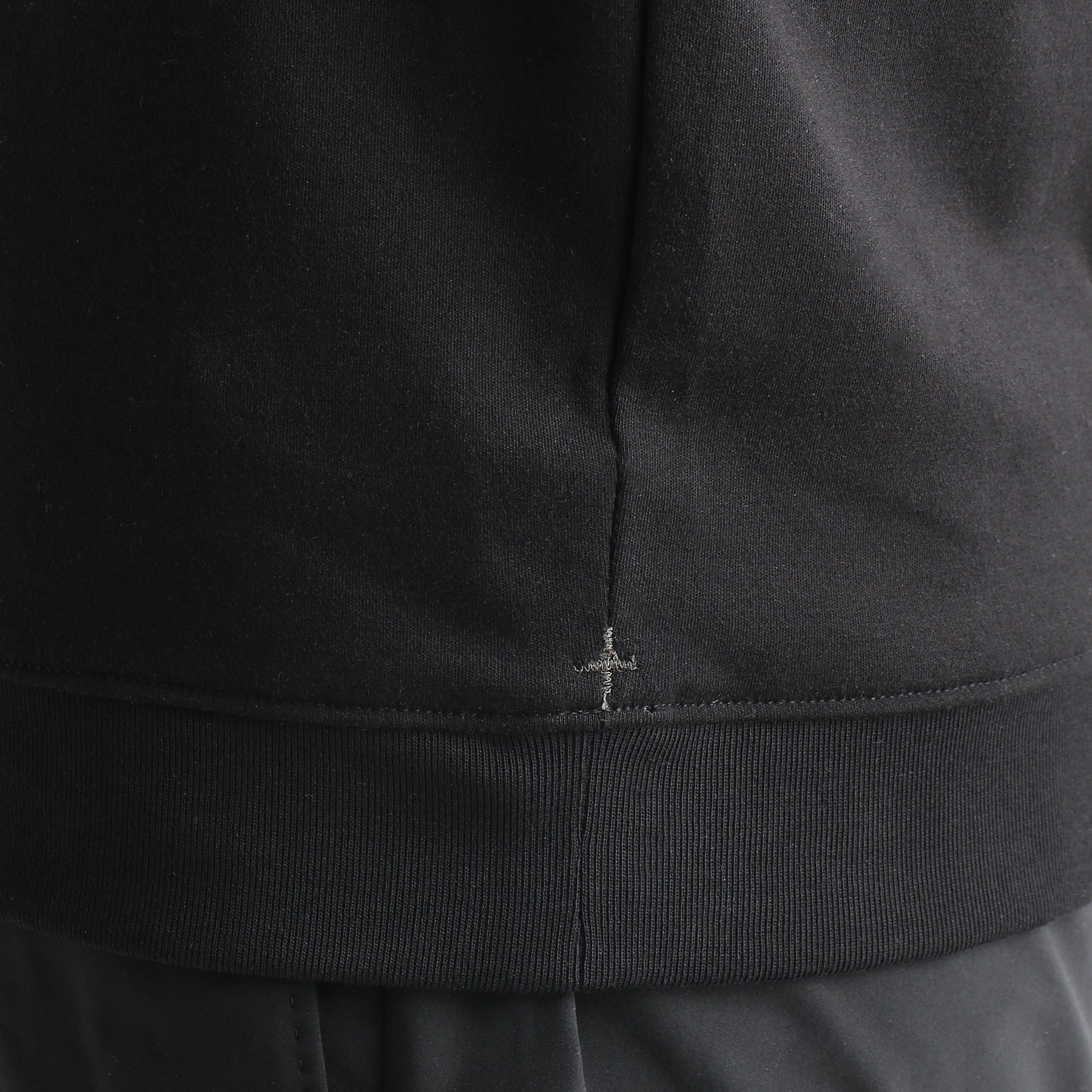 袖口、裾にリブを配置することでTシャツ以上、ニット未満なアイテムとしてカットソーのイージーさとニットのエレガントさを併せ持ったTシャツになります。腕が前に出しやすいよう立体的に作られたアームホールに対して袖を前振りにしています。また肩線をずらし、肩や袖山にイセを入れることで体に沿わせながら可動域を広げる設計にもなっています。袖山を高くしているので1枚でもジャケットの下でもごわつかずにすっきりとお召しいただけます。左脇には+CLOTHETであることを示す+マークが配色で入っています。