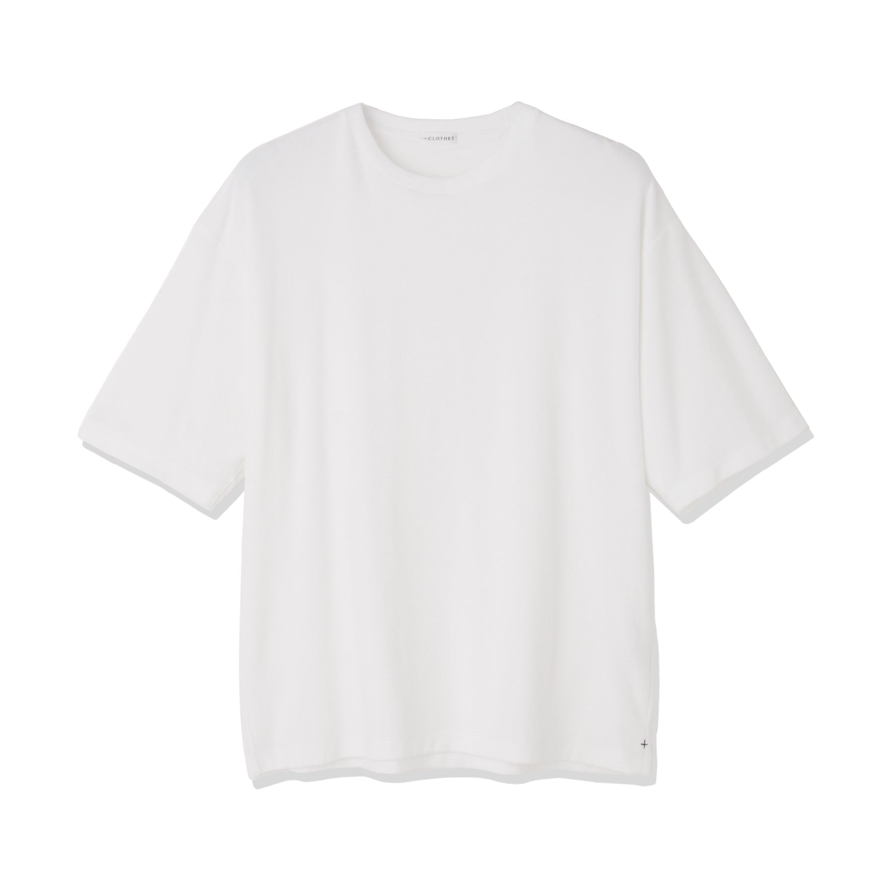 立体的に作られたアームホール形状は残しながらも、イセなどのテーラー要素を無くしたことでテーラードTシャツとは違った着心地に仕上げています。またミドルスウェットシャツと同じサイズ感にすることで外着としてはもちろん、家の中でも着ていただけるアイテムとなっています。左脇スリットには+CLOTHETであることを示す+マークが配色で入っています。