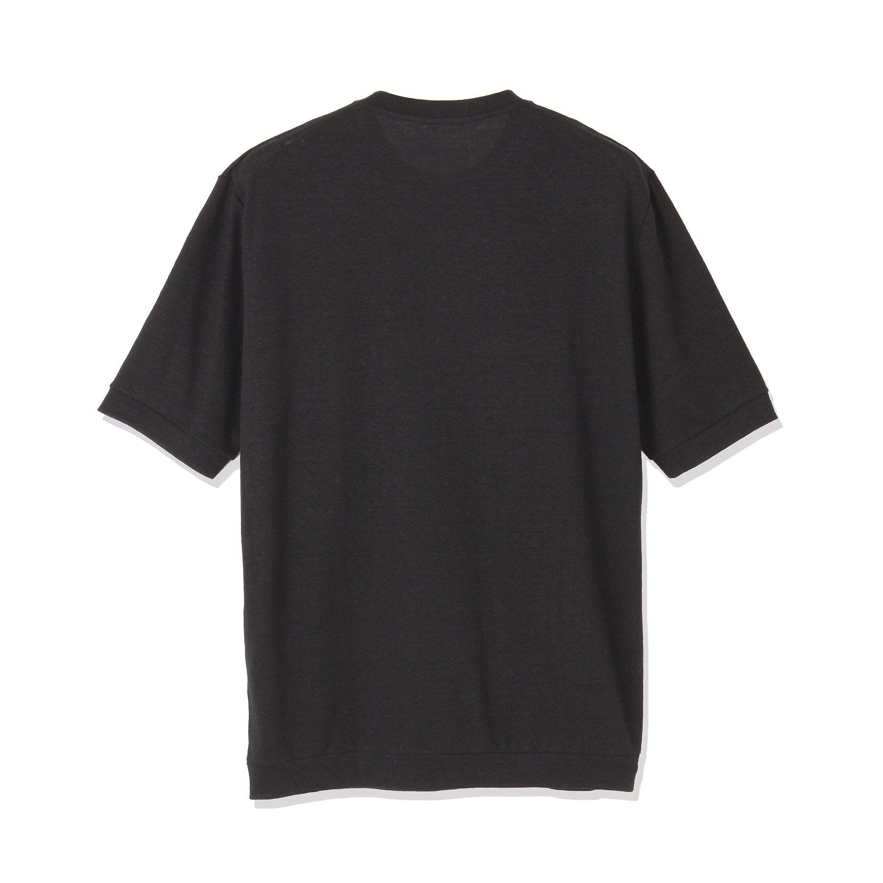 袖口、裾を切り替えてニットのような見え方にしています。Tシャツ以上、ニット未満なアイテムとしてカットソーのイージーさとニットのエレガントさを併せ持ったTシャツになります。腕が前に出しやすいよう立体的に作られたアームホールに対して袖自体を前振りにしています。また肩線をずらし、肩や袖山にイセを入れることで体に沿わせながら可動域を広げる設計にもなっています。左脇には+CLOTHETであることを示す+マークが配色で入っています。