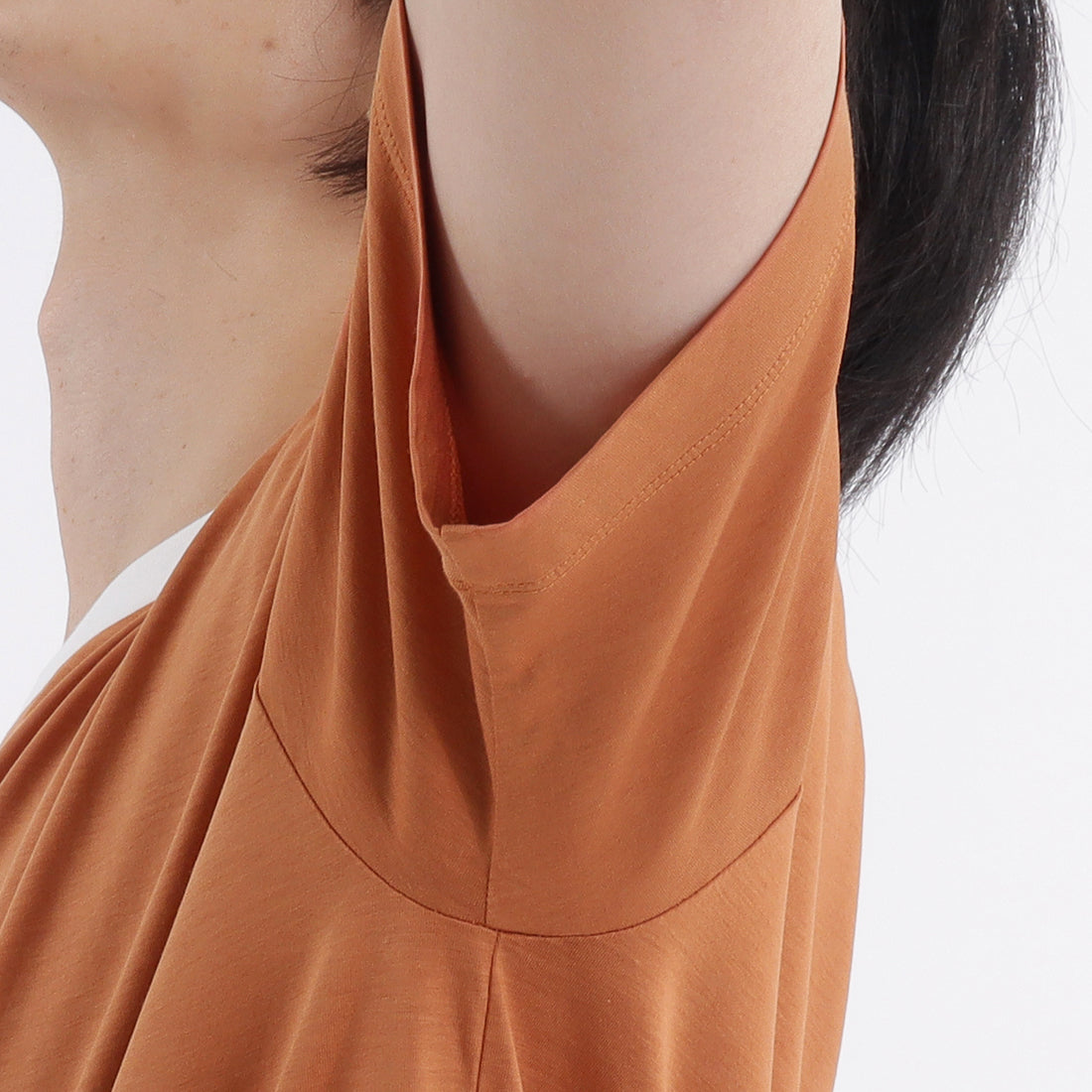 インド産超長綿と光沢感、ドレープ感が特長のマイクロビスコースレーヨンを組み合わせて紡績したオリジナル原料を使用しています。出来上がった糸をさらに追撚、ガス焼きすることでハリ感、接触冷感性も兼ね備わった素材が完成しました。