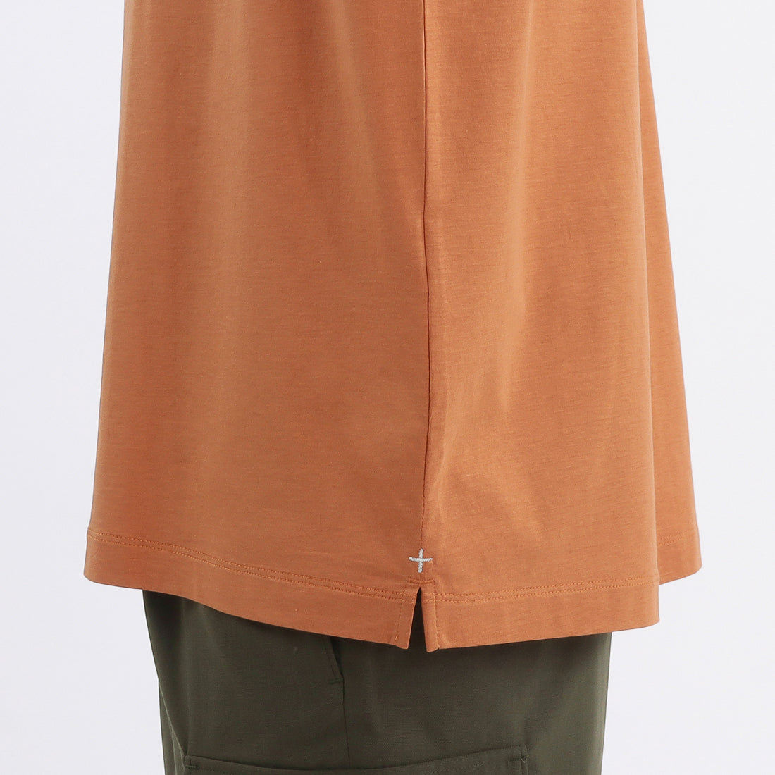 素晴らしい生地にも関わらず市場・環境の変化など様々な理由で使用されることのない生地。また、生産途上で発生する余剰生地。こうした生地に新たな価値を生み出し、お客様に喜びを提供すると同時にロスの削減を目指す。その想いを持ってスタートした「THE LIMITED EDITION」シリーズ。強撚糸による接触冷感性と、ビスコースレーヨンの持つドレープ感を兼ね備えた生地を使って、ブランド初のリンガーネックデザインに落とし込みました。