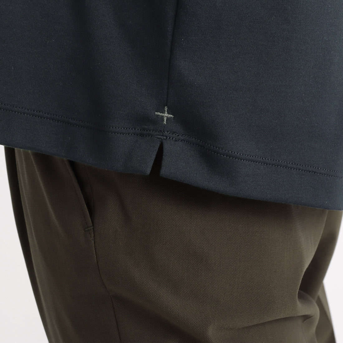 形はリラックス感のあるオーバーサイズでリニューアルしたBIG Tシャツをベースにしています。首のラインが綺麗に見える襟の高さや締めすぎない広さなどミリ単位で調整。前より後の着丈を長くすることで身体を包み込むような丸みを出すシルエットになっています。