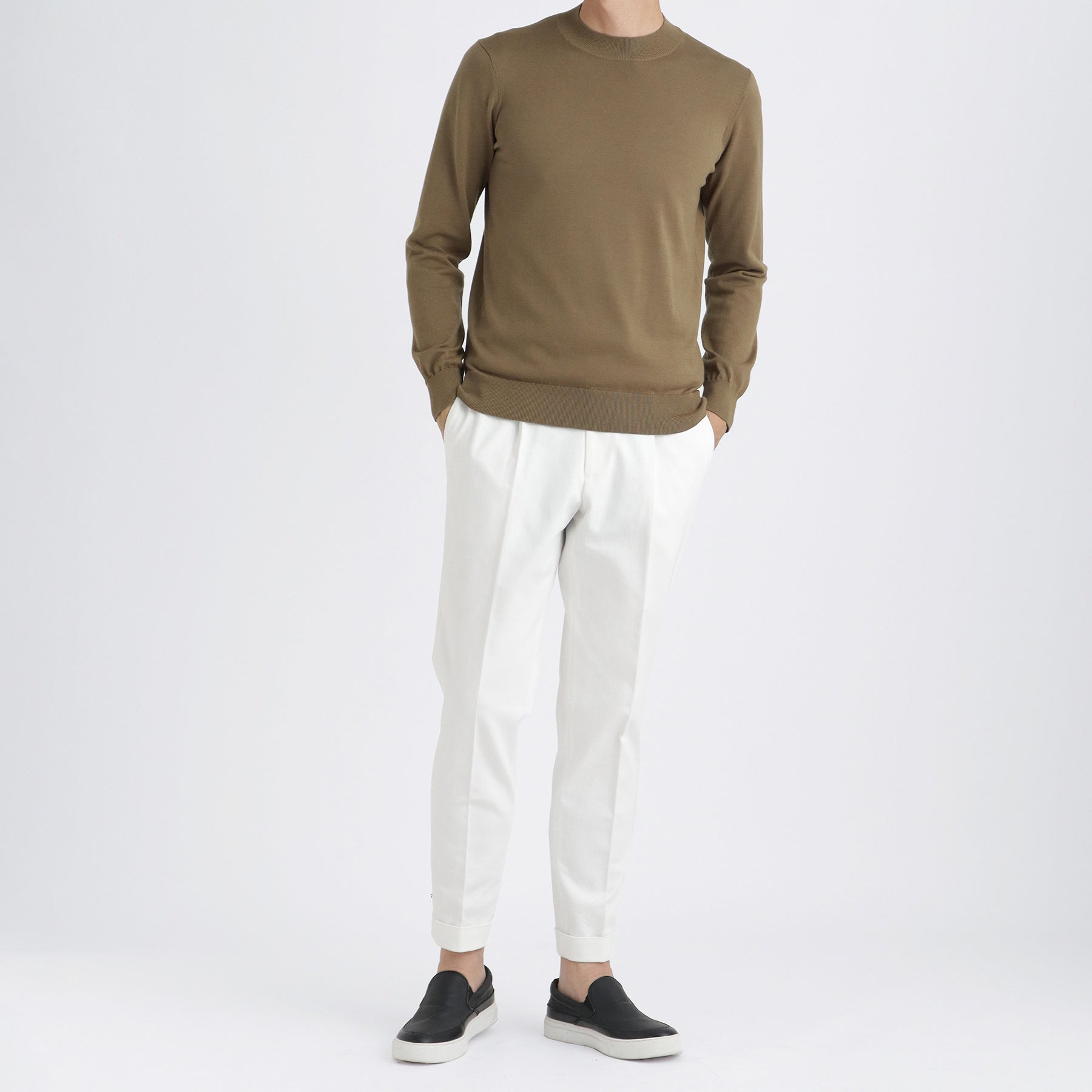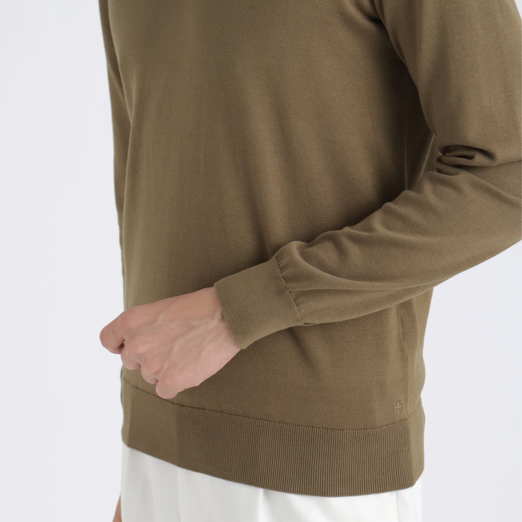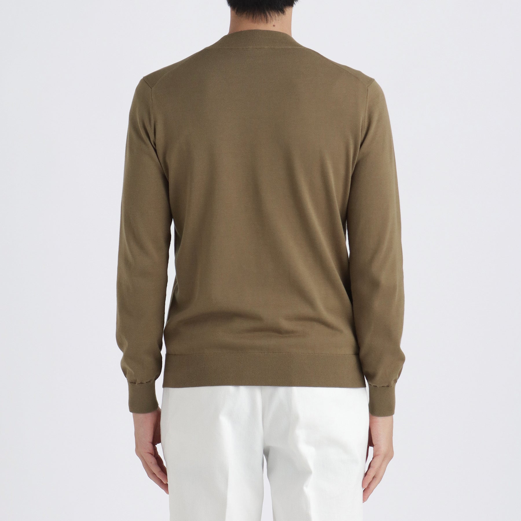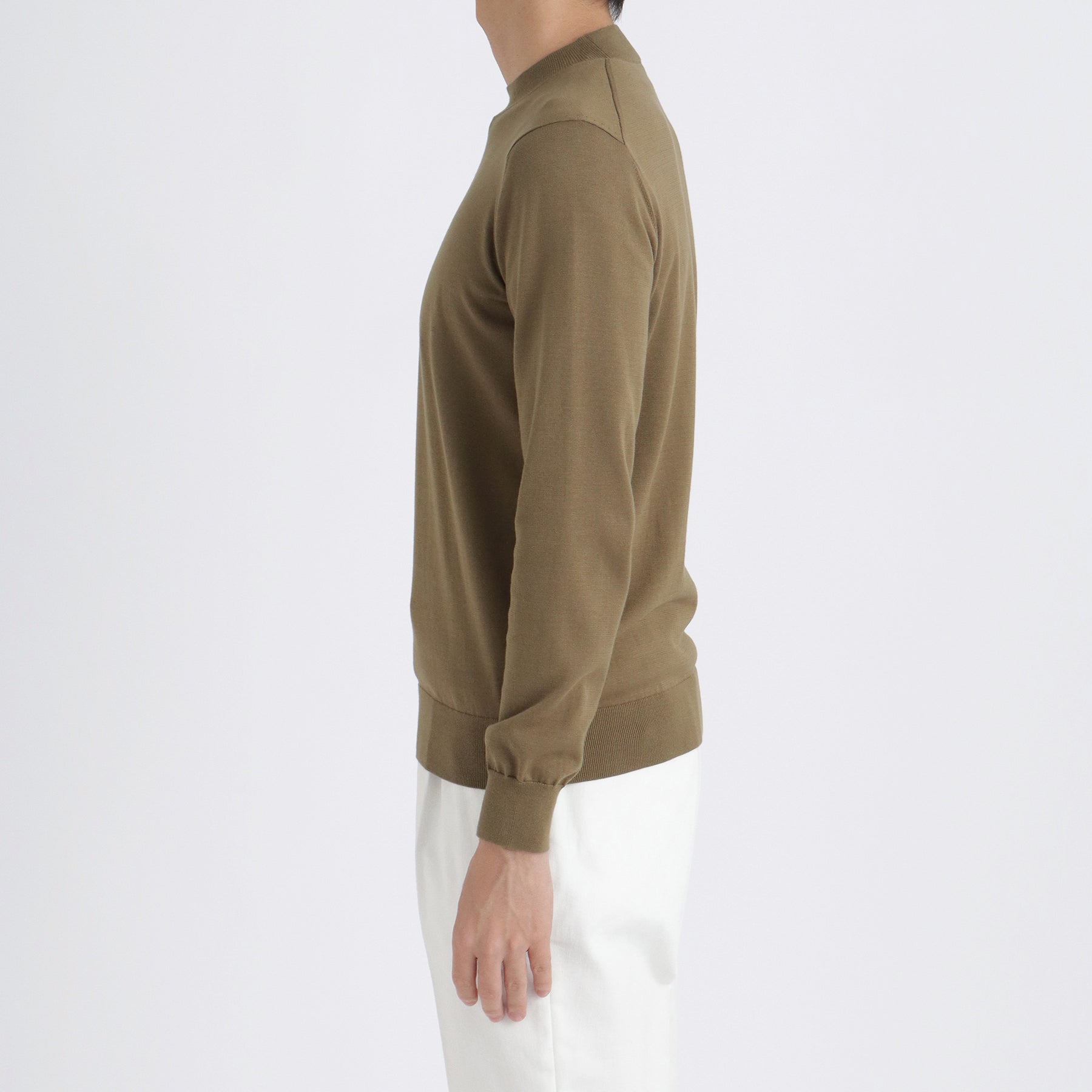 スビンプラチナムニットシリーズの中でも特に人気のモックネックに新色、フォーンとオークが登場です。どんなスタイルにも馴染みながら、さりげないアクセントとなるカラーに仕上がりました。最大の特長である首元部分の仕様・デザインにこだわり抜いた1着はジャケットやブルゾンのインナーに使うことでエレガントな印象にすることができます。