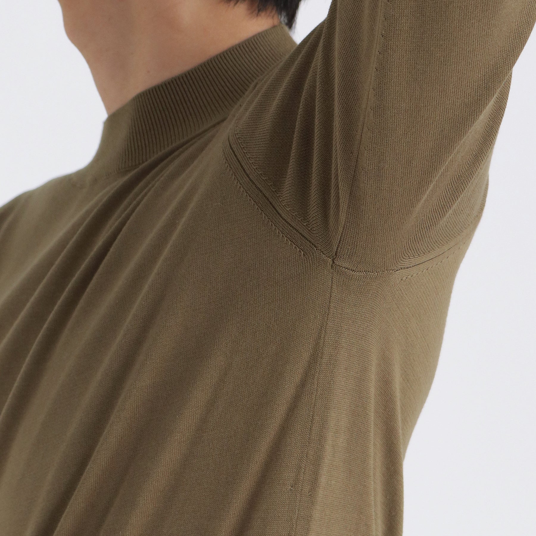 モックネックのポイントである首元がへたらないように編地の詰め具合を調整。衿の高さにもこだわることでエレガントな表情に仕上がっています。また首が長く見えることで小顔に見える視覚的効果もあります。左裾には+CLOTHETであることを示す+マークが入っています。