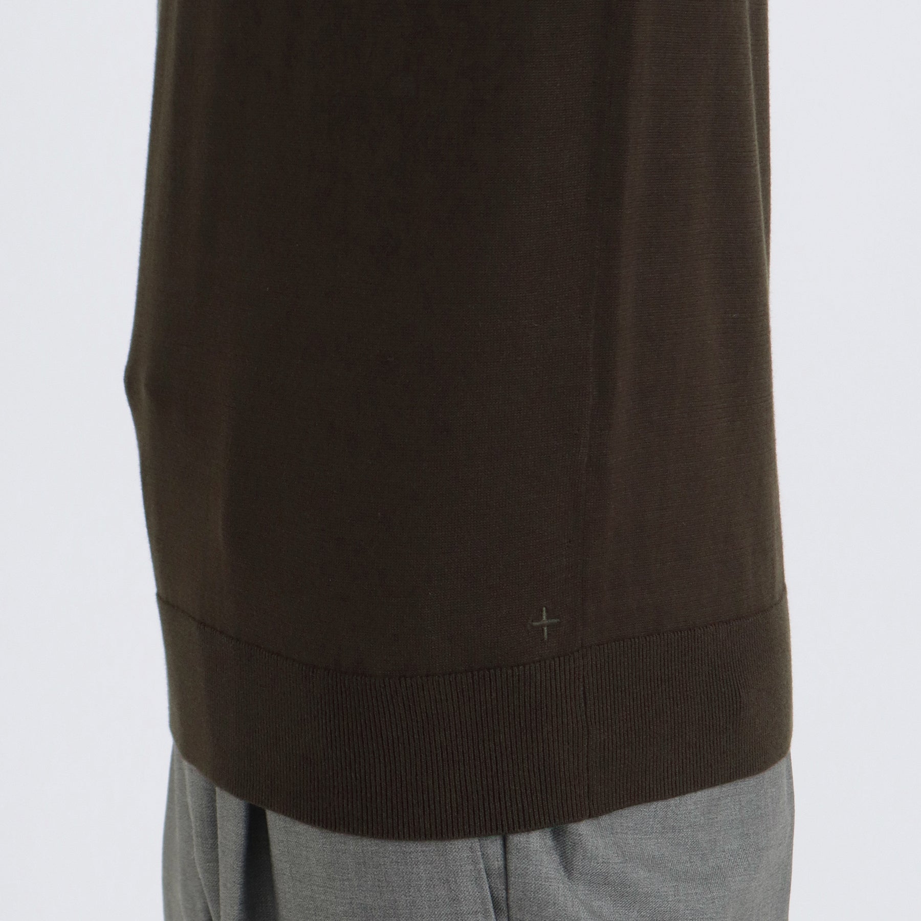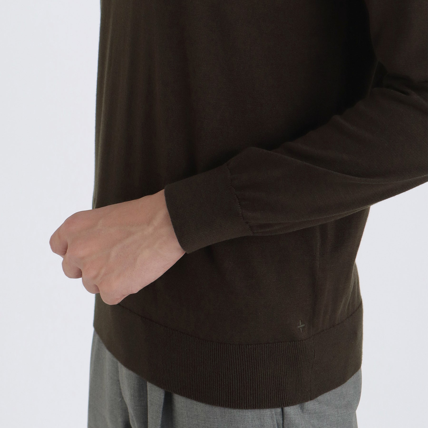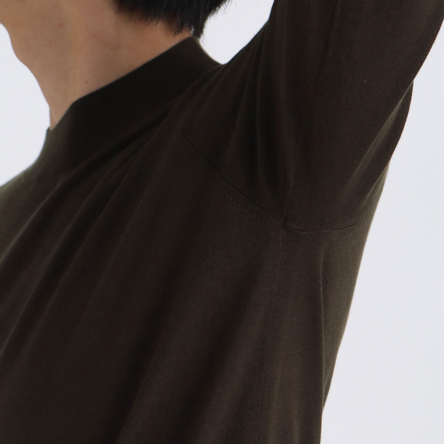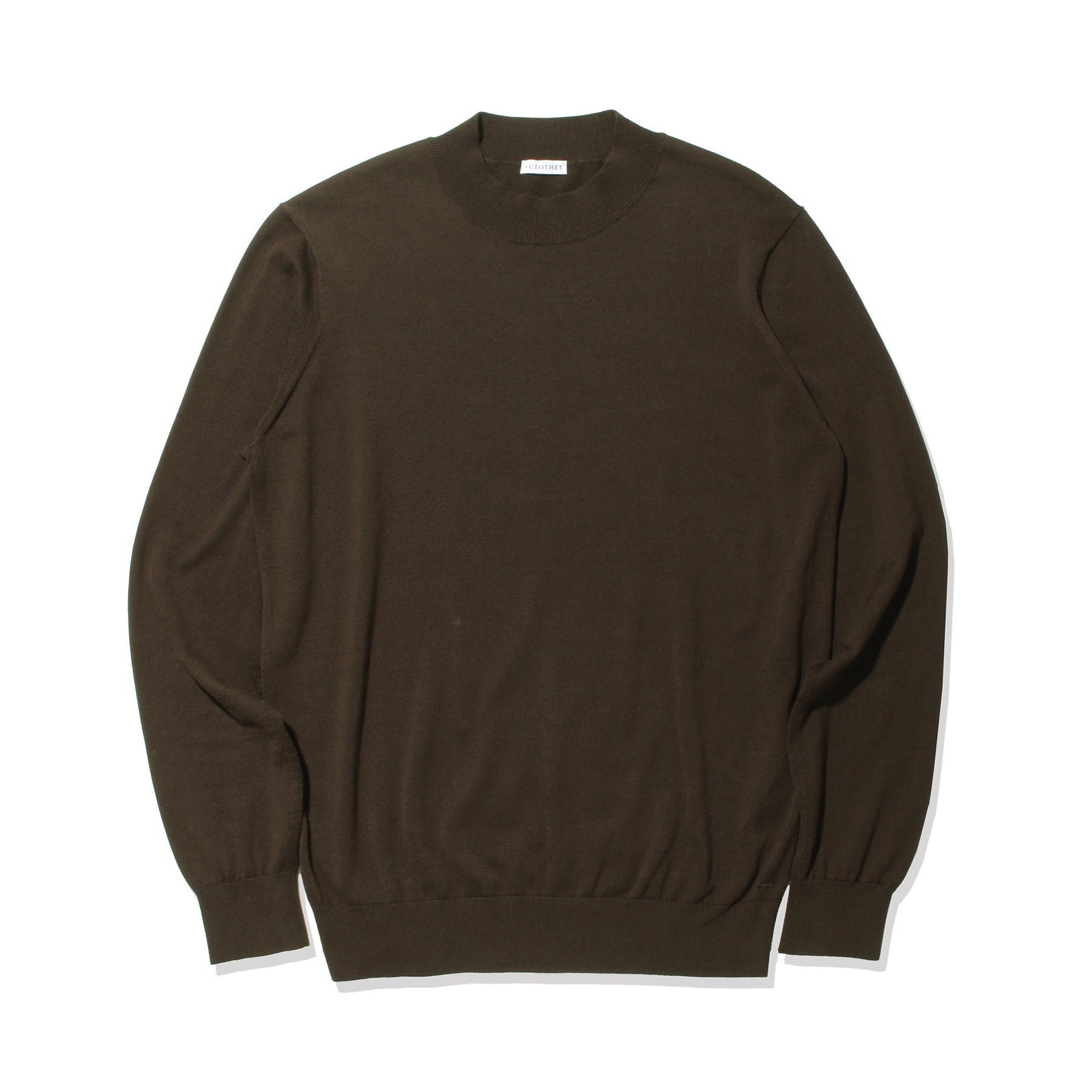 モックネックのポイントである首元がへたらないように編地の詰め具合を調整。衿の高さにもこだわることでエレガントな表情に仕上がっています。また首が長く見えることで小顔に見える視覚的効果もあります。左裾には+CLOTHETであることを示す+マークが入っています。