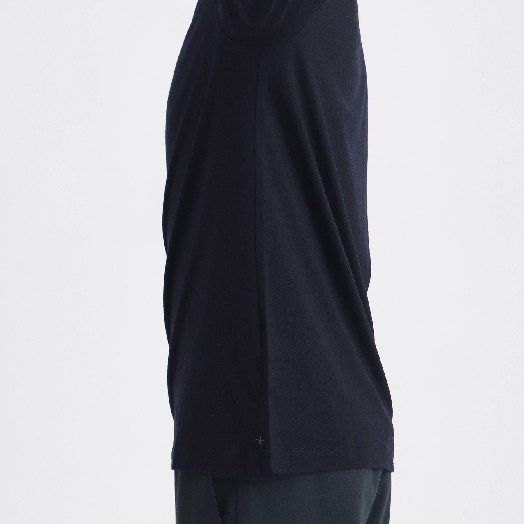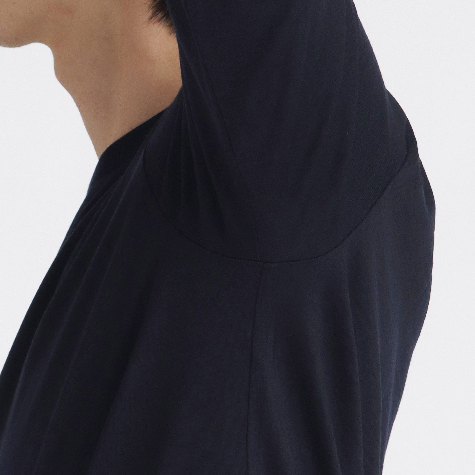 スビンプラチナムのロングスリーブTシャツと同じようにサイズは変えずに前身頃は狭く、後身頃を広くして全体のバランスを調整。また前後身頃のバランスを変えたことに関連してアームホールの形状も調整。今まで以上に可動域が広がったため腕が動かしやすくなりました。従来では後肩にイセと言われるテーラードの手法を取り入れていましたが今回は後肩に対して前肩を伸ばすという手法を採用。これにより肩と首の間が体と綺麗に沿うようになっています。左脇スリットには+CLOTHETであることを示す+マークが配色で入っています。